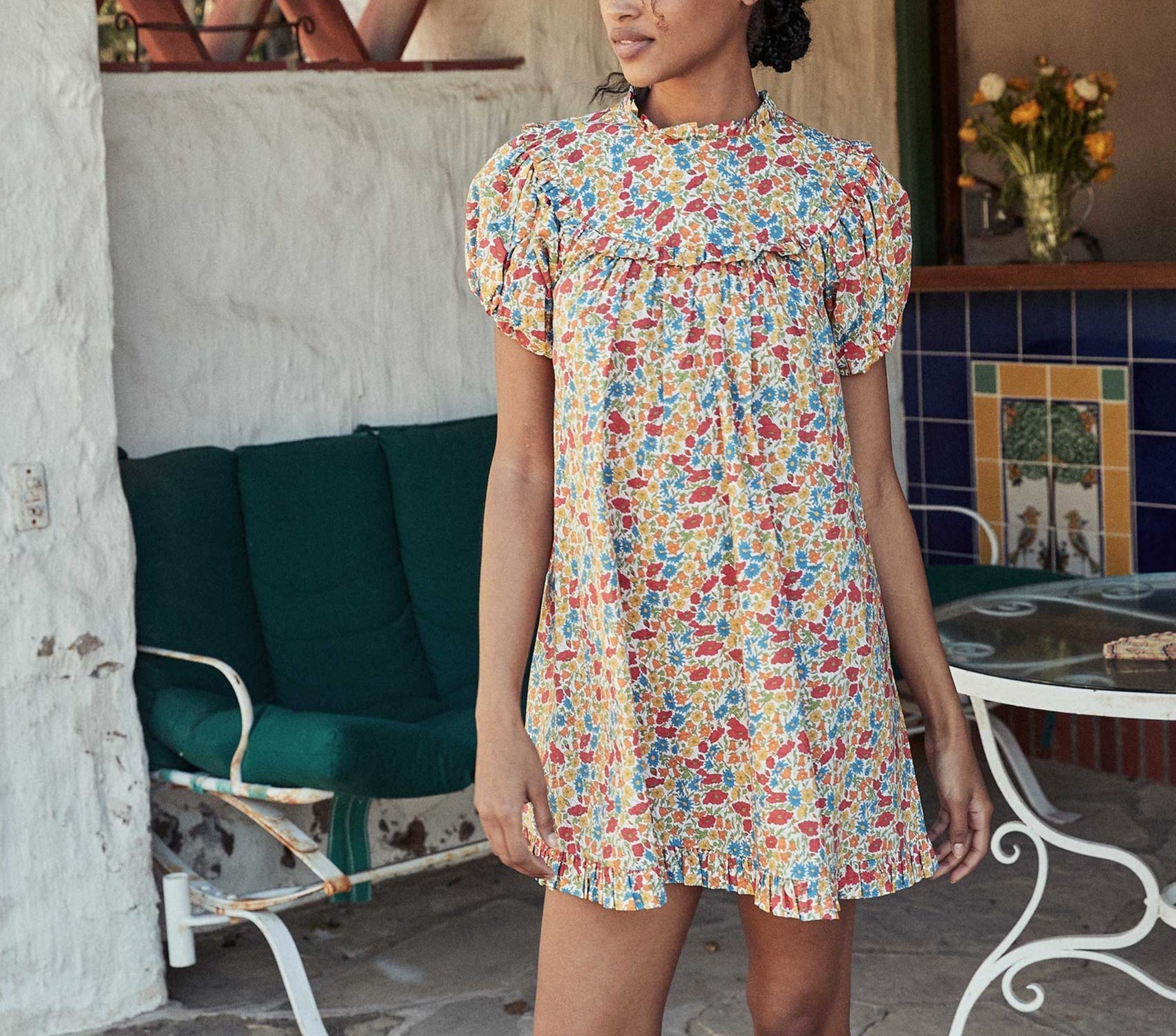 A dreamy confection of Liberty print florals and pintucking, the Alice Dress is the stuff of springtime dreams. The loose, romantic body flows down from the neckline to just above the knee, bringing whimsical energy to a classic mini silhouette. Two layers of fabric and an elasticized short sleeves create an easy puff. The structured yoke is framed with a petite ruffle that calls back to the ruffled edge at the hem, while a high neckline closed with mother of pearl buttons brings a touch of elegant charm. Two pockets at the front make the perfect place to tuck away treasures on springtime rambles through the woods.