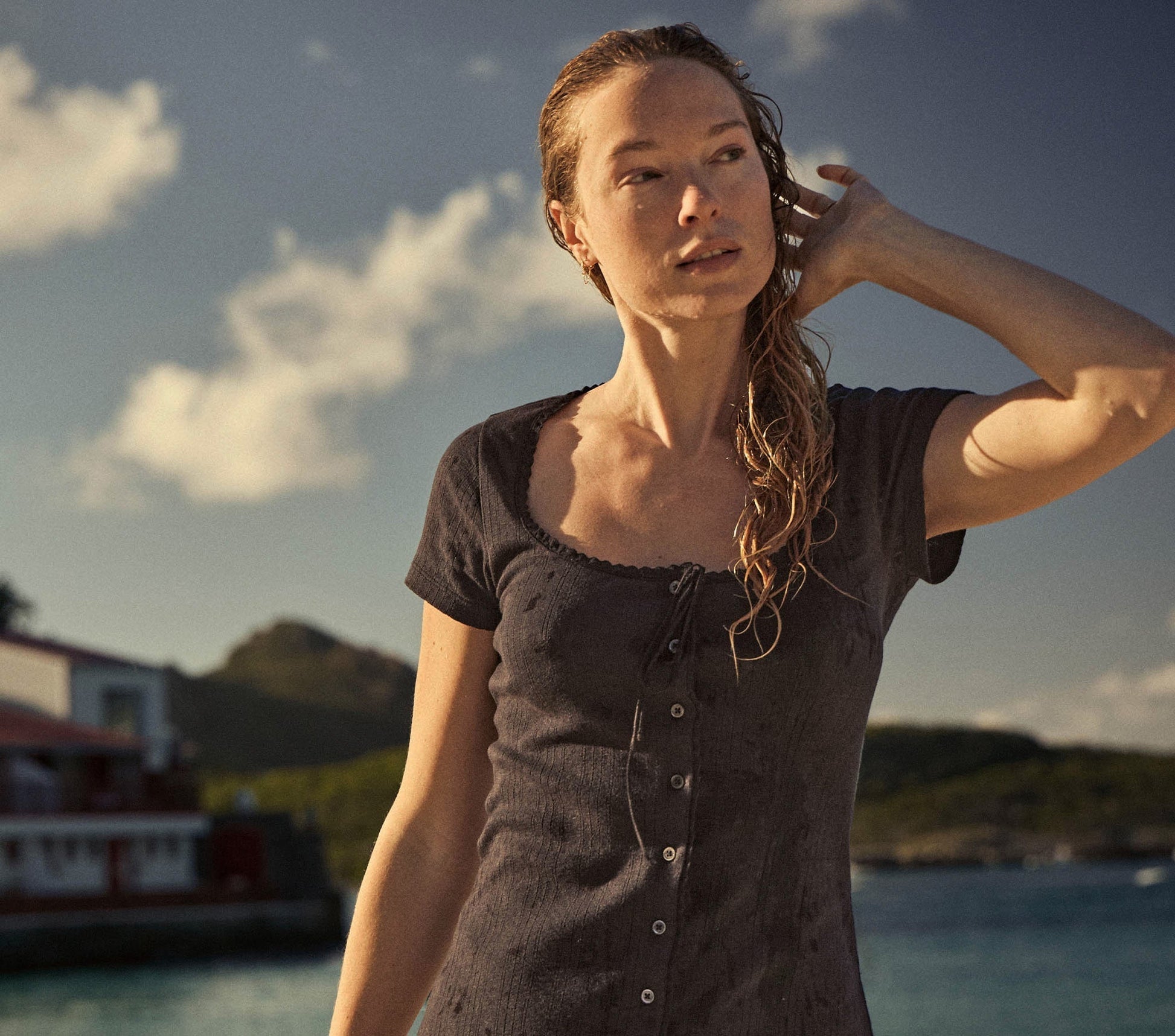 Crafted from the softest 100% cotton pointelle, the Amata Dress features short cap sleeves, a fitted silhouette, and a scoop neckline adorned with petite scallop lace and a tulle tie. A playful mini hemline falls to mid-thigh, while mother-of-pearl buttons extend down the front.