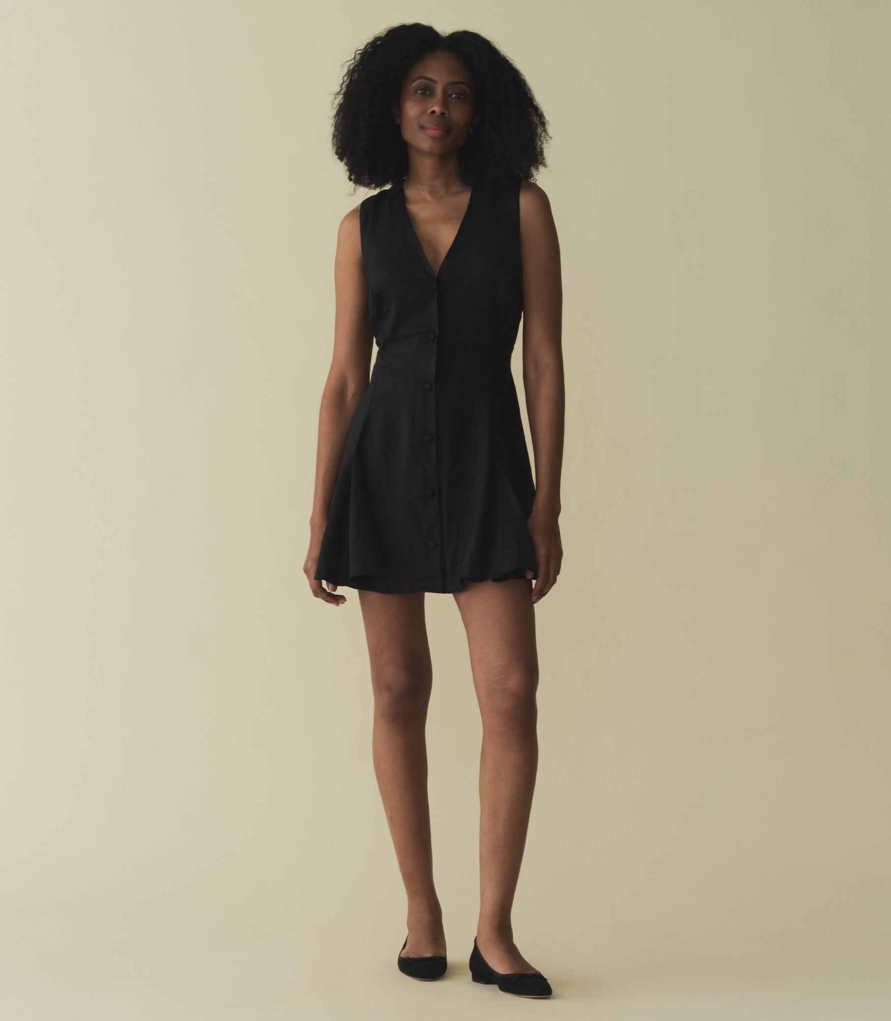 Rendered in 100% linen, the Aubrey Dress—a beloved style that we’ve brought back from last summer—is a sleeveless style with a plunging V-neckline and a swingy mini hemline. Princess seams lend structure to the bodice, while a back waist tie allows you to adjust the fit. Self-covered buttons extend down the front.