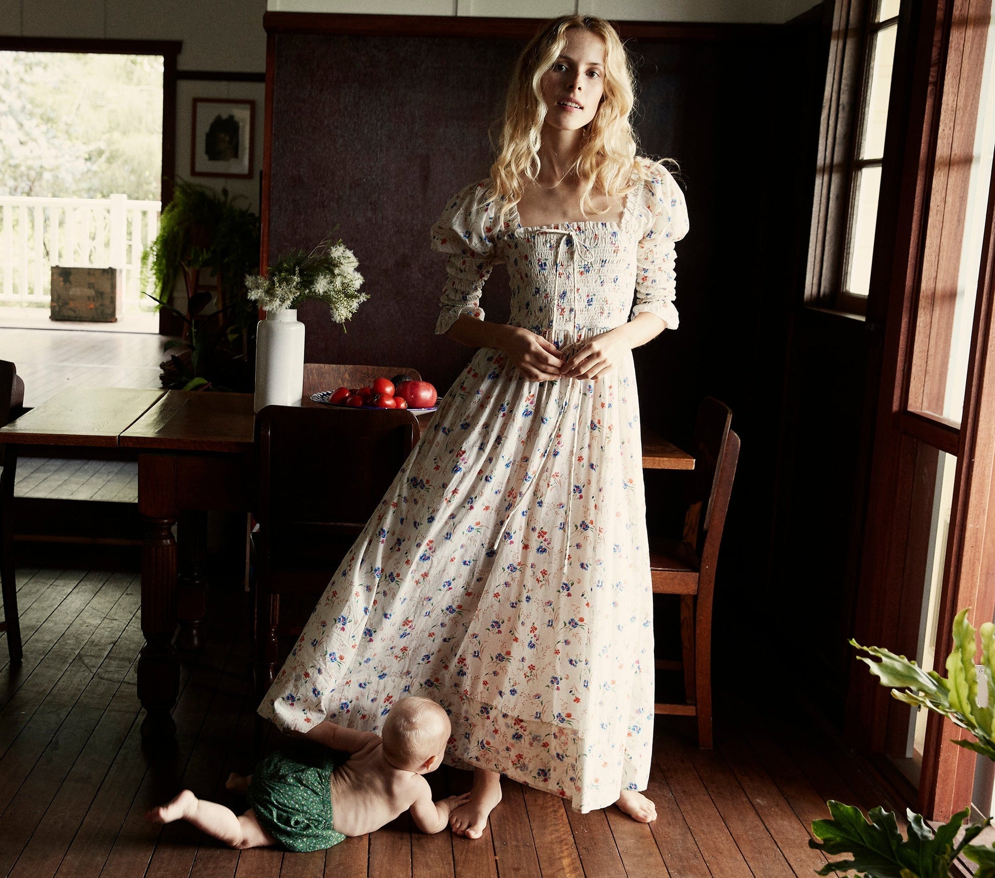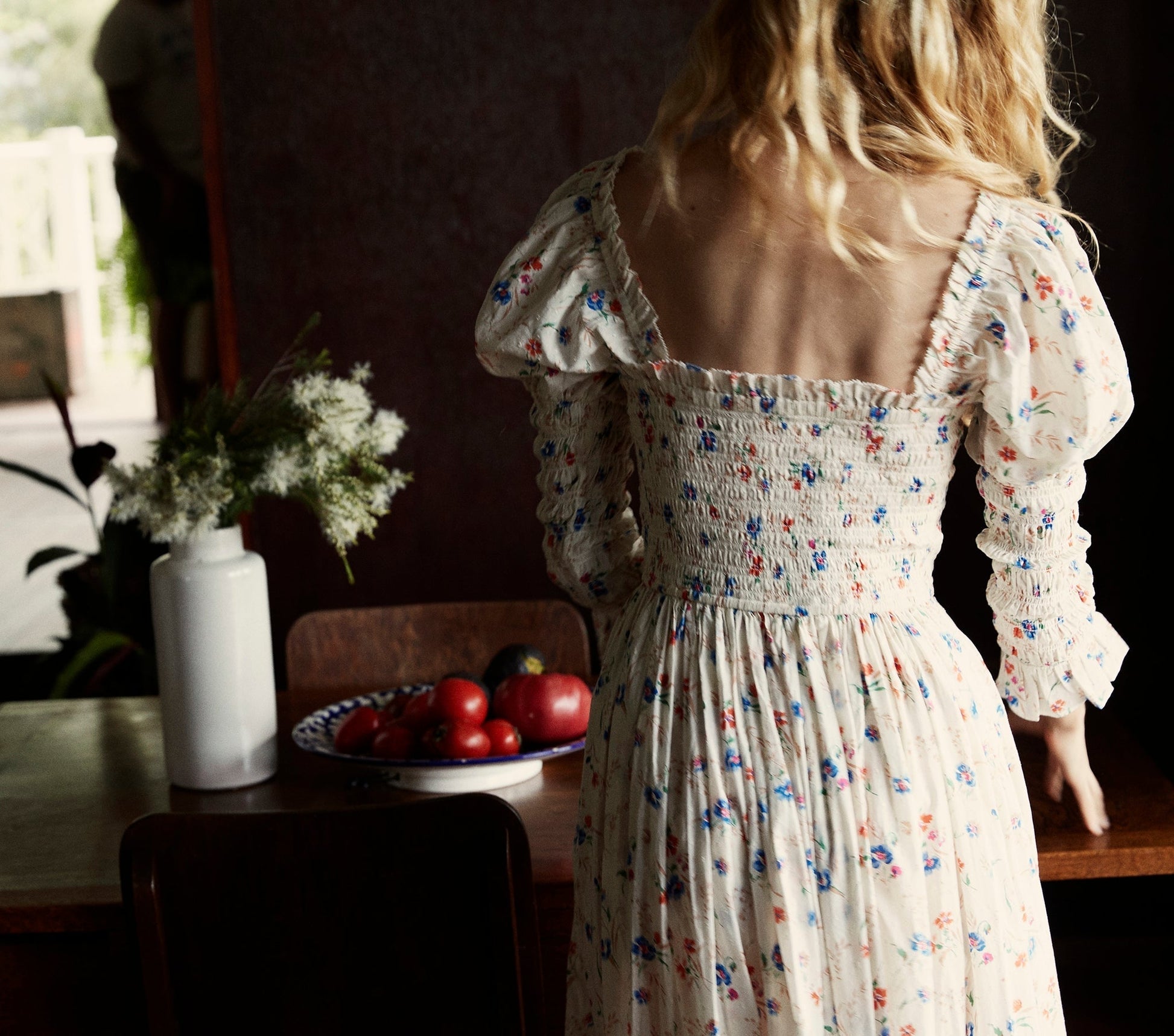 In 100% cotton, the DÔEN Bijou Dress is a charmer from its ruffle-accented square neck to its breezy gown length, ready for sunlit mornings at the seaside, easy to take out for evenings formal or flirtatious. The smocked bodice has a tunneled waist tie to loop into a bow, and a flowing skirt. An airy puff at the shoulder leads to a smocked sleeve finishing just past the elbow, trimmed with a ruffle.