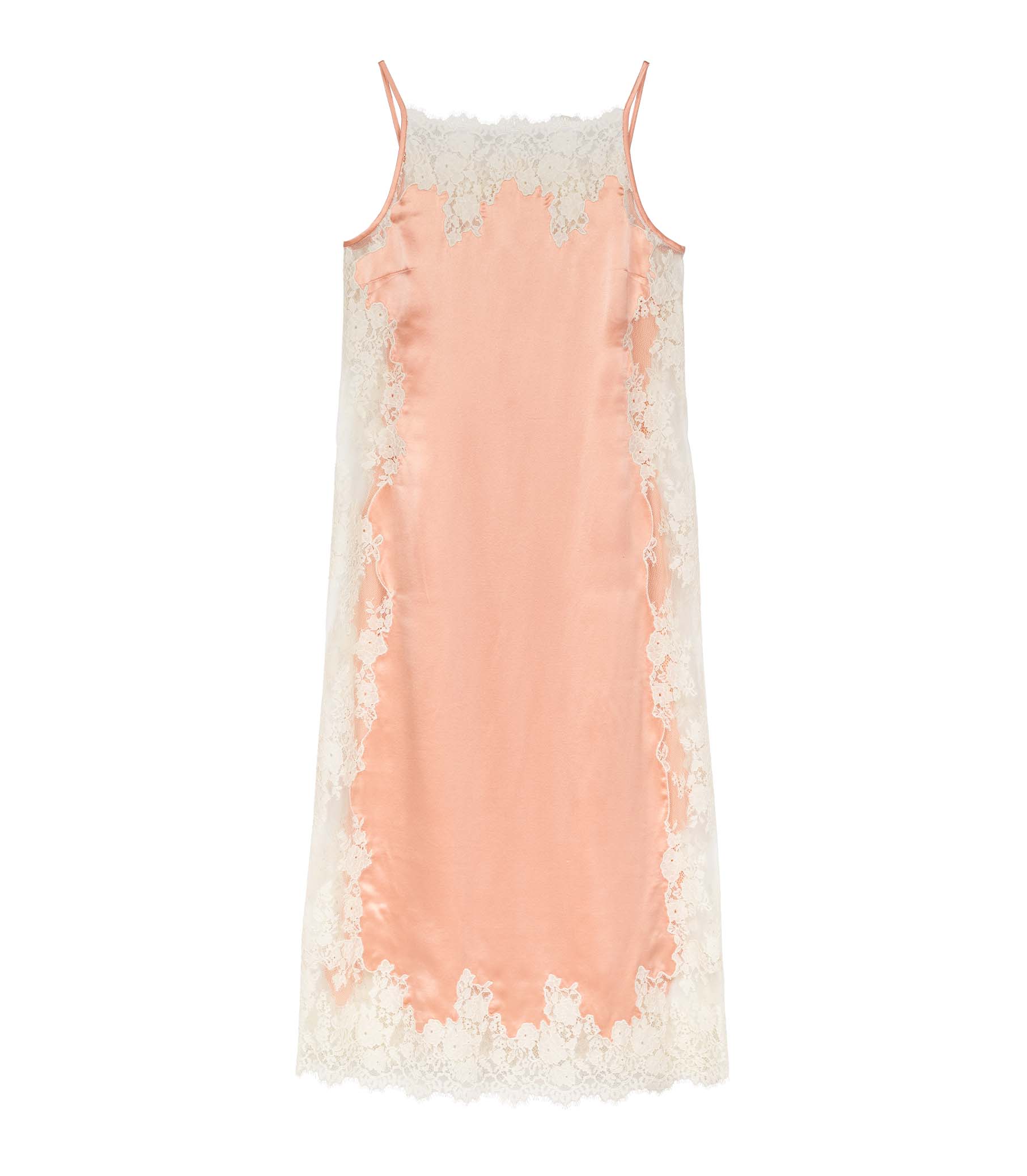 Rendered in a lustrous silk satin in the prettiest shade of coral, the DÔEN Heirloom Brietta Dress features a sheath silhouette inspired by the ‘90s. Cream contrast lace adorns the neck, side panels, and hem, which hits at mid-calf.