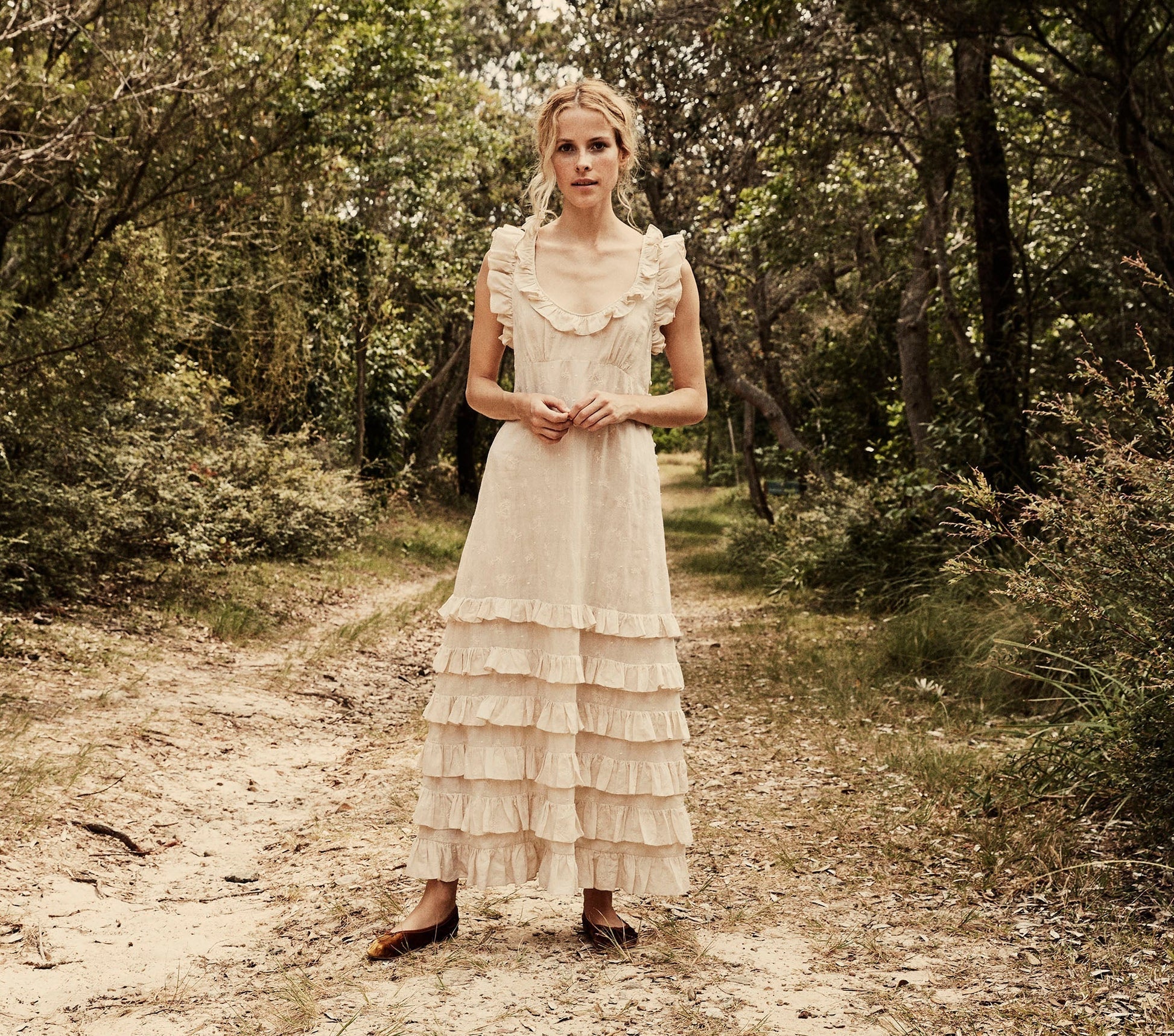 In 100% ramie, the Dôen Calla Dress is a vision of embroidery and ruffles. The empire waist is highlighted with gathers at the bust for shape, with a wide neck trimmed with at the collar and shoulders with a wavy ruffle. The body is cut roomy to move with you while the ramie construction holds its shape. Ruffles cascade down the hem, getting infinitesimally longer as they go, like waves clinging as you emerge from the sea. We’re wearing this dress from evening events to the seaside under cloudless skies.