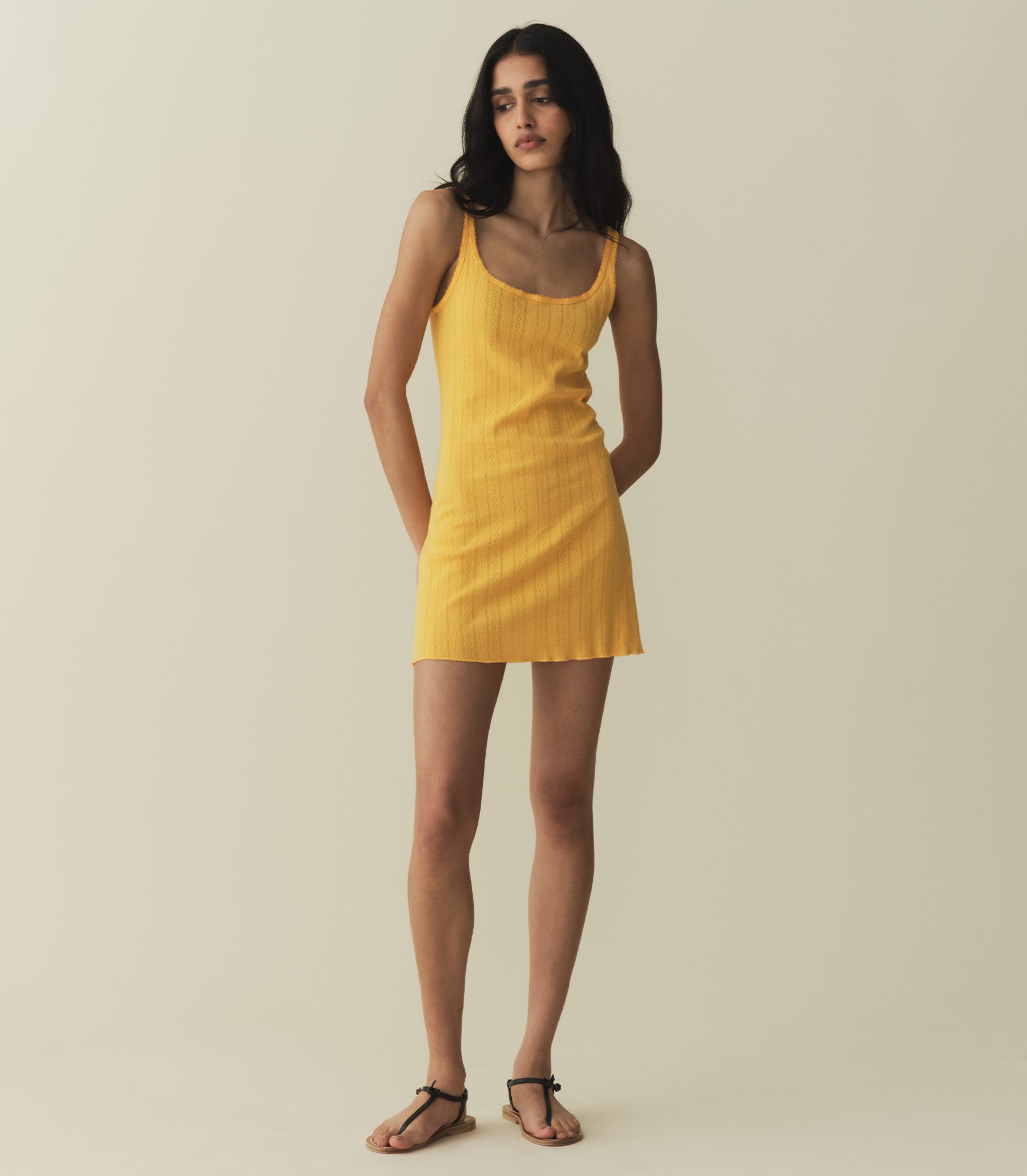 In soft 100% organic cotton pointelle, the ‘60s-inspired Cynthia Dress is an effortless pullover style with a fitted silhouette, a mini hemline, a scoop neckline, and slender straps trimmed with scallop-edged cotton lace.
