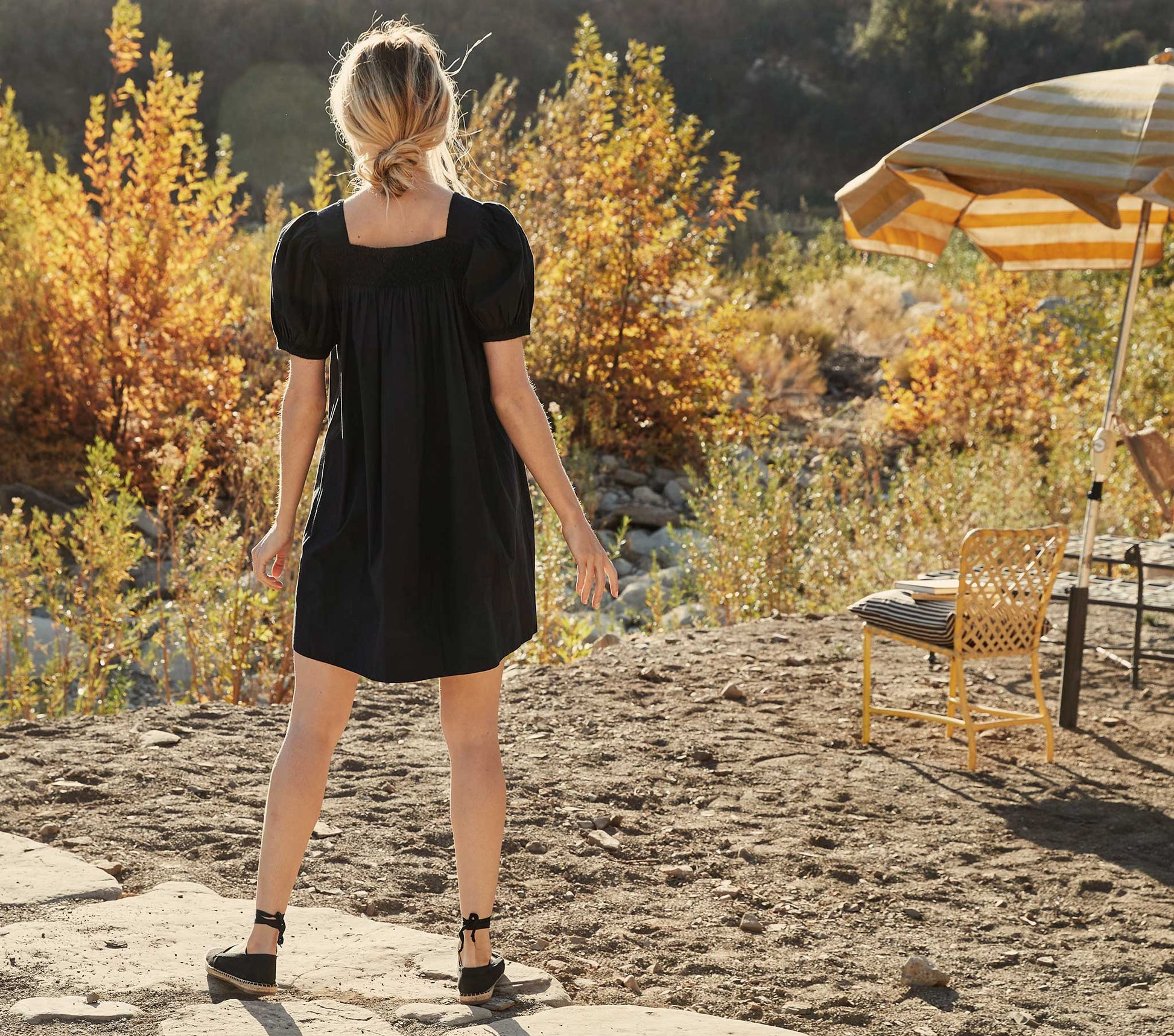 In 100% organic cotton poplin, the DÔEN Earhart Dress brings together a geometric smocked yoke, zigzag smocked short puff sleeves, and an airy minidress silhouette to create the easiest sunny weather option. Blanket stitches trim the neckline and sleeve hems, adding a nostalgic feel to this vintage-inspired shape.