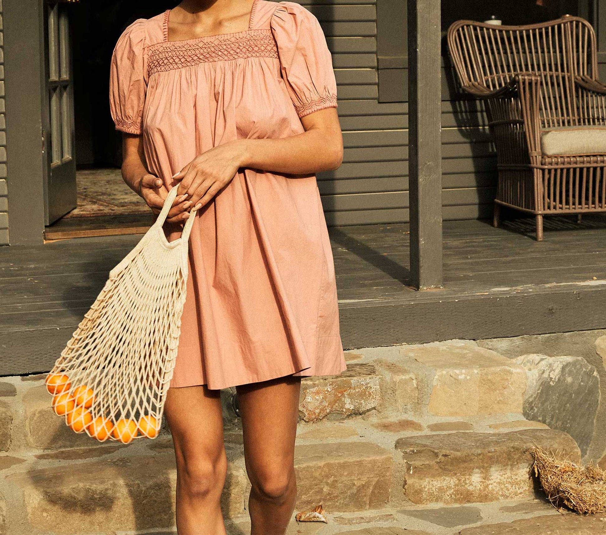 In 100% organic cotton poplin, the DÔEN Earhart Dress brings together a geometric smocked yoke, zigzag smocked short puff sleeves, and an airy minidress silhouette to create the easiest sunny weather option. Blanket stitches trim the neckline and sleeve hems, adding a nostalgic feel to this vintage-inspired shape.