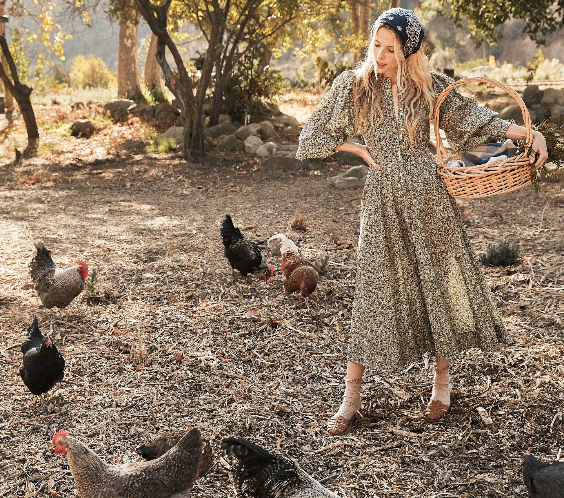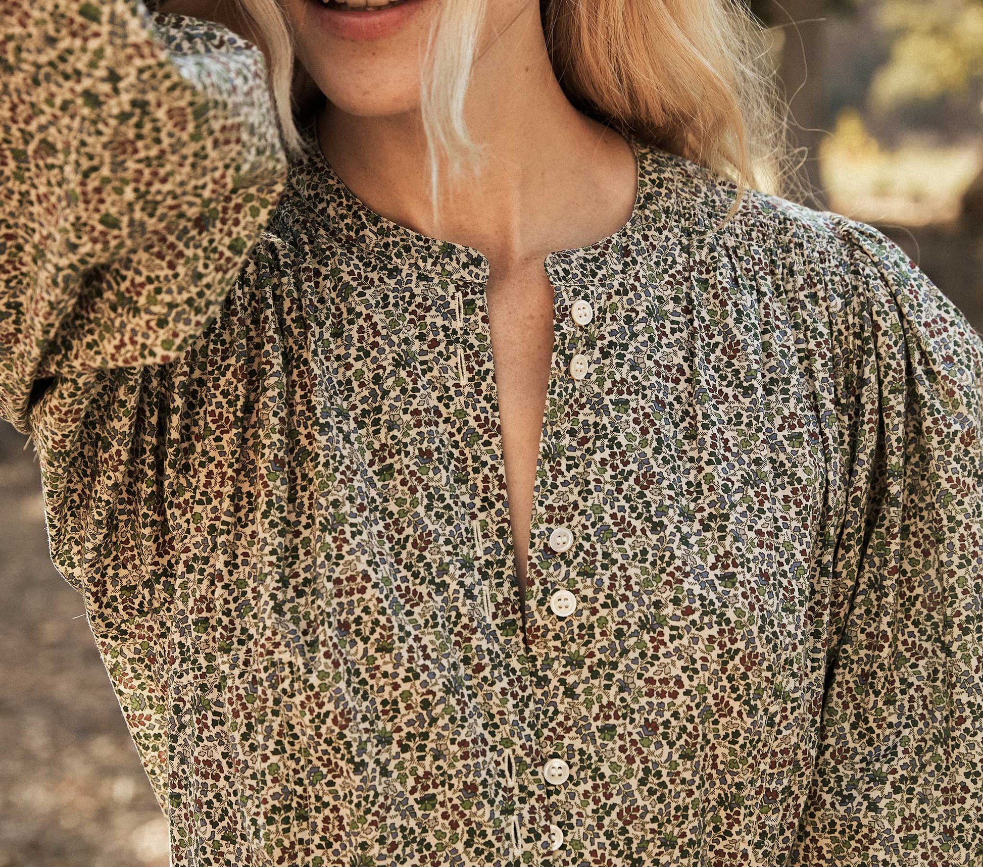 In 100% cotton, the DÔEN Edlynne Dress pairs the simplicity of a shirtdress with a full statement sleeve. Center couplet mother of pearl buttons stand out on the simple shape with its princess-seamed bodice, full skirt, and stand collar. Three button cuffs finish the billowy Victorian-inspired sleeves.