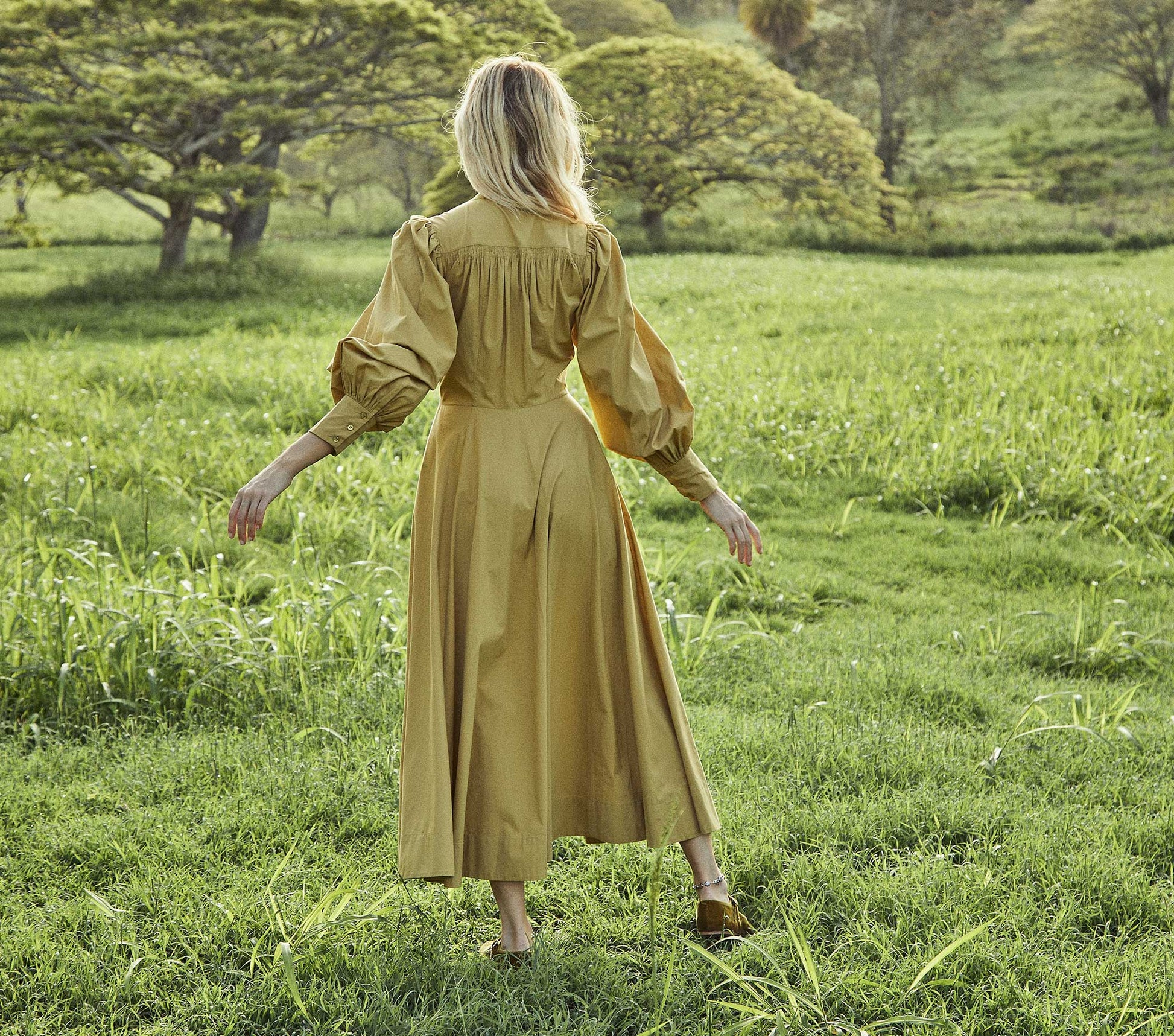 Our take on the classic shirt dress rendered in 100% organic cotton, the Edlynne Dress pairs the simplicity of this iconic silhouette with signature tailoring touches. Ruching along the yoke lends structure, leading to a slight puff at the top of the full statement sleeve, finished with three buttons at the cuff. The princess-seamed bodice leads to a full skirt that cascades down from the waist, while a line of couplet mother of pearl buttons descending from the stand collar down the center front bring adaptability to the simple shape.