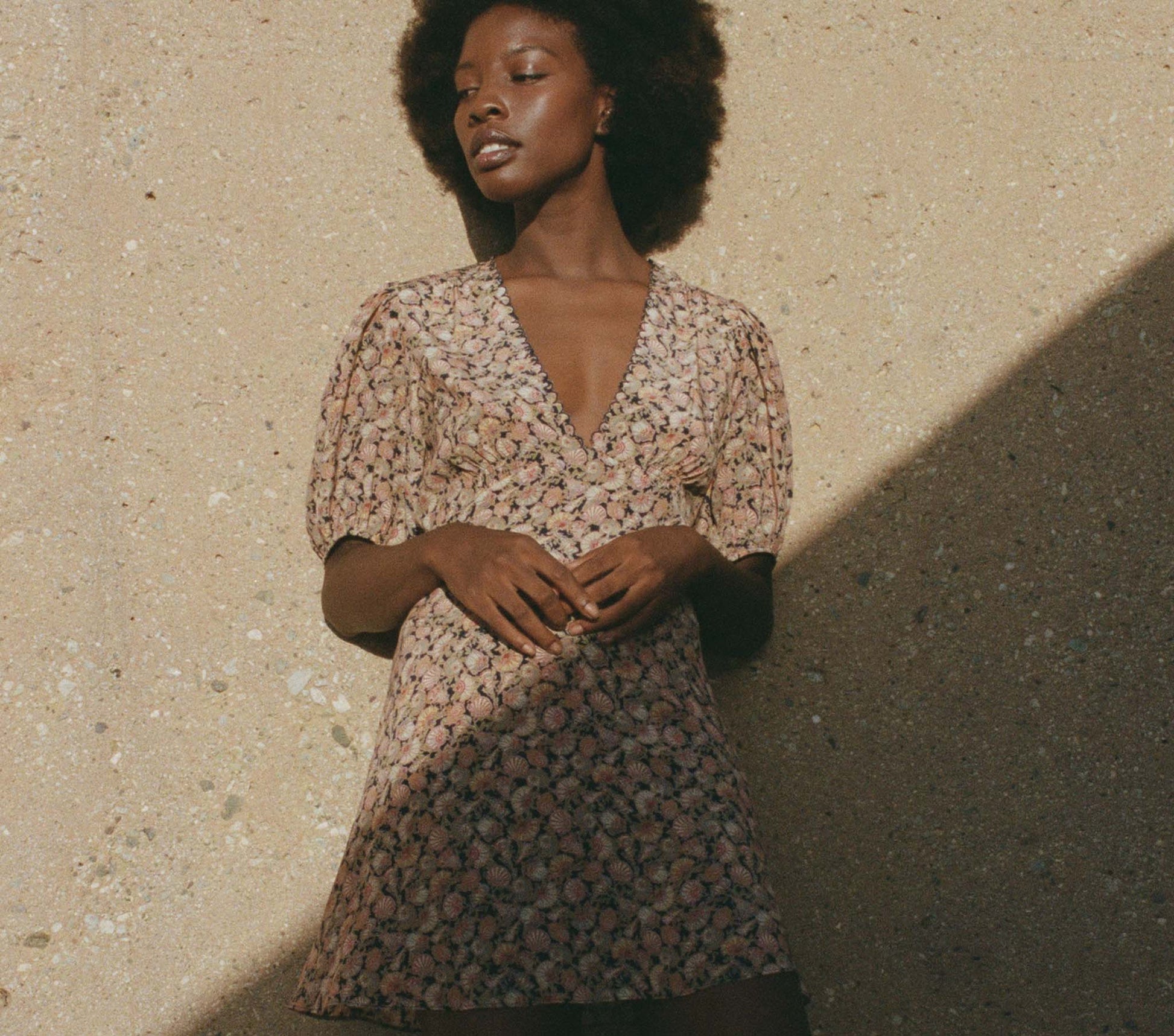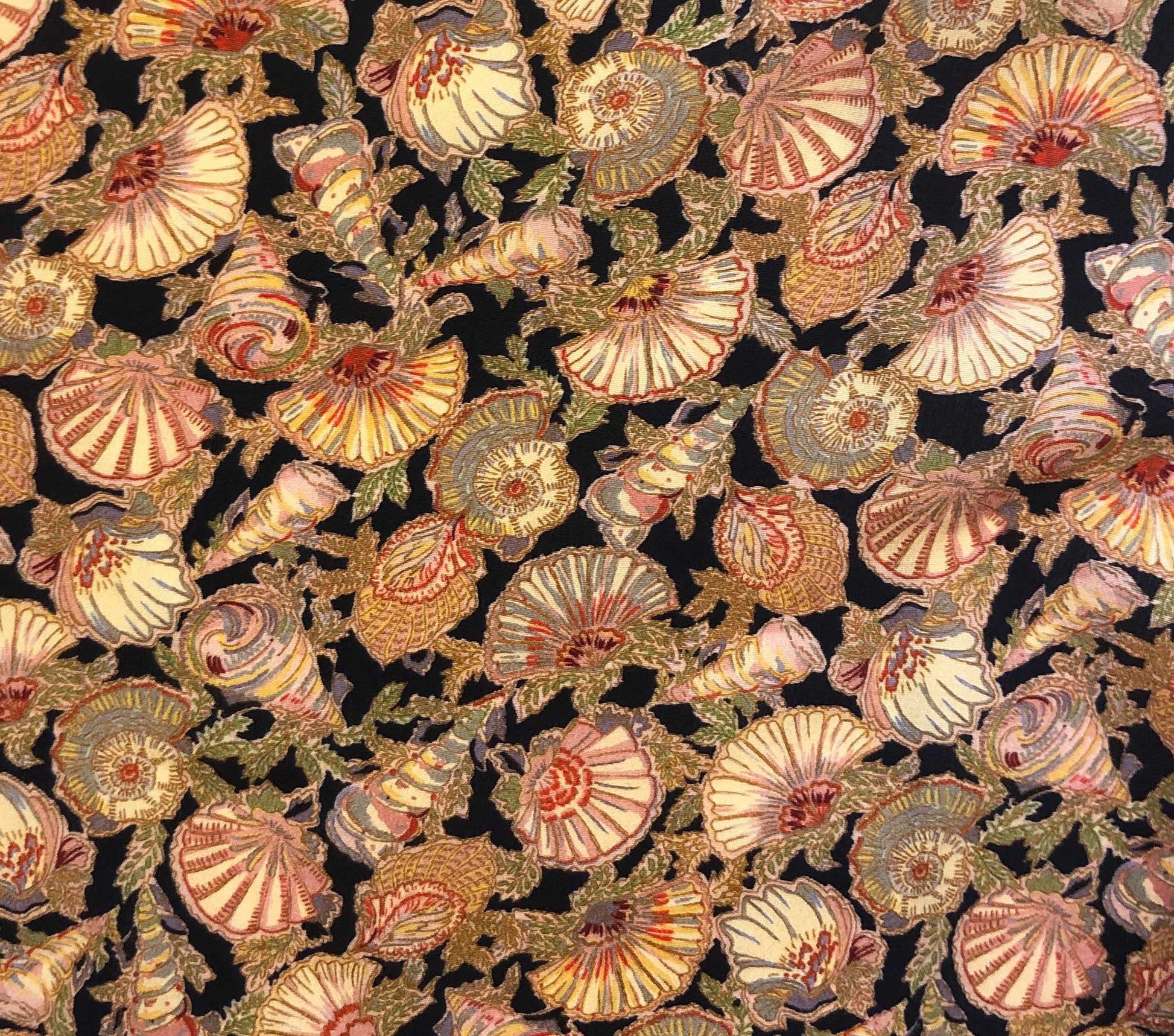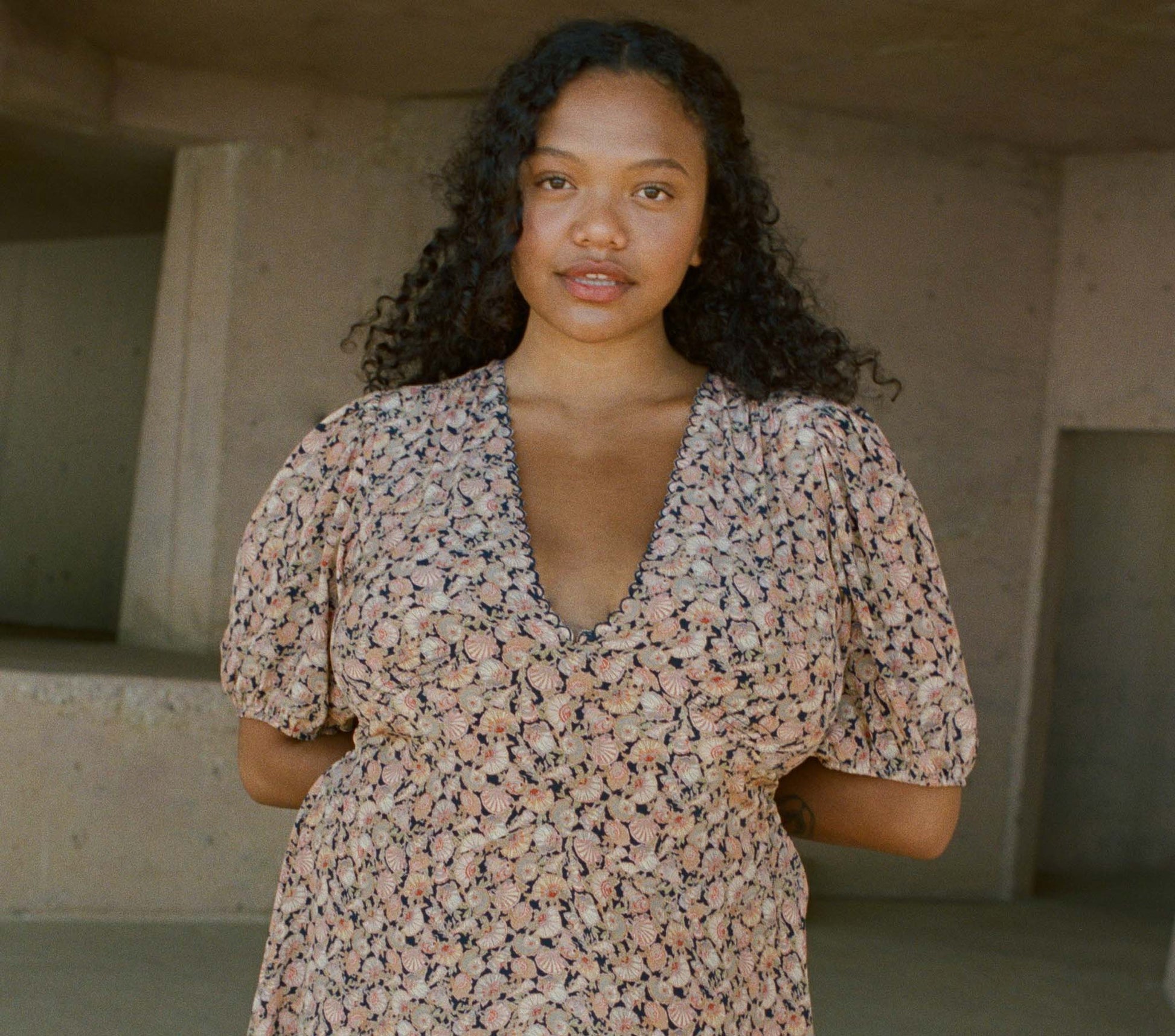 Rendered in the softest sandwashed silk, the Emilia Dress is our take on a classic, easy-wearing warm-weather style. The deep V-neckline is adorned with a scalloped marrow edge that echoes the sinuous shapes of the shells in the pattern, rendered in a dark tone that calls back to the base hues of this vintage-inspired pattern. The full sleeves end with a shirt cuff for easy fullness, while a functional tie at the back allows you to cinch in the silhouette of this pullover to create the perfect fit. Shirring stitches at the waist and an above-the-knee bias cut skirt evoke a modern take on a ‘30s seaside silhouette.