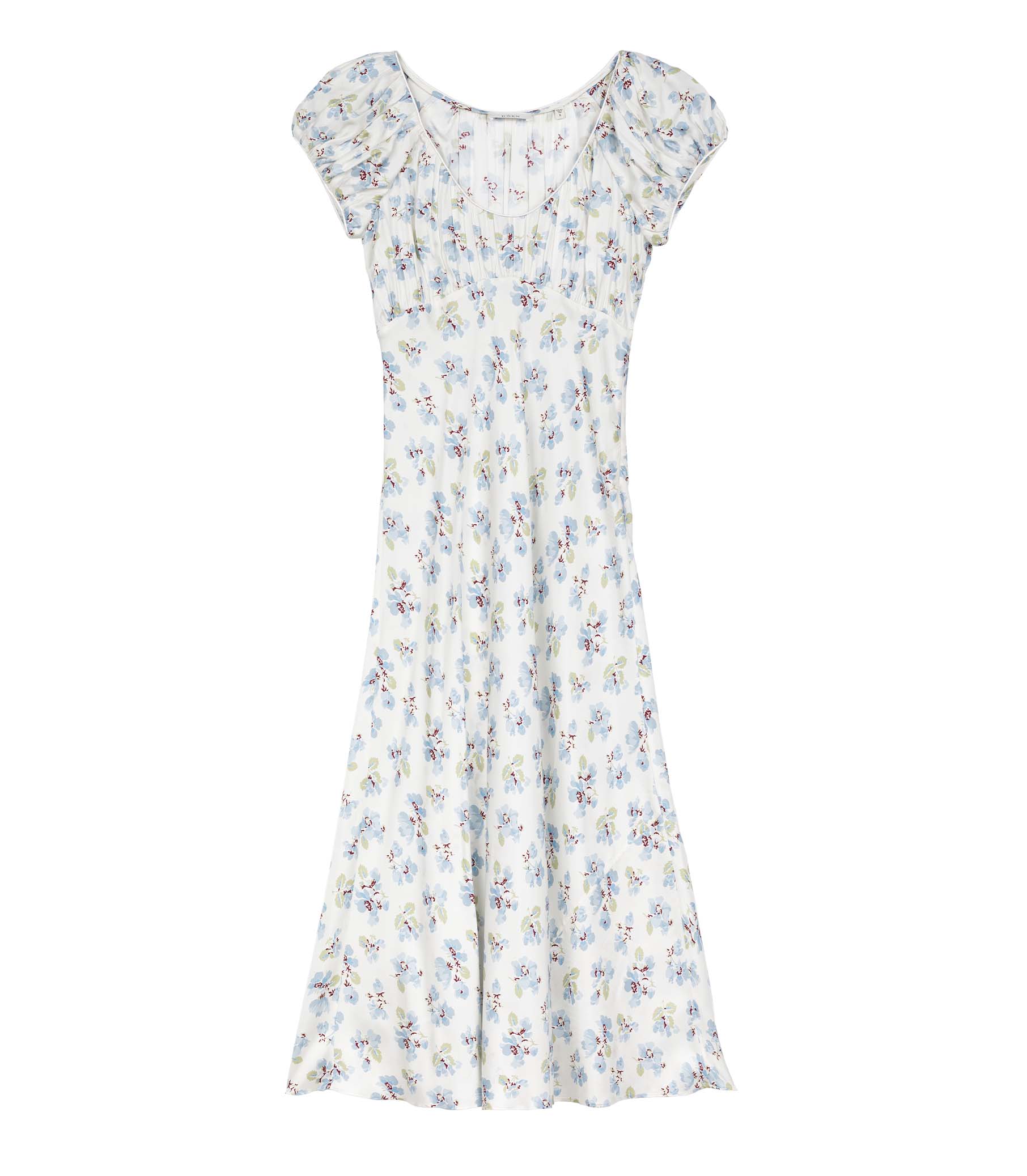 In a luminous blend of silk and viscose, the Florencia Dress—which takes cues from ‘30s gowns—features a soft scooped V-neckline, ruching at the bust and sleeves, and an ankle-length bias-cut skirt.