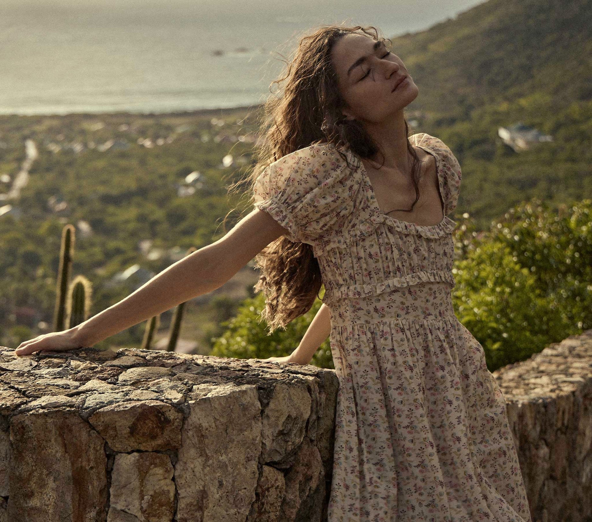 The Gia Dress takes cues from the graceful slip styles of the '30s and '40s. Its square neckline, short puffed sleeves, and ankle-grazing skirt are trimmed with picot-edged petite ruffles, while shirring at the bust and empire waist lend subtle volume. An invisible side zipper creates the perfect fit.