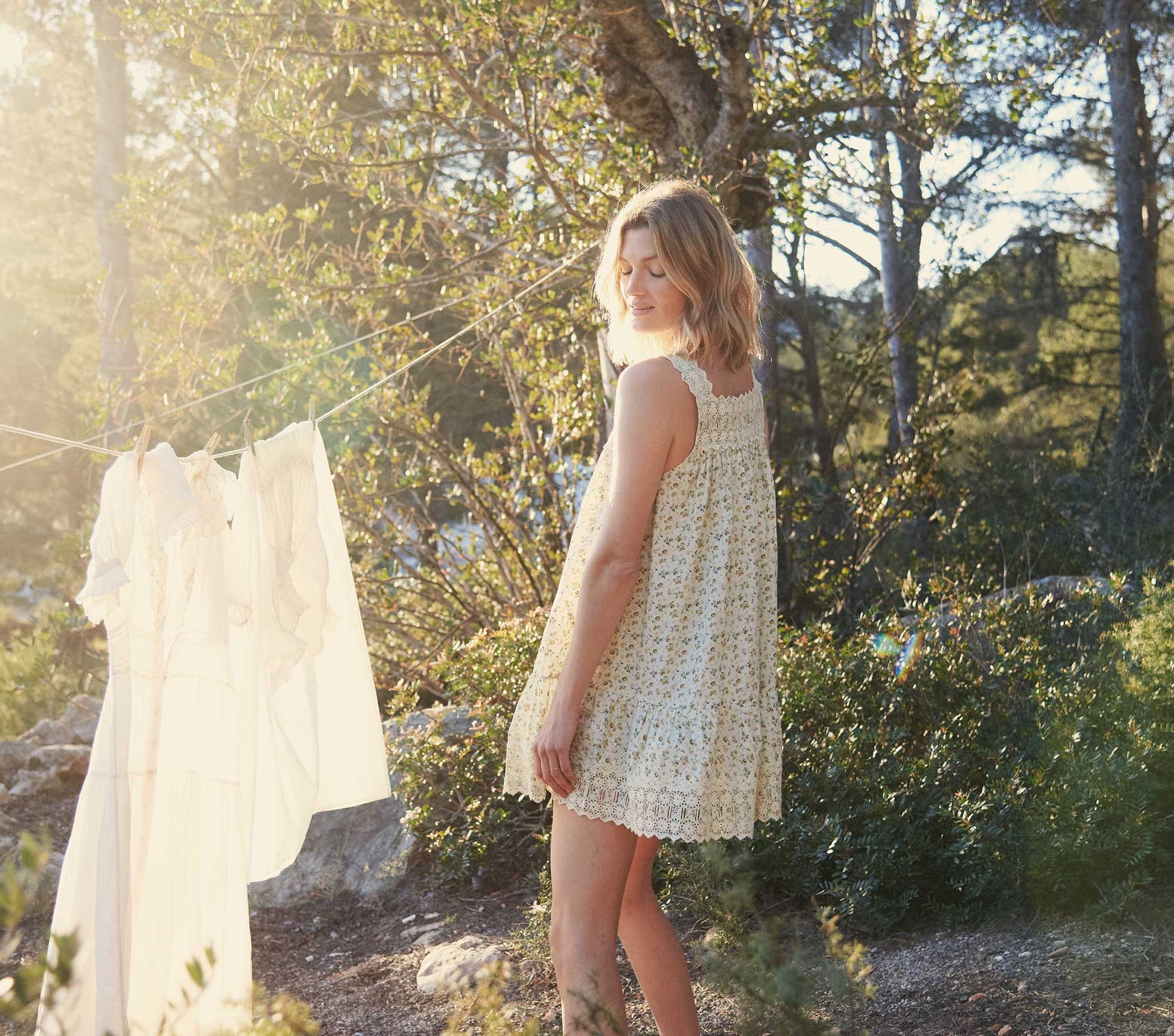 In 100% cotton poplin, the DÔEN Gladys Dress is an embroidered delight, equally suitable for sunny days out and evenings inside. Floral eyelet detailing abounds at the square neckline, wide scalloped straps, and short hem. A henley button placket with zigzag trim adds extra styling options and ease.