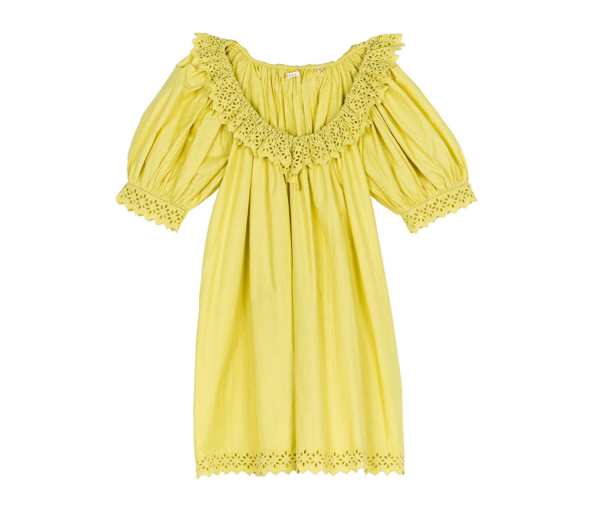 The Iona Dress is a dressed-up take on a classic throw-on springtime style, elevated with vintage-inspired detailing. The V-neck dips low at the front and is framed with a generous, eyelet and floral-embroidered scalloped ruffle, which calls back to the sweet eyelet details at the sleeves and hem. The sleeves are shirred into the neckline to add volume, creating a slight pouf that completes its vintage charm.