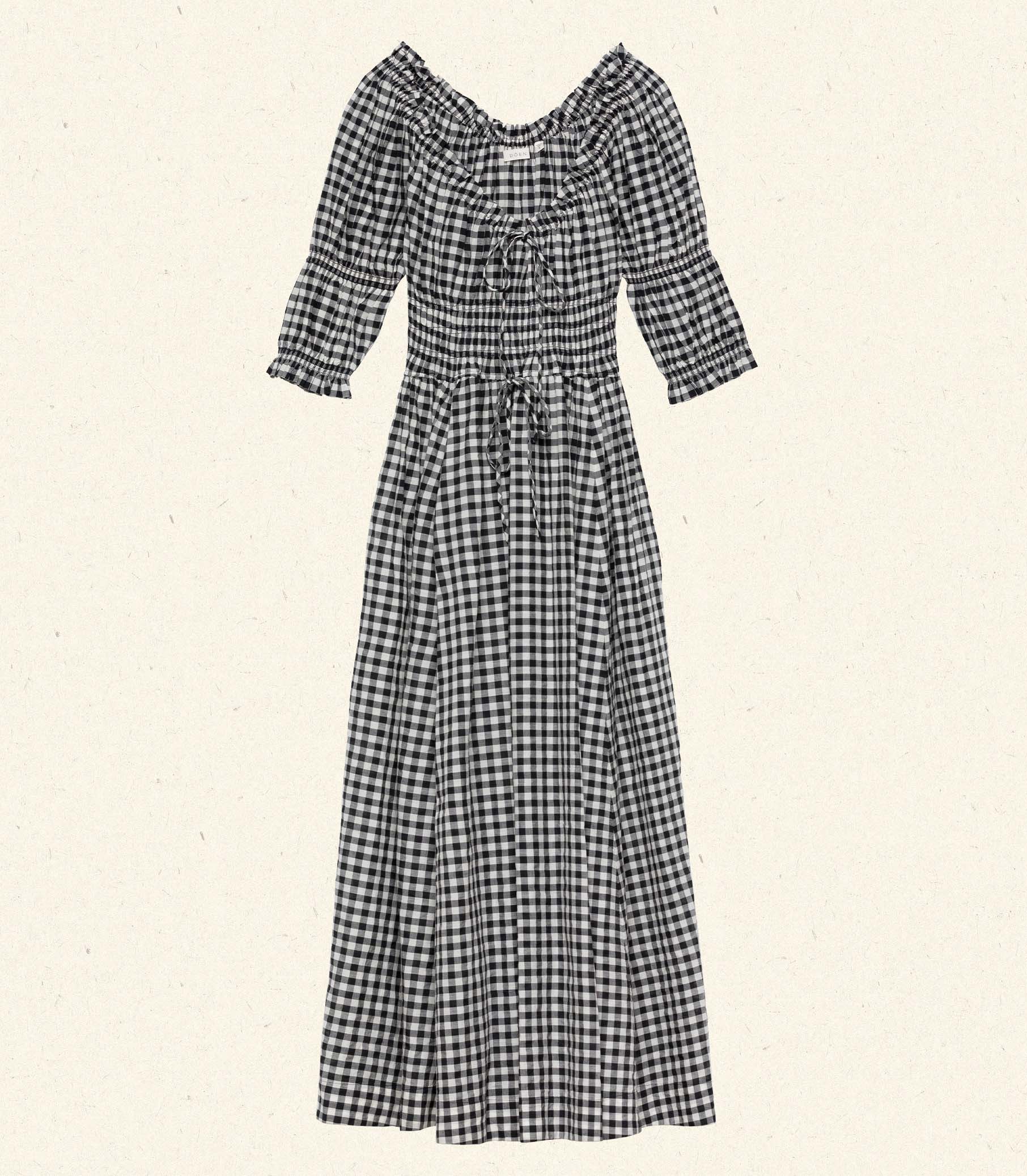 In the softest organic cotton voile, our beloved Ischia Dress—a Favorite Character that first made its debut in Spring 2021—is refreshed in a Noir Greta Gingham, featuring double-puffed sleeves and a scoop neckline adorned with petite ruffles and a functional center tie. A smocked bodice with an adjustable waist tie gives way to an ankle-grazing A-line skirt.