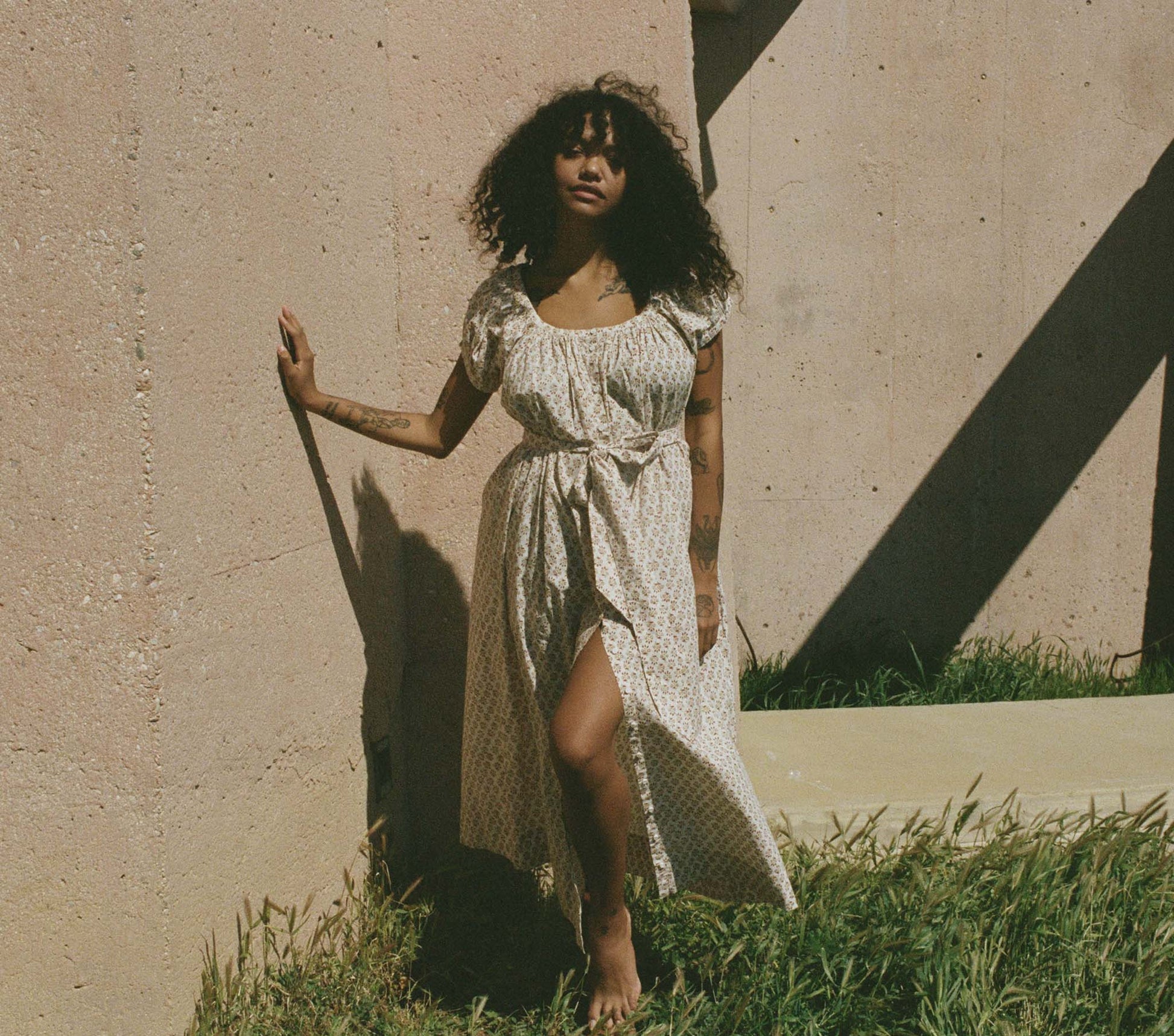 Crafted from organic cotton poplin and rendered in an archival block print from the ‘70s, masterfully hand-printed by artisans in India using heritage techniques, the Jocelina Dress features a scoop neckline, short puffed sleeves, and a breezy silhouette. Wear it loose, or cinch with the adjustable tie belt.