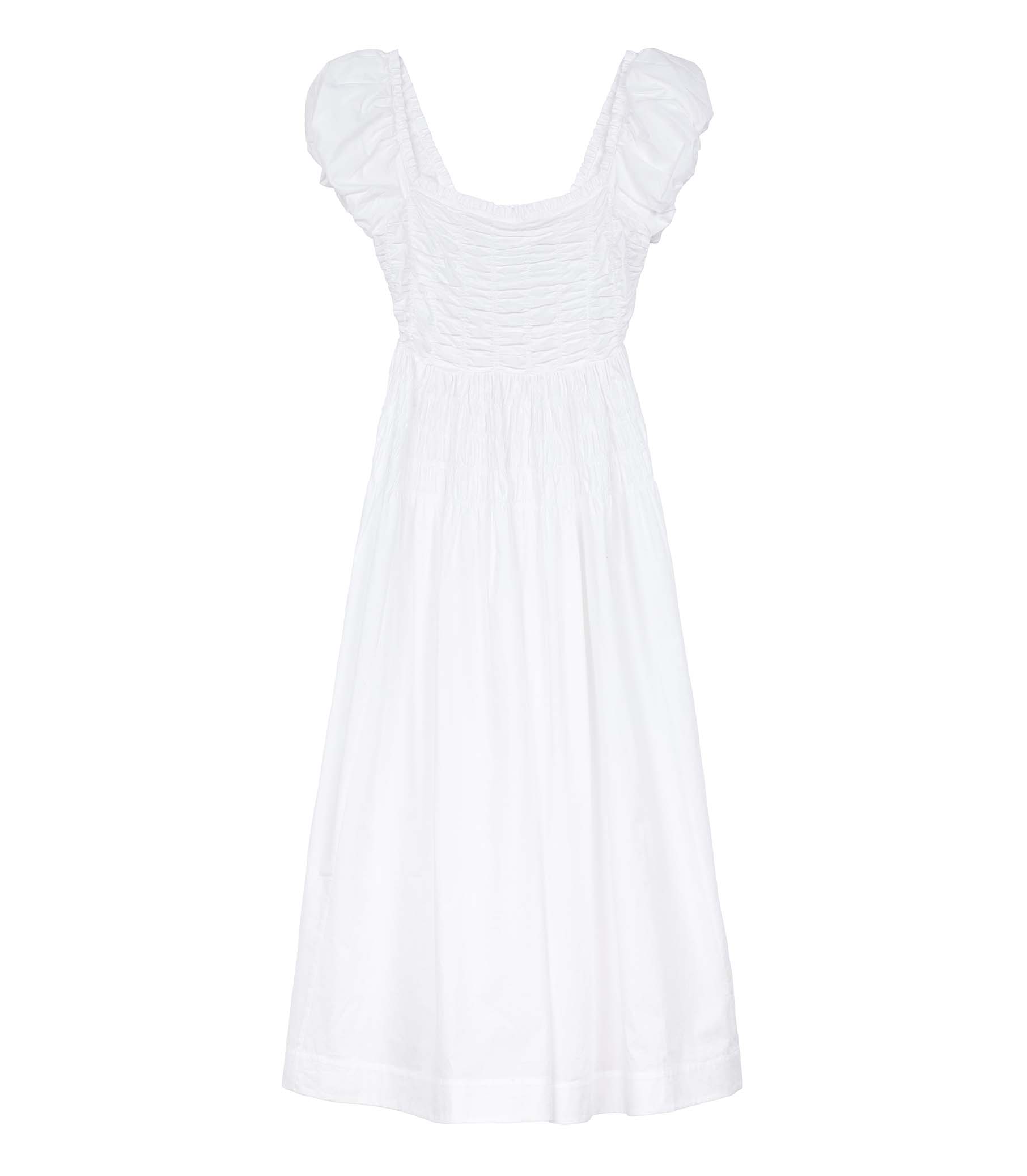 In a crisp cotton poplin, the Katherina—which draws inspiration from our bestselling Pamelina Dress and is a favorite of our co-founder Katherine—features short puffed sleeves and a square neckline trimmed with petite ruffles. A shirred bodice with elasticated smocking at the back gives way to an ankle-length skirt.