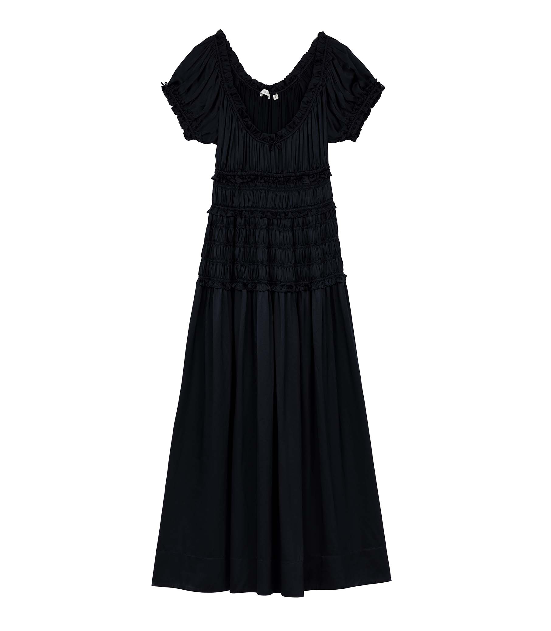 Crafted from a deep navy silk satin, the fan-favorite Leanne Dress features a scoop neckline, a gathered bust, and a fitted bodice framed with petite ruffles. A third gathered panel finishes just below the hips, flaring out into an ankle-length skirt, while elastic lends give to the short puffed sleeves, bust, and waist.