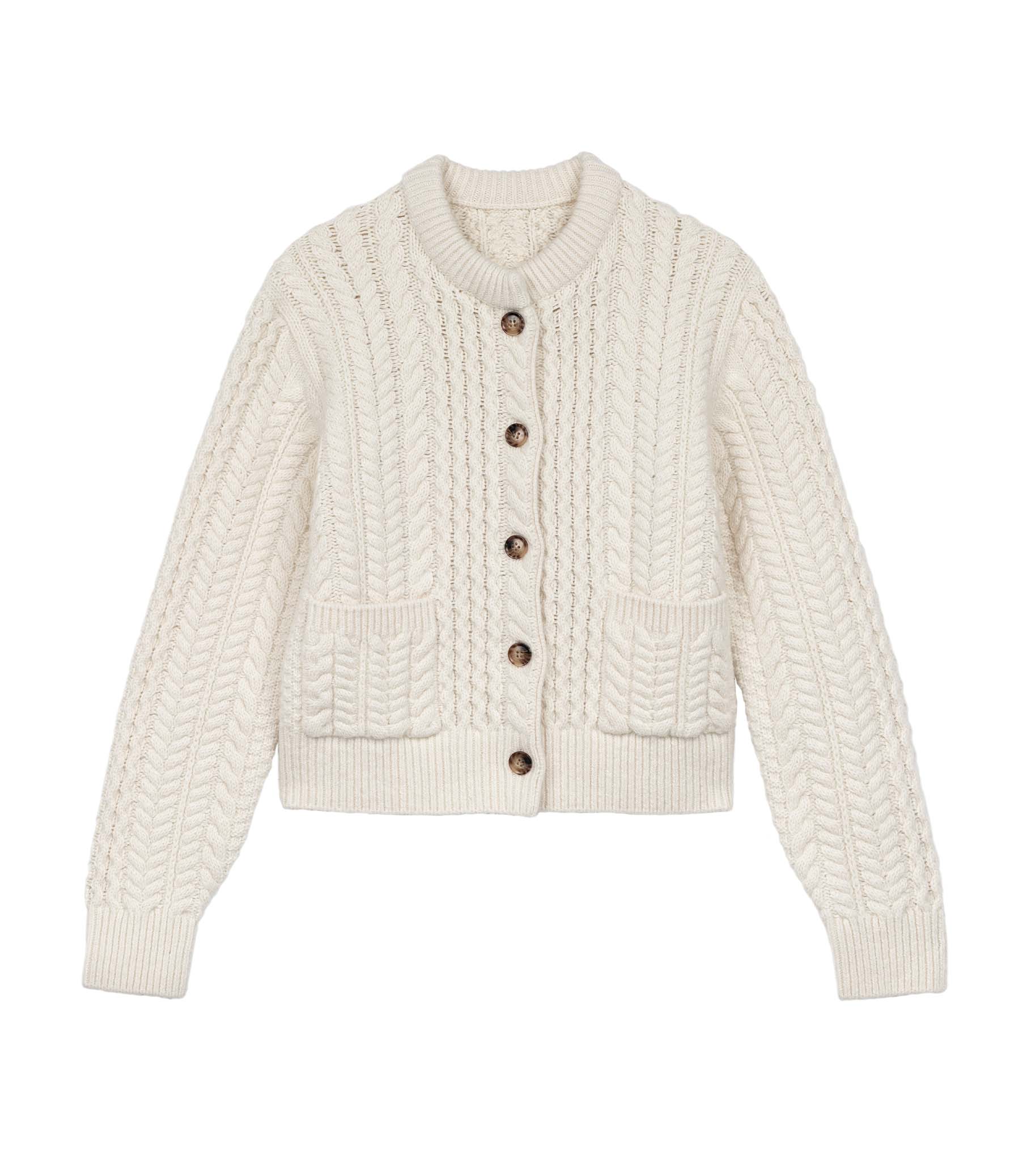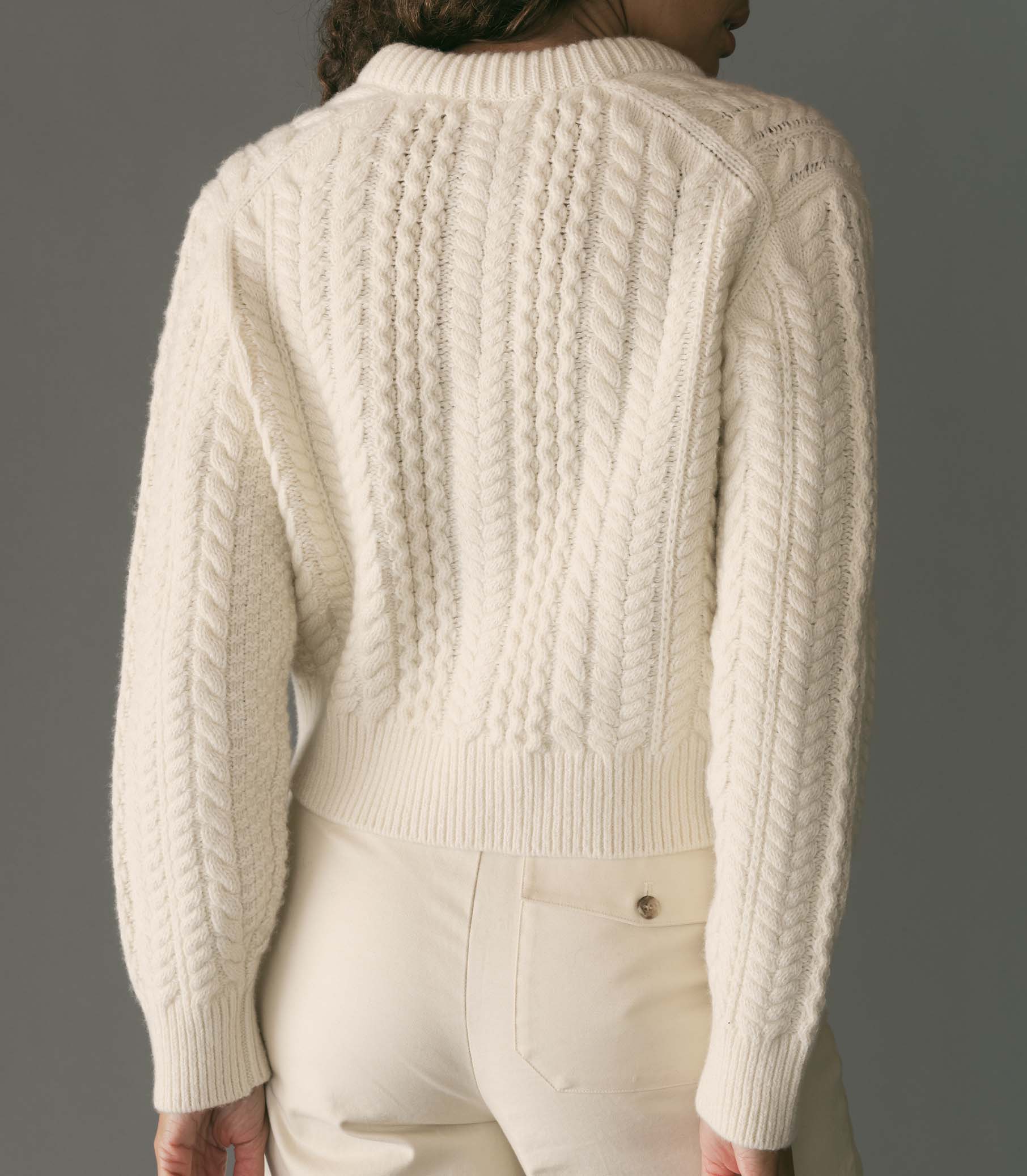 Taking cues from 1940’s fisherman knits, the Mercina Cardigan is an everyday staple rendered in a sumptuous wool and cotton blend. Faux horn buttons run down the center front.