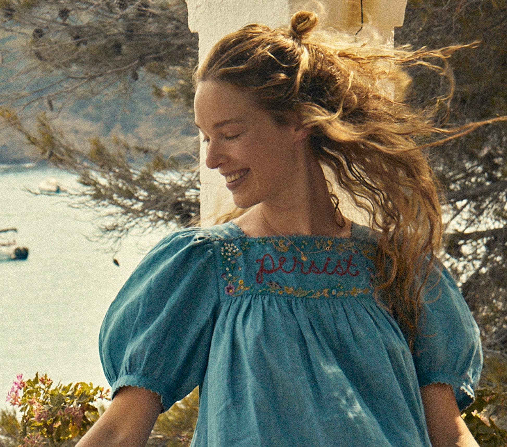In 100% ramie, this special summer edition of our DÔEN Mica Dress is inspired by style icon Jane Birkin. A modern mini full of vintage charm, Mica features small puff sleeves gathered into a simple band, and a line of mother of pearl buttons down the center back. The square neckline supports a yoke adorned with the word “Persist” chain stitched at the center, decorated with bees, pansies, daisies, strawberries, and a joyful assemblage of wildflowers. Hand crochet stitching along the shoulder band and placket finishes this sweet silhouette. The body is shirred in at the neck yoke, creating a full, breezy shape that charms in comfort. With every order of this special edition dress, we are donating 10% of the profits to our partner, Planned Parenthood LA.