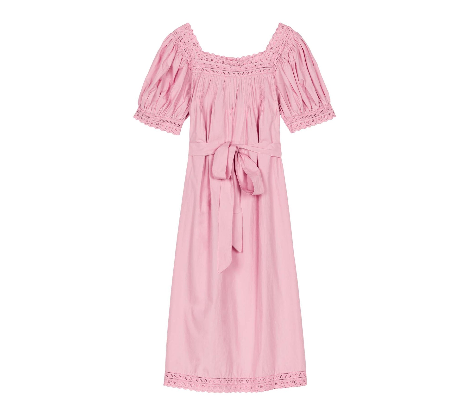 A dress version of our Trieste Top, the Mignonette Dress is easy summertime elegance, ideal for a ramble through the garden. Small puff raglan sleeves are finished with embroidered scallops and eyelet embroidery, echoing the decorations at the square neckline and shoulder band. The trim along the picture-frame neckline is sewn to create a gathered effect, as a cluster of pintucks radiate from under the lace yoke and lead into the full skirt, which can be gathered close with the included self belt or left to freely flow in the breeze. A line of mother of pearl buttons adorn the center back.