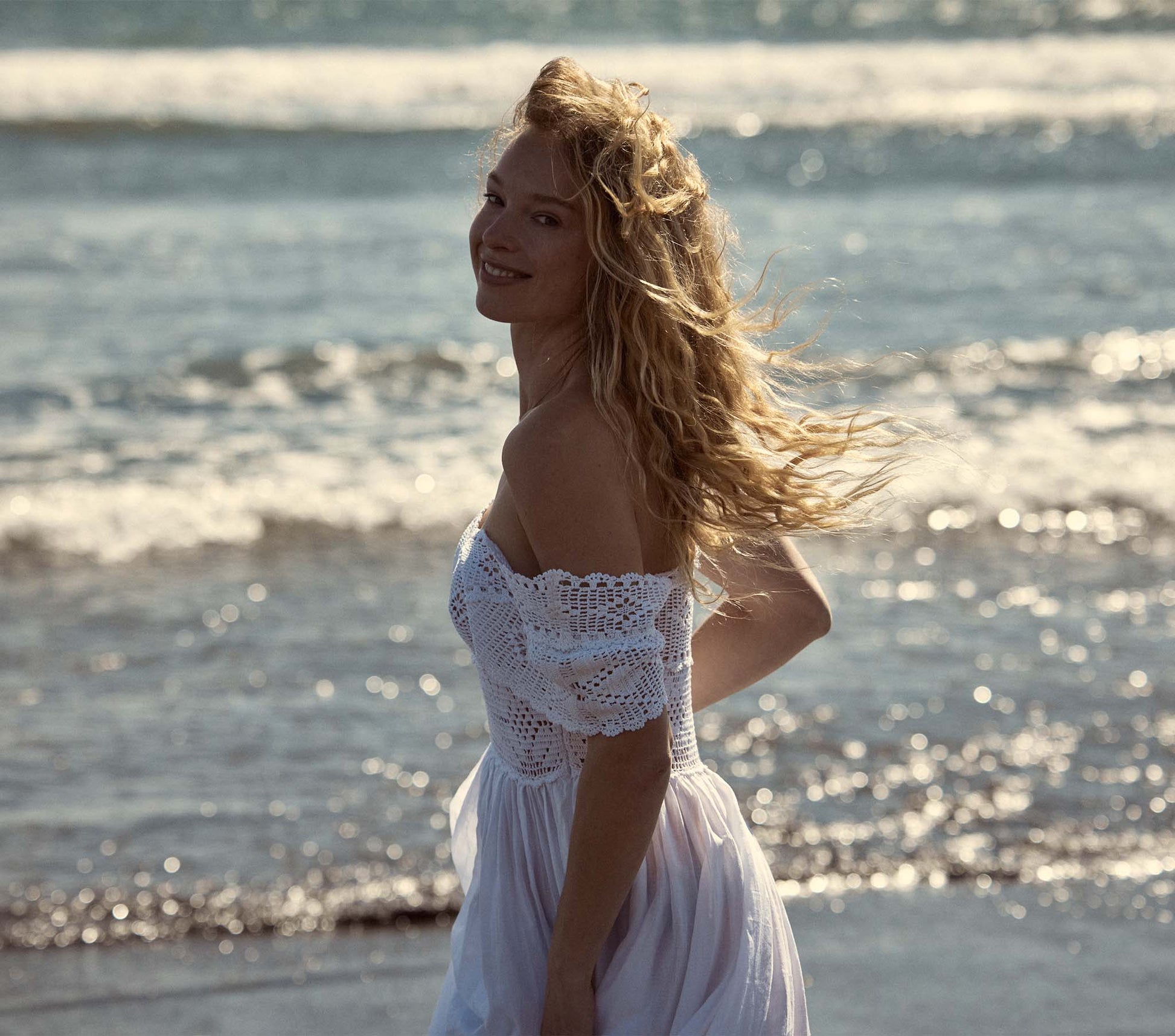 Crafted from sheer crocheted ramie, the Modeira blends the classic crochet dresses of the ‘70s with Regency-era charm. Delicately hand-crocheted scallop detailing frames the bold square neck and flutter sleeves. A side seam zipper creates a semi-sheer unlined fitted bust. Below the bust, a waist panel is adorned with a floral motif that calls back to detailing at the bust panel. The full-length skirt is shirred into the bust to create a subtle flow, culminating in a crochet inset design at the bottom of the skirt and a scalloped crochet edge.