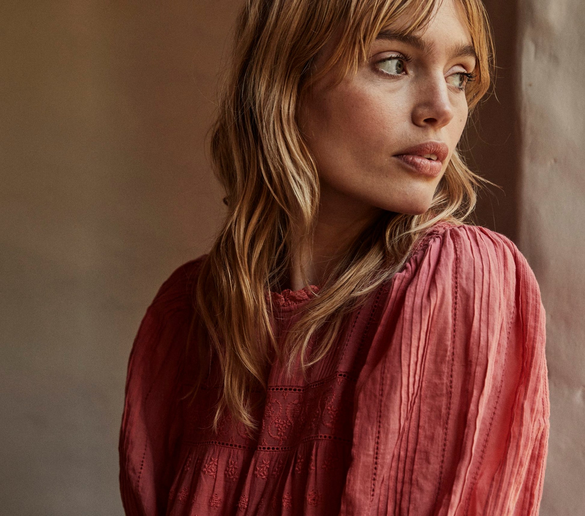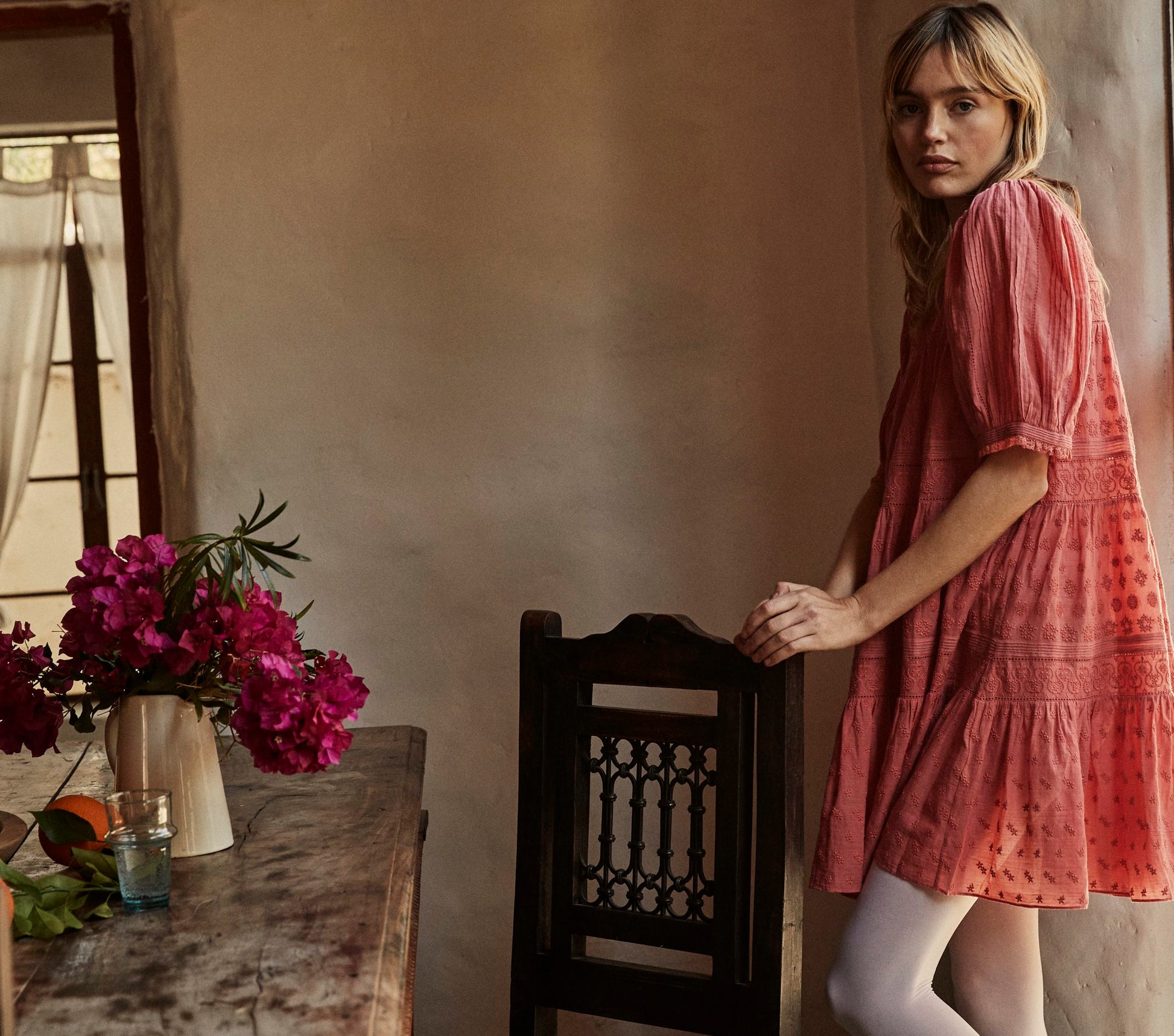 In 100% organic cotton voile, the DÔEN Nerine Dress is a confection of tiers and embroidered details, with ladder stitches and rows of pintucks framing orderly lines of blossoms. Lace trims the banded short puff sleeve cuffs and round neckline, adding to the romance of this breezy mini dress.