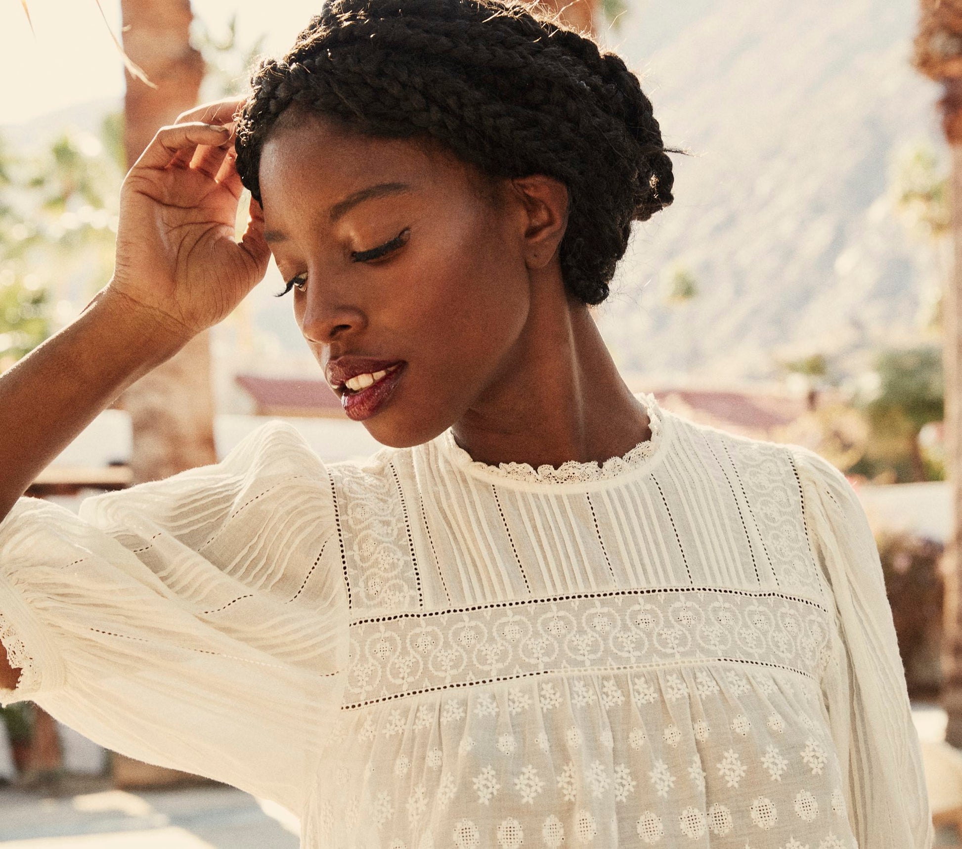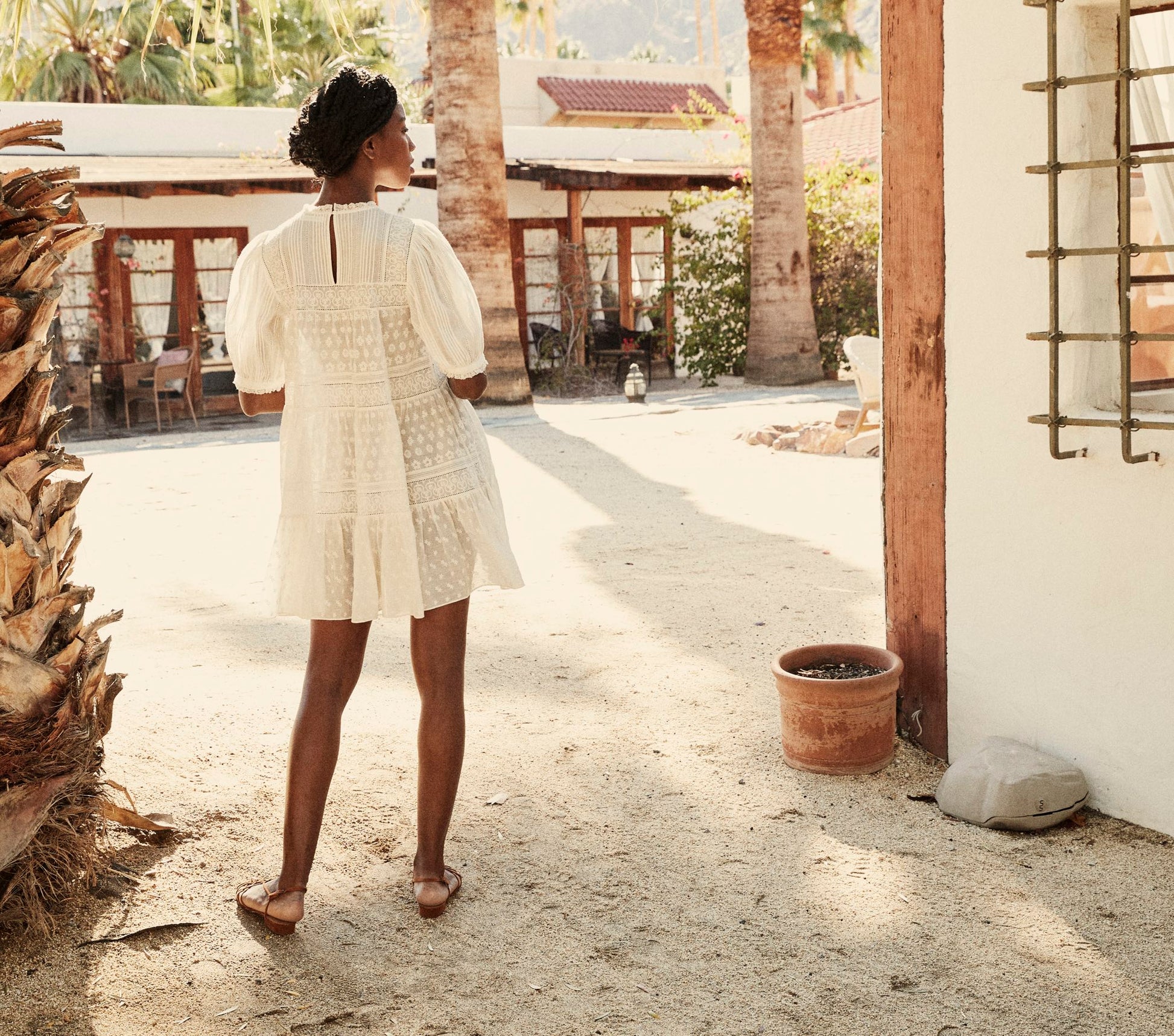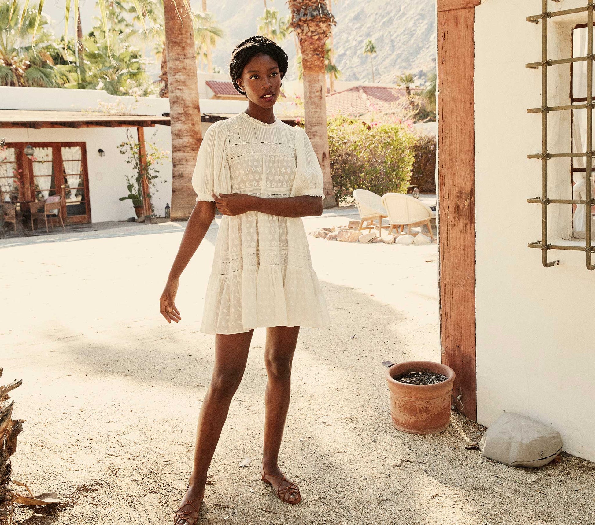 In 100% organic cotton voile, the DÔEN Nerine Dress is a confection of tiers and embroidered details, with ladder stitches and rows of pintucks framing orderly lines of blossoms. Lace trims the banded short puff sleeve cuffs and round neckline, adding to the romance of this breezy mini dress. Measurements Size Medium: Bust - 46.5" , Waist - 47 ", Bicep - 24.75 ", Sleeve Length - 13.25 ", Dress Length - 34 " Measurements Size XL: Bust - 51 ", Waist - 51 .5", Bicep - 26.5", Sleeve Length - 14 ", Dress Length - 35 1/8 " Miracle is 5'8" and wears the XS Made in India with Care Hand wash cold, lay flat to dry Dress is unlined - wear with skin tone undergarments or our Short Deep V-Neck Slip Styled with the Corsica Sandal