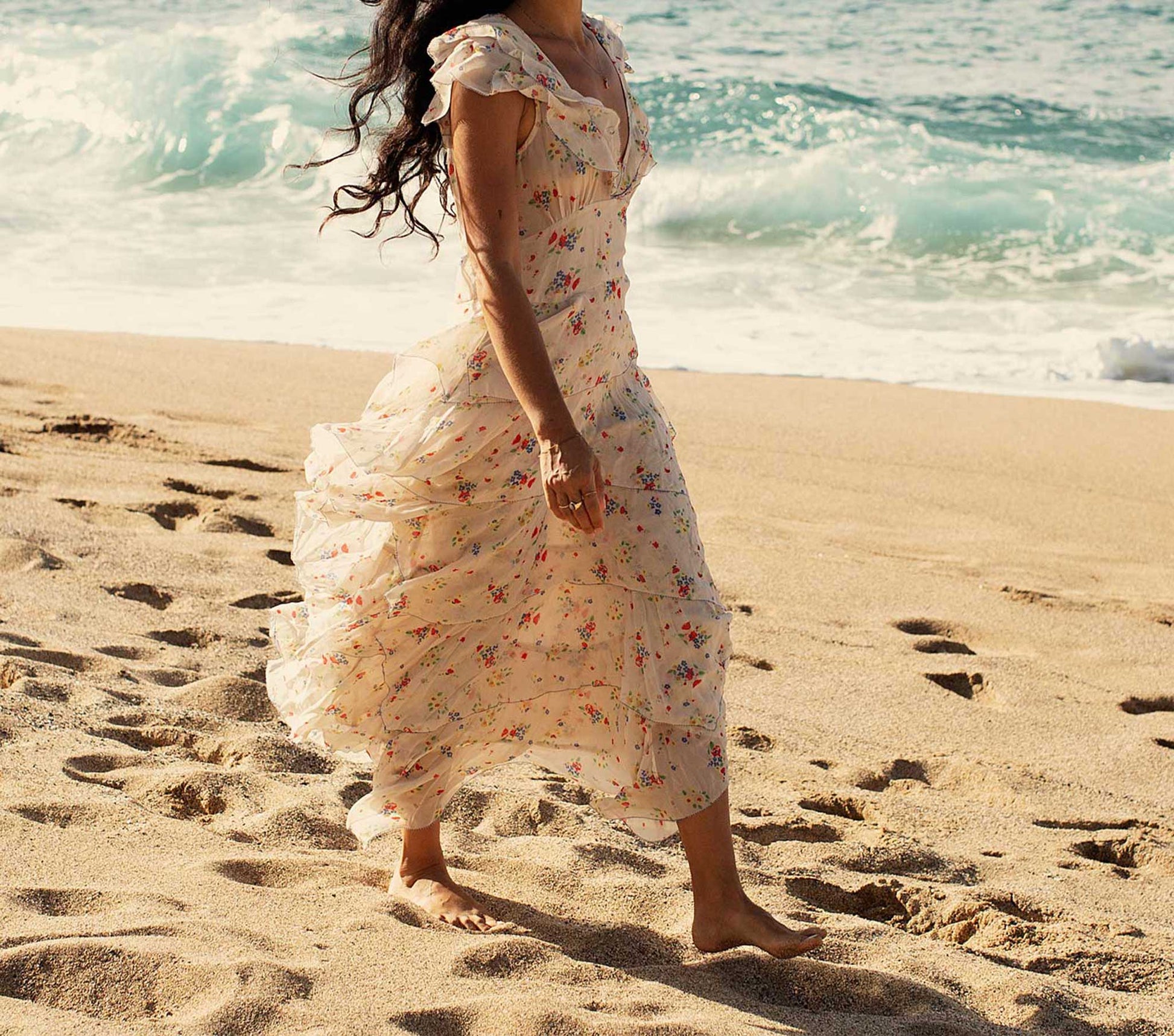 In 100% silk georgette, the DÔEN Nico Dress is a dress for making memories in. The V neck is framed by cascading ruffles that continue through the back for a capelet effect. Five tiers of handkerchief hem ruffles create a skirt silhouette rife with romance and made to flutter in the breeze.