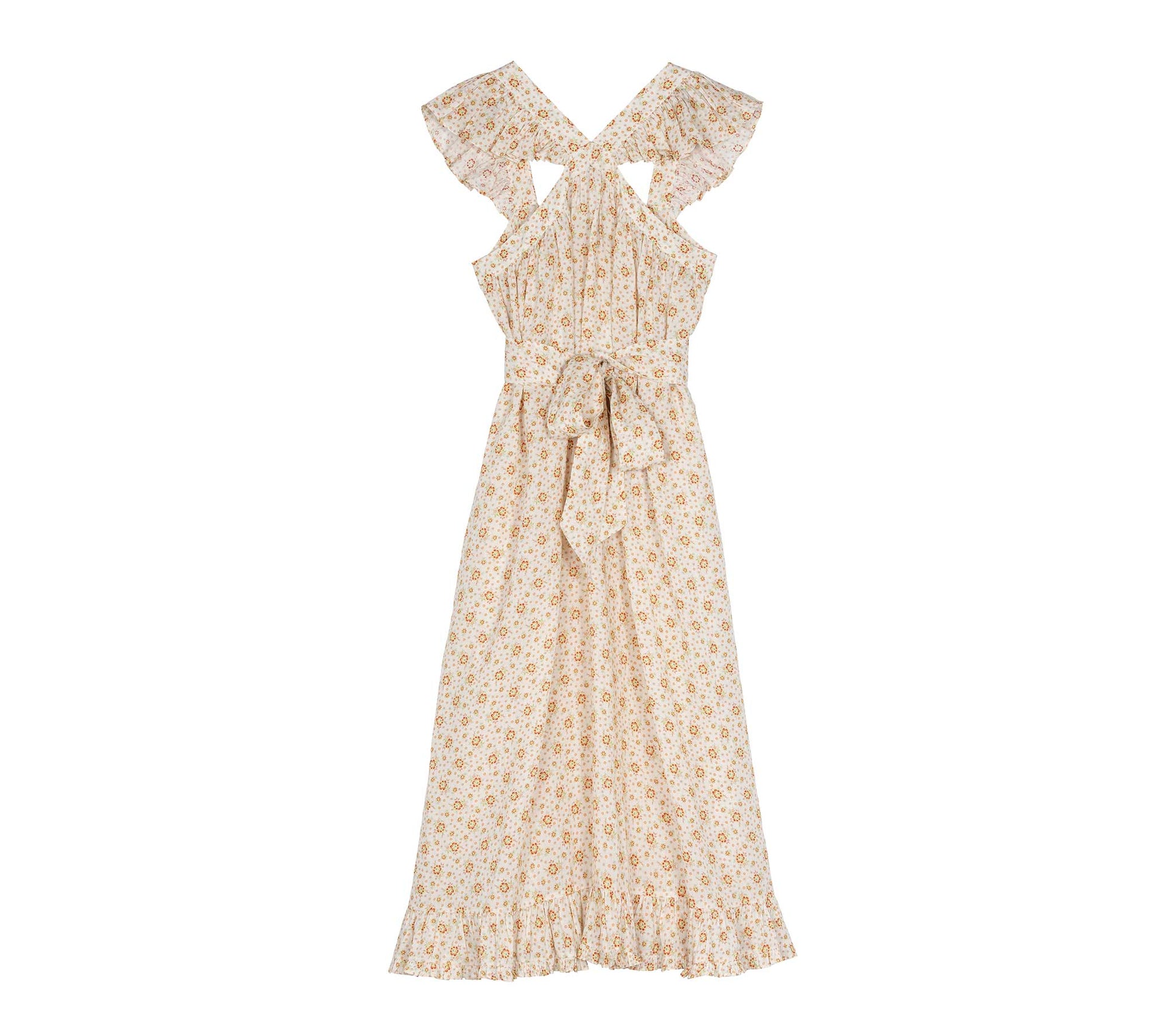 With a loose, comfortable full-length body and fluttering butterfly sleeves, the Nisha Dress is pure romance. Flowing gracefully from the high neckline, the open back makes this style an easy throw-on look to bring brightness to any day. The V-neck yoke band is adorned with a ruffle and tiny micro-edged lace, calling back to the lace at the hem. Cinch the waist for easy elegance, or wear loose to summon classic charm.