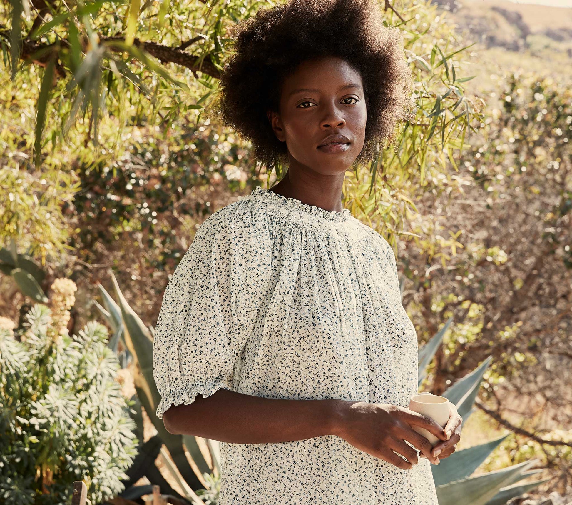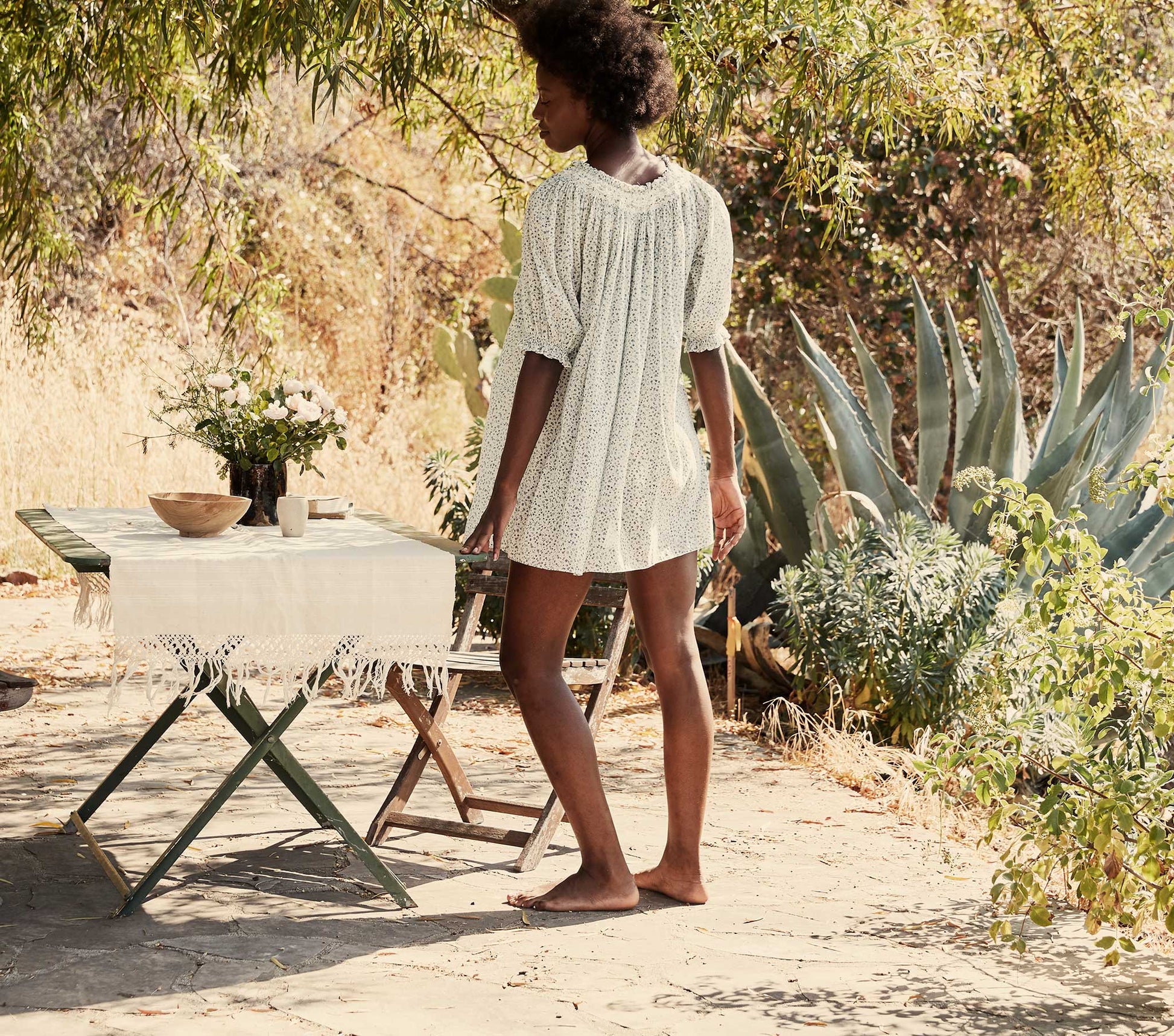 In 100% organic cotton voile, the DÔEN Odessa Nightgown is a semi-sheer summer daydream, a mini dress to curl up in at the end of long summer days, to wear as a beach cover-up or tuck into shorts in a pinch. Smocking at the neckline is finished with a standing ruffle echoed at the puff sleeve hems. Gathering at the yoke extends to create a tent shape for an easy piece you’ll wear through the warmest days and beyond.