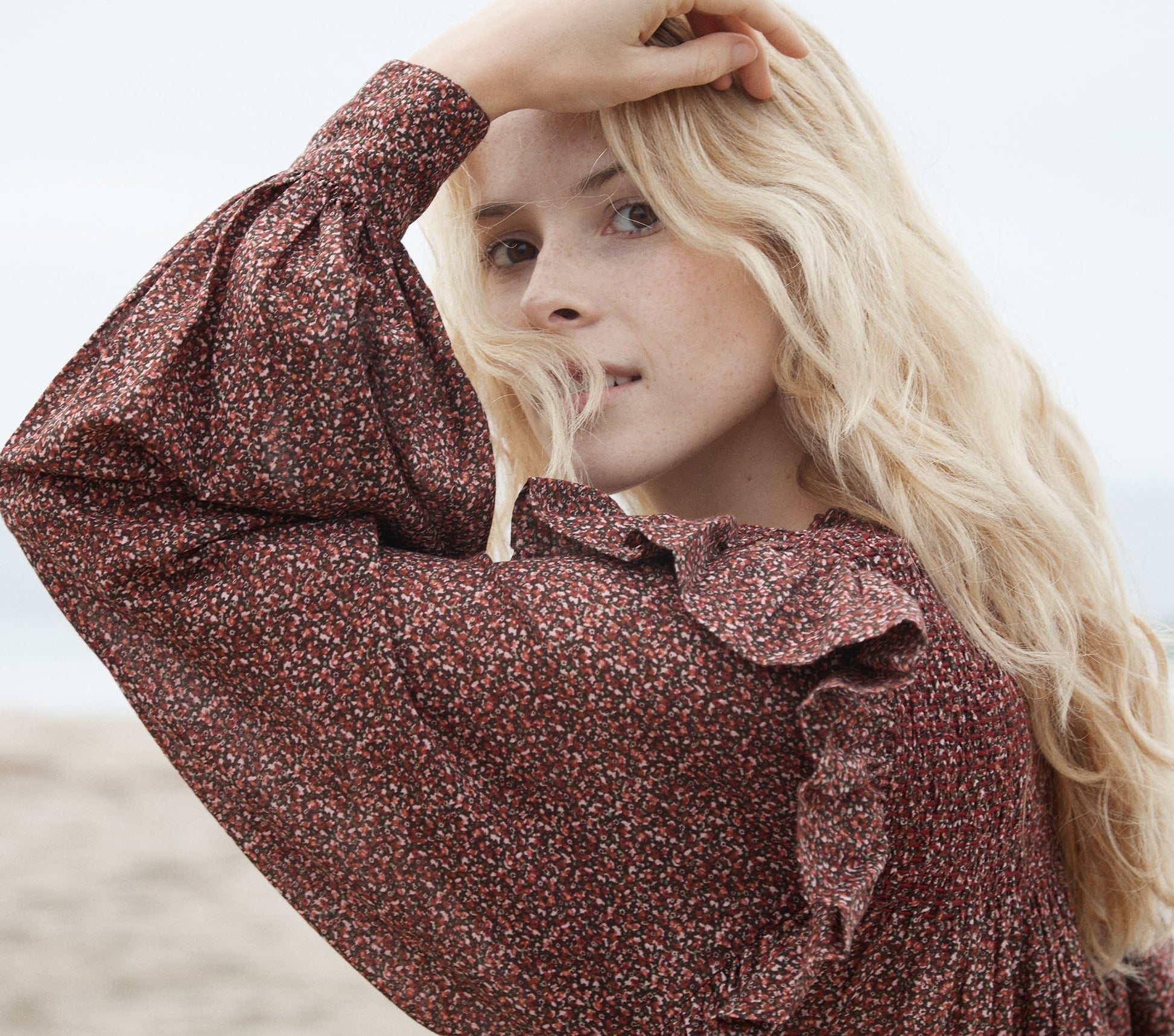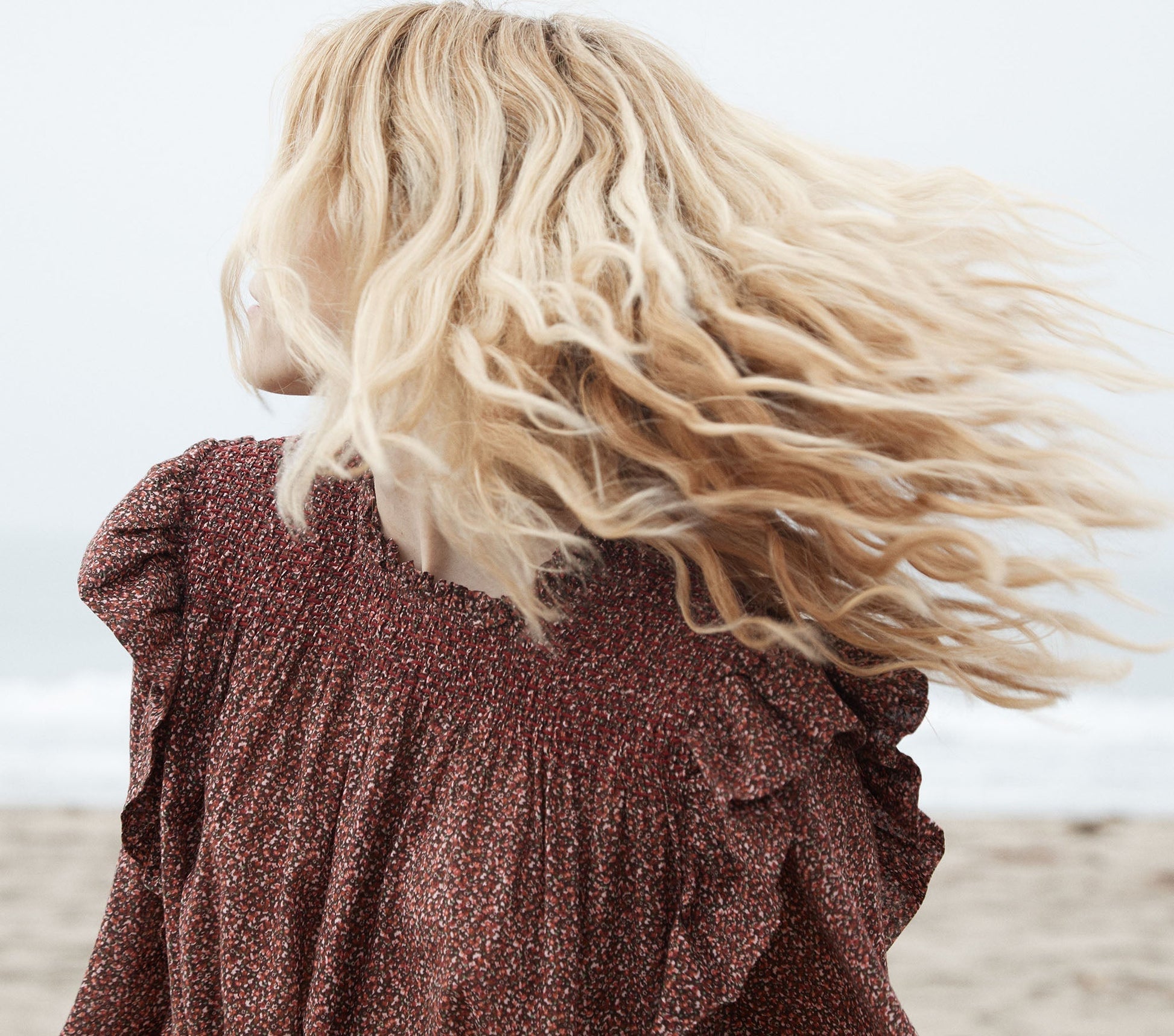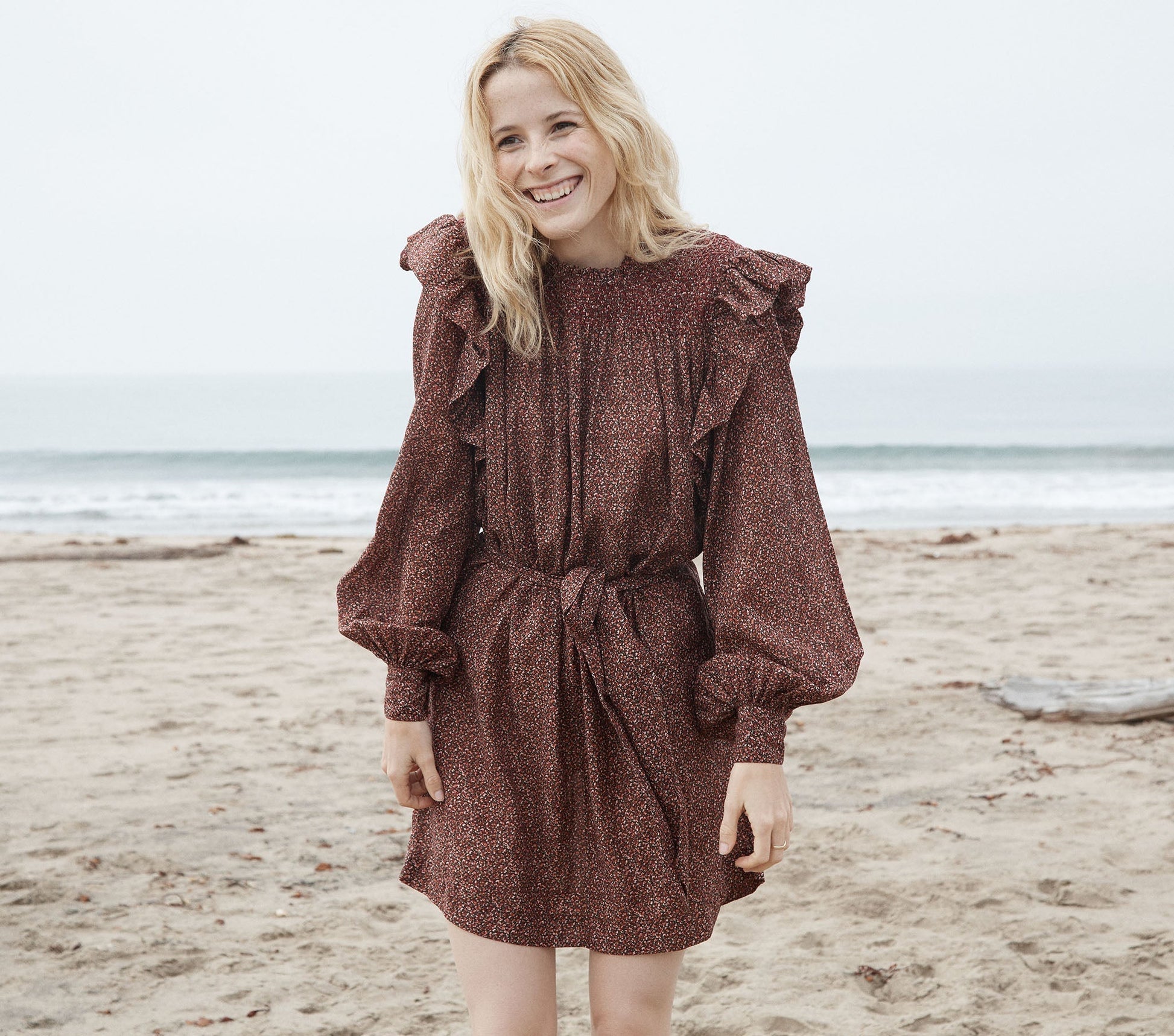 In a cotton/viscose blend, the DÔEN Oliver Dress is a 1970s style minidress, updated for the modern day with statement details like ruffle-rimmed shoulders and red contrast smocked stitching. Traditional shirt cuffs highlight the full effect of the floaty sleeves, and the loose, boxy shape can be belted with the self belt or left free and breezy.
