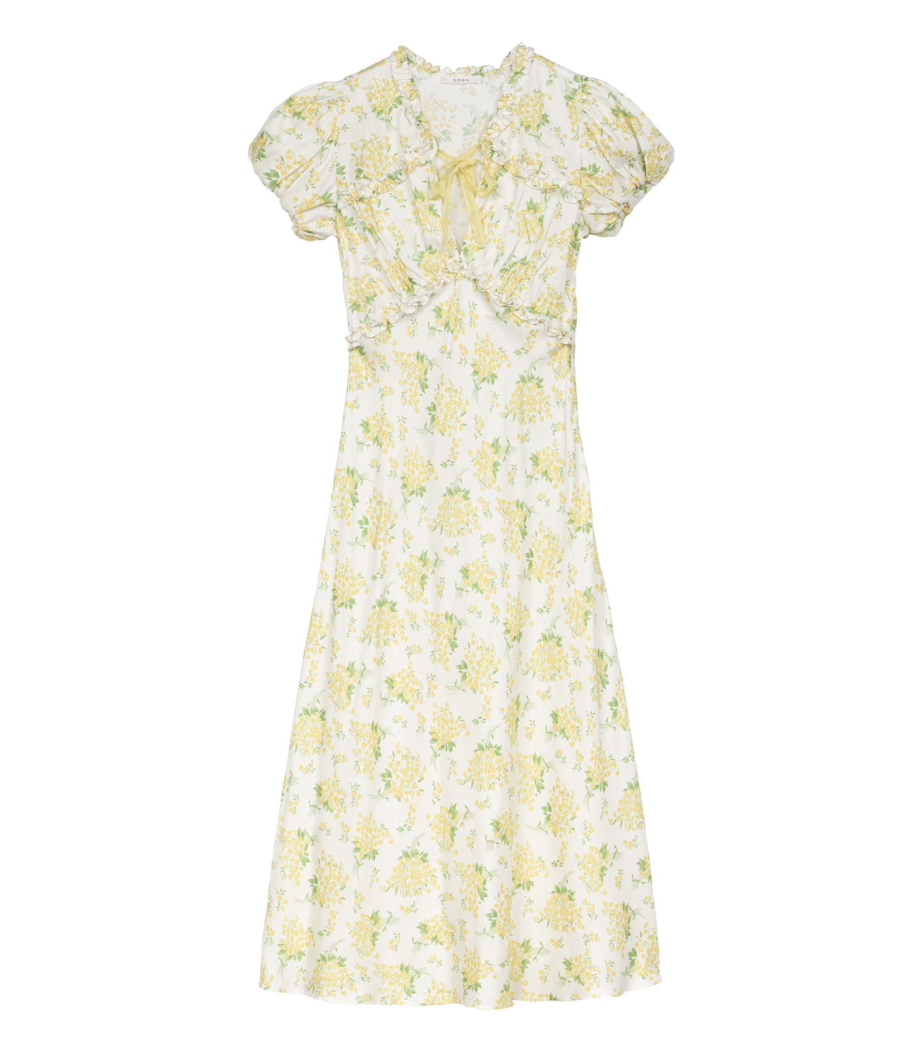 Taking cues from the silhouettes of ‘30s bed jackets, the Orianna Dress— in a swingy blend of silk and viscose—features short puff sleeves, a lemony yellow silk ribbon at the center front, and the prettiest ruffle details, while an invisible side zipper gives way to a flowy bias-cut skirt.
