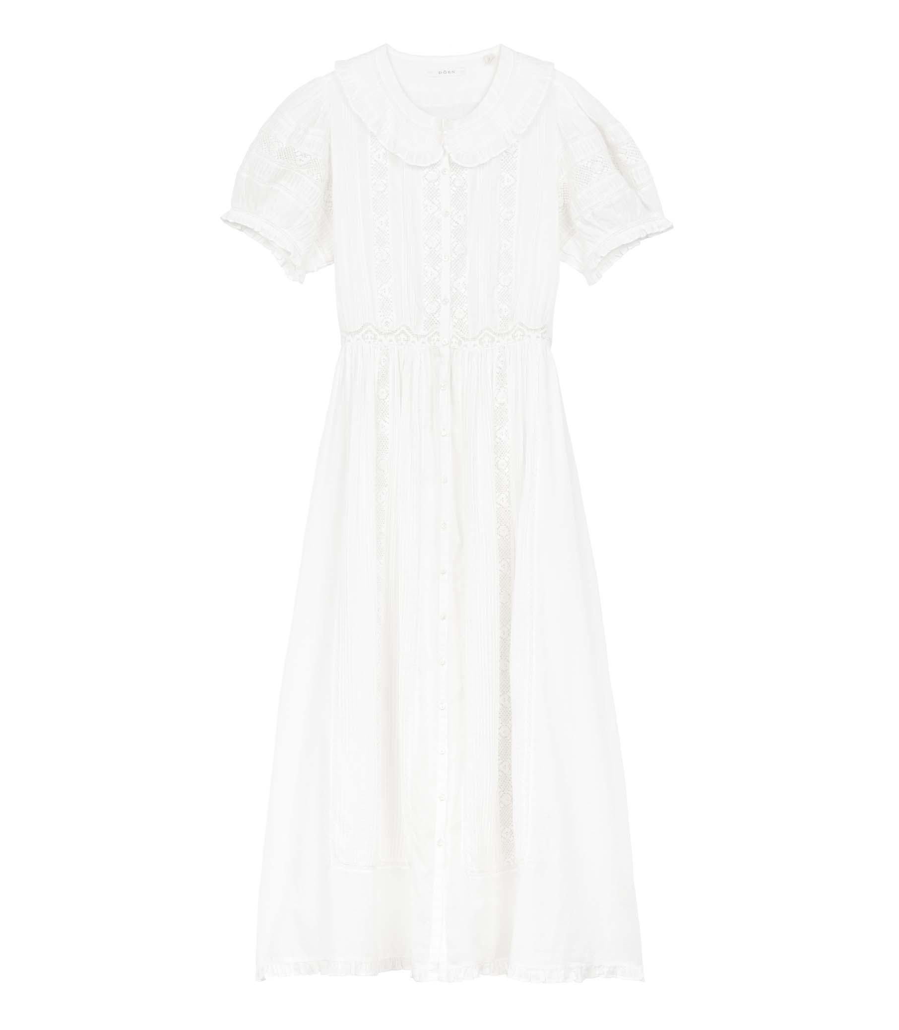 Crafted from the softest organic cotton voile, the Victorian-inspired Phoebe Dress features a Peter Pan collar and short puffed sleeves adorned with alternating panels of pintucks and inset lace. Clustered pintucks lend texture to the bodice, while mother-of-pearl buttons extend down the front. The collar, sleeves, and hem are adorned with a cotton voile ruffle, and a fitted waist gives way to an ankle-grazing skirt.
