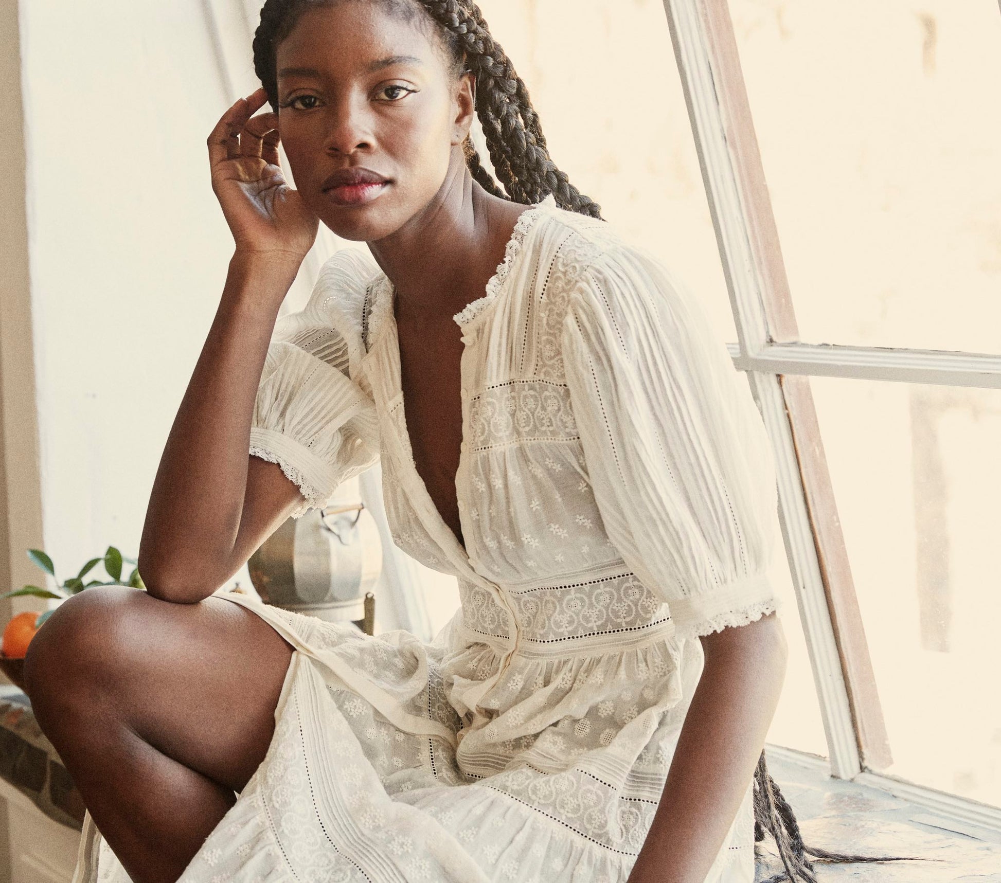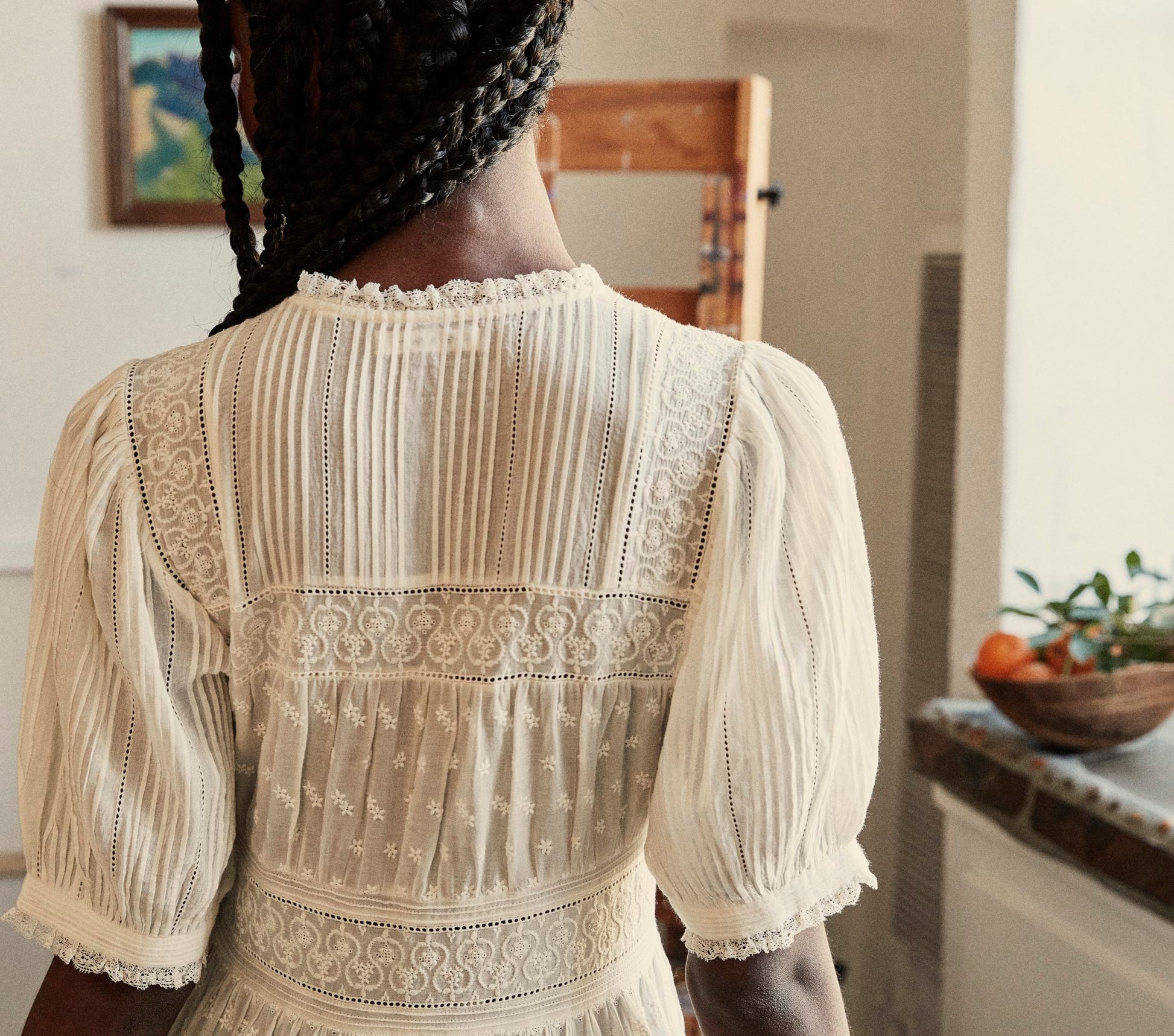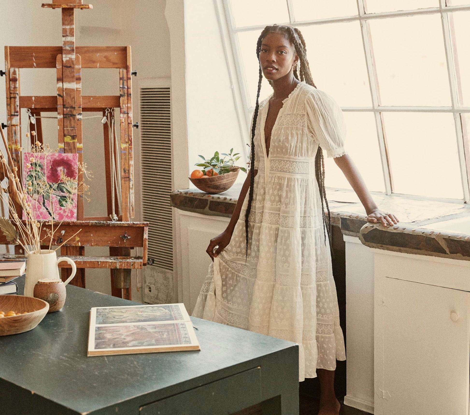 In 100% organic cotton voile, the DÔEN Rolande Dress is a button-down delight, trimmed with lace and rich with floral and geometric Victorian-inspired embroidery. A panel of horizontal pintucks creates a fitted waistline from which extends a series of widening tiers to make a full, ankle-brushing skirt.