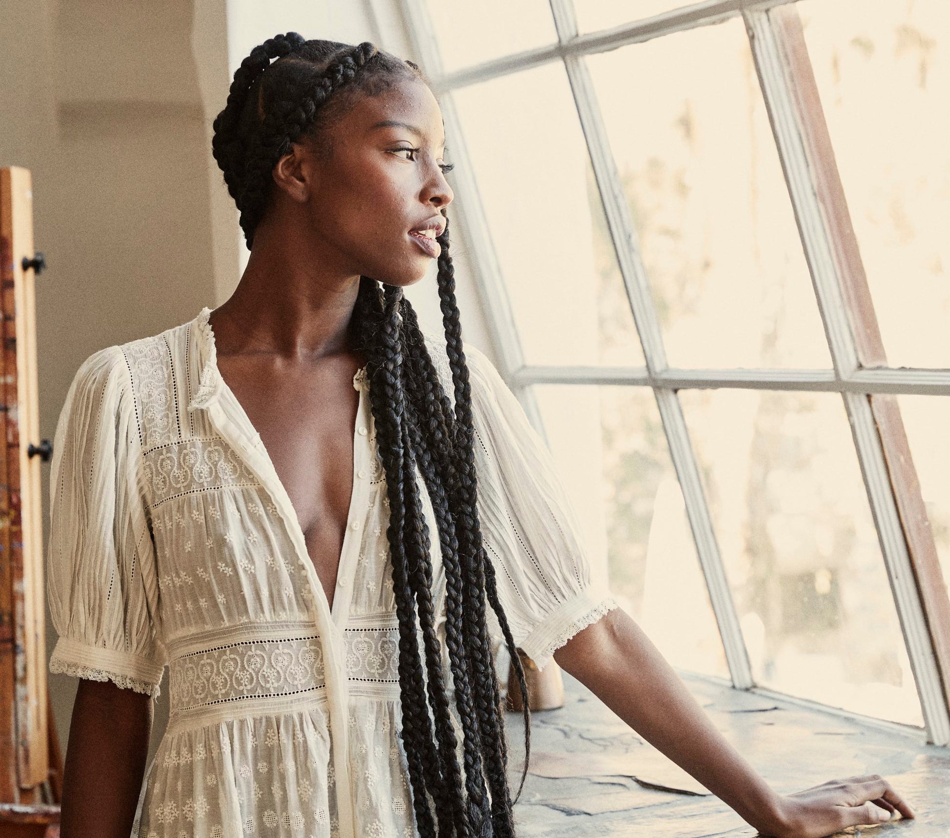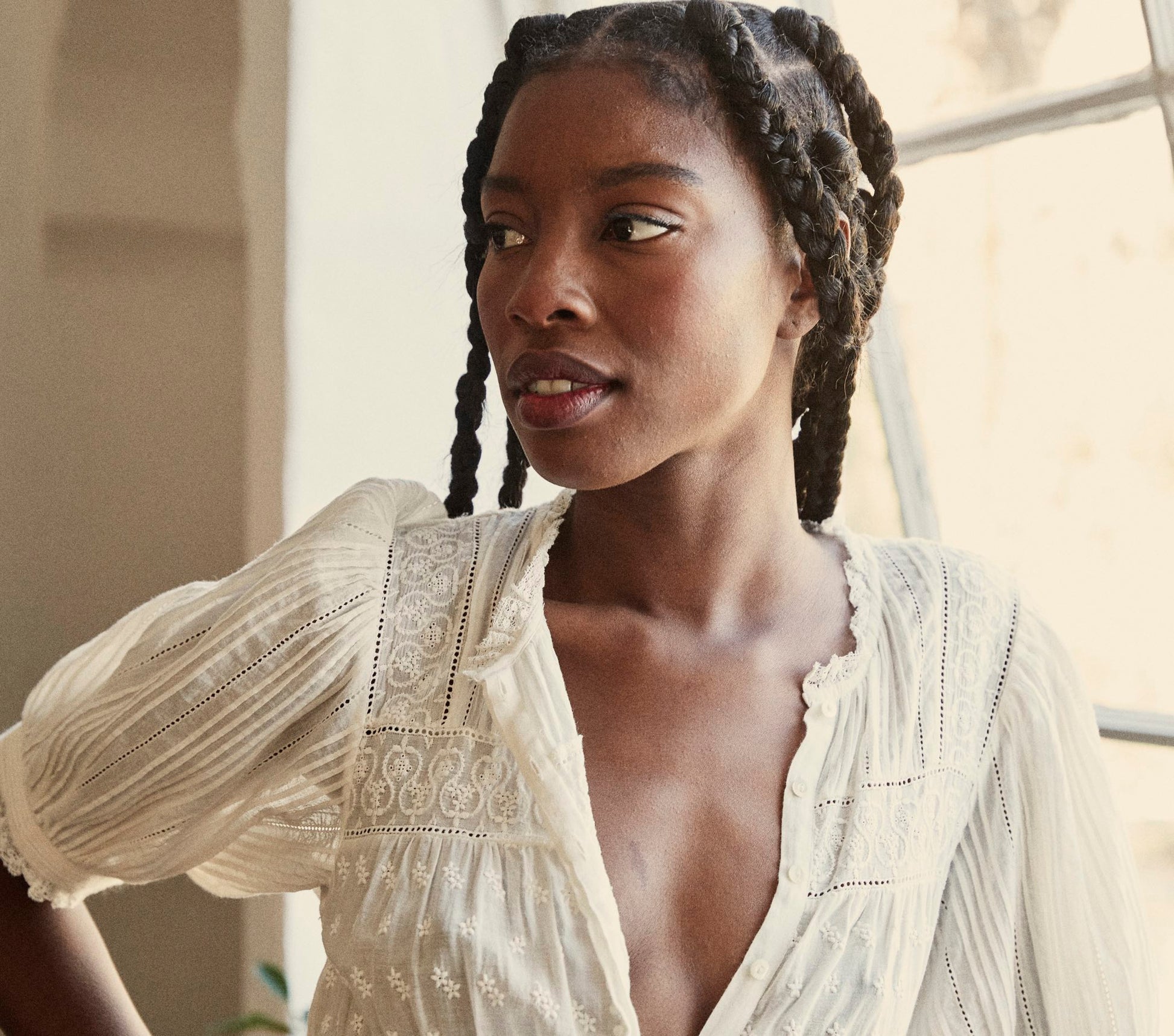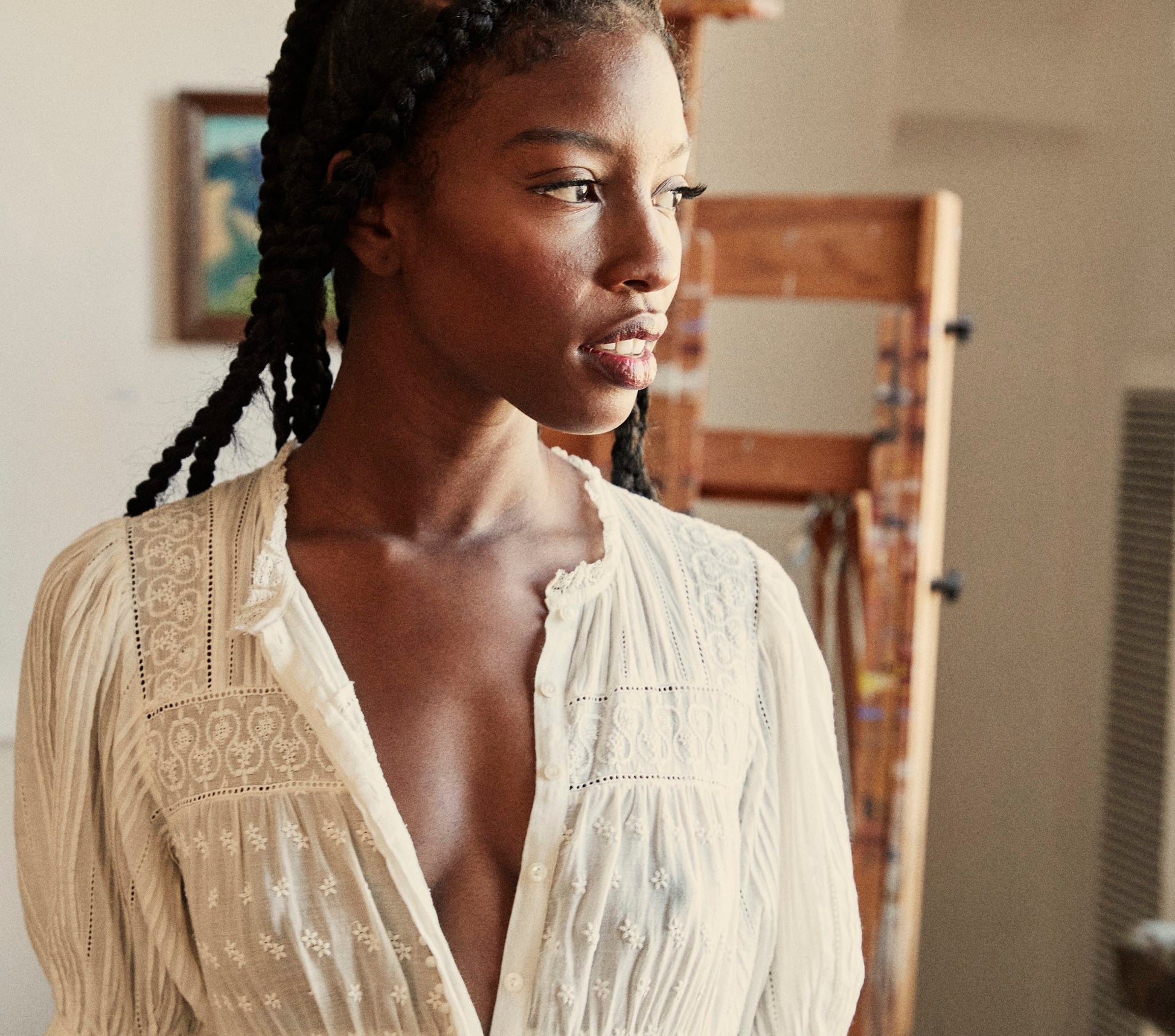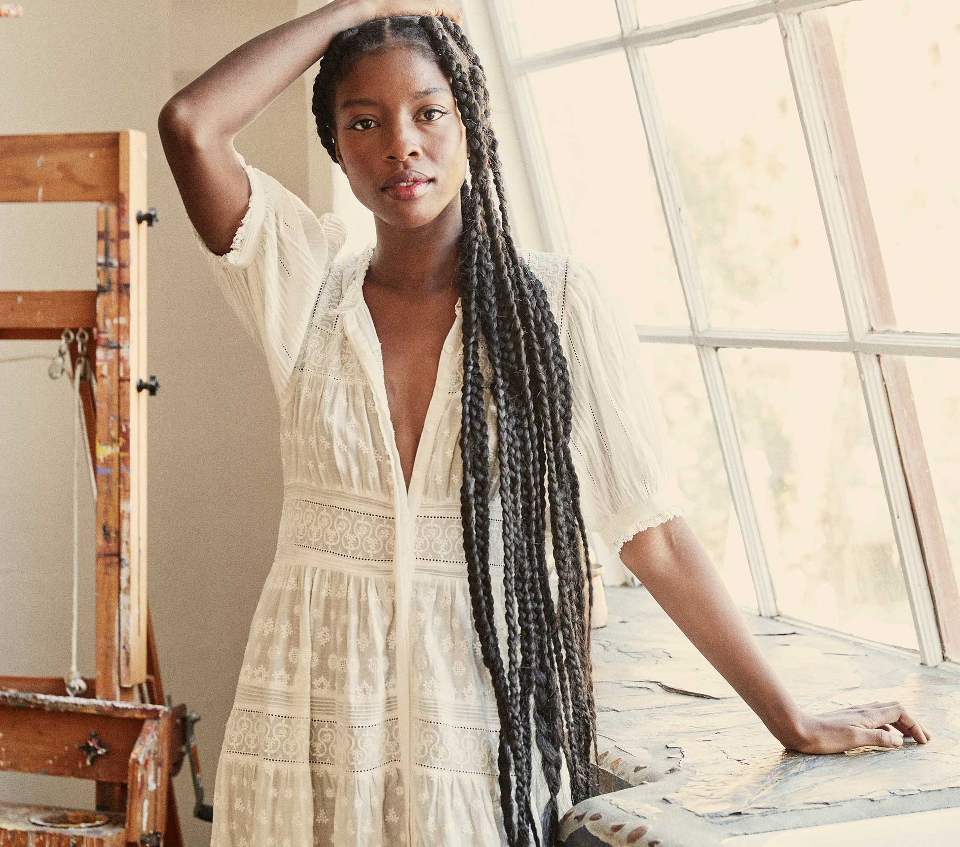 In 100% organic cotton voile, the DÔEN Rolande Dress is a button-down delight, trimmed with lace and rich with floral and geometric Victorian-inspired embroidery. A panel of horizontal pintucks creates a fitted waistline from which extends a series of widening tiers to make a full, ankle-brushing skirt.