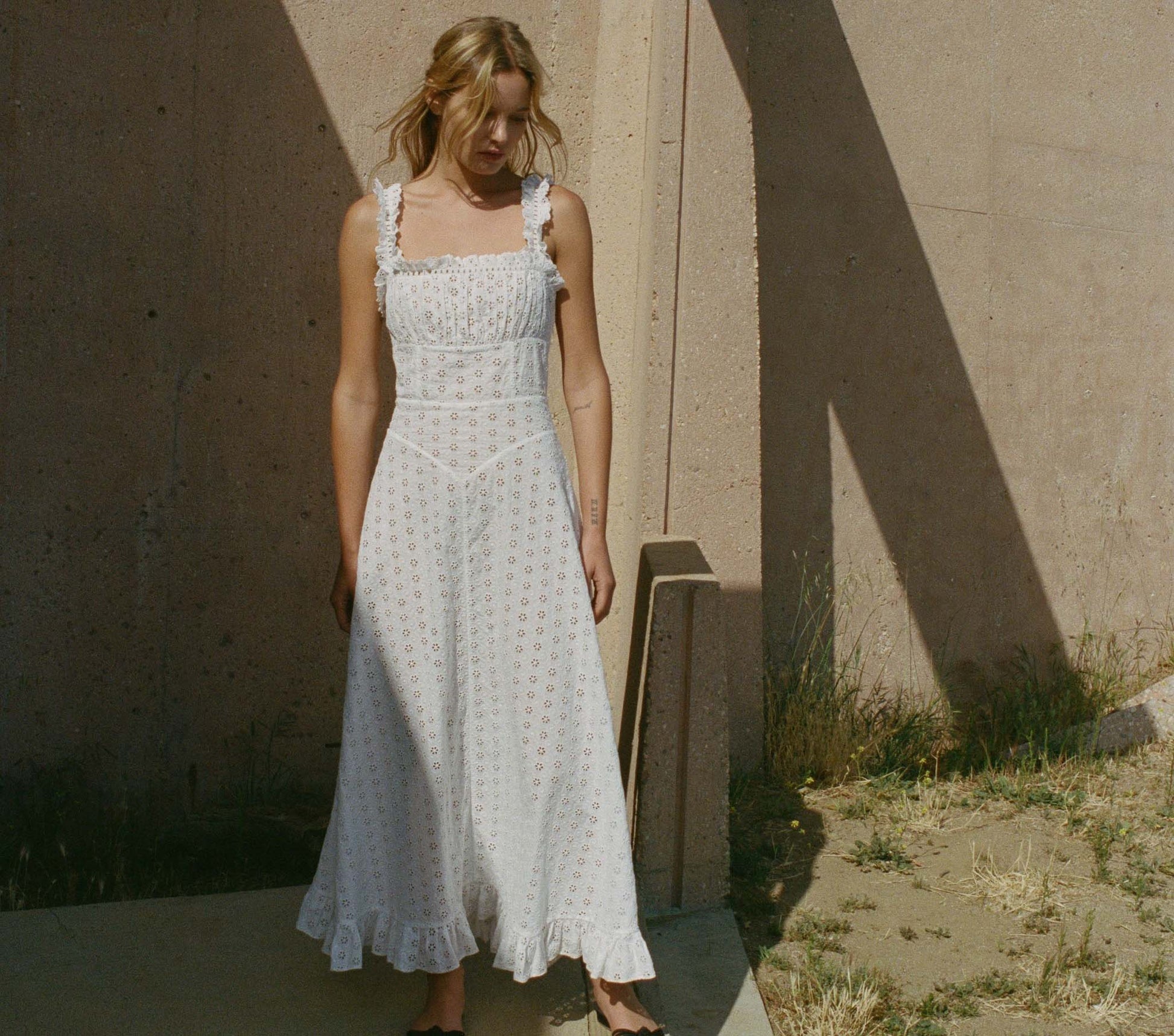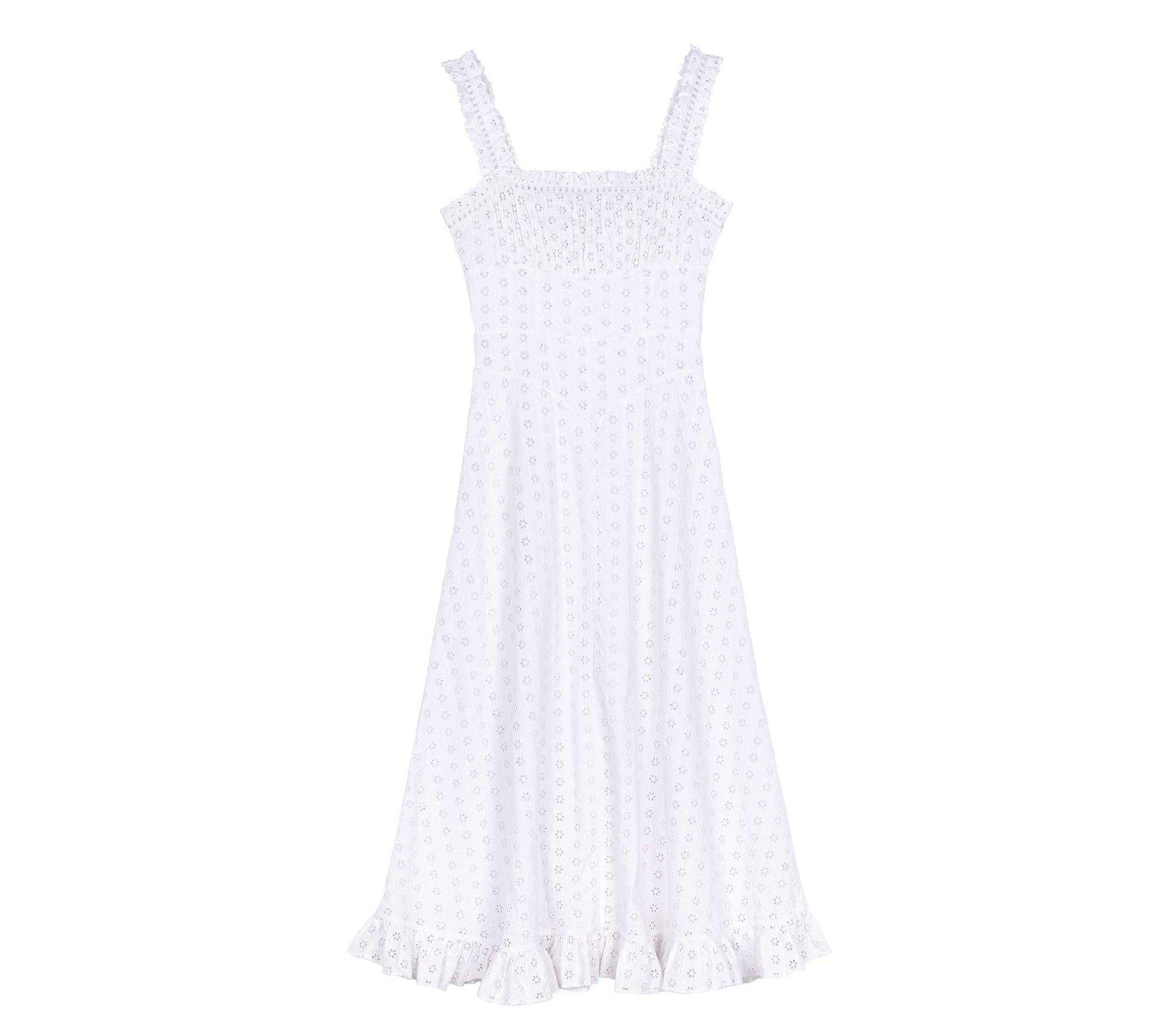 Crafted from a playfully sheer eyelet design rendered in lightweight cotton voile, the Roma Dress upgrades a classic summertime tank dress silhouette with vintage elegance. The shoulder straps are crafted from embroidered eyelet trim, and framed on all sides with decorative ladder trim stitching. The shirred bust panel lends volume, while princess seams at the waist panel add a lovely fitted effect, cinched in with a hidden zipper for the perfect fit. The full-length skirt is adorned with a petite ruffle that flutters with every step.