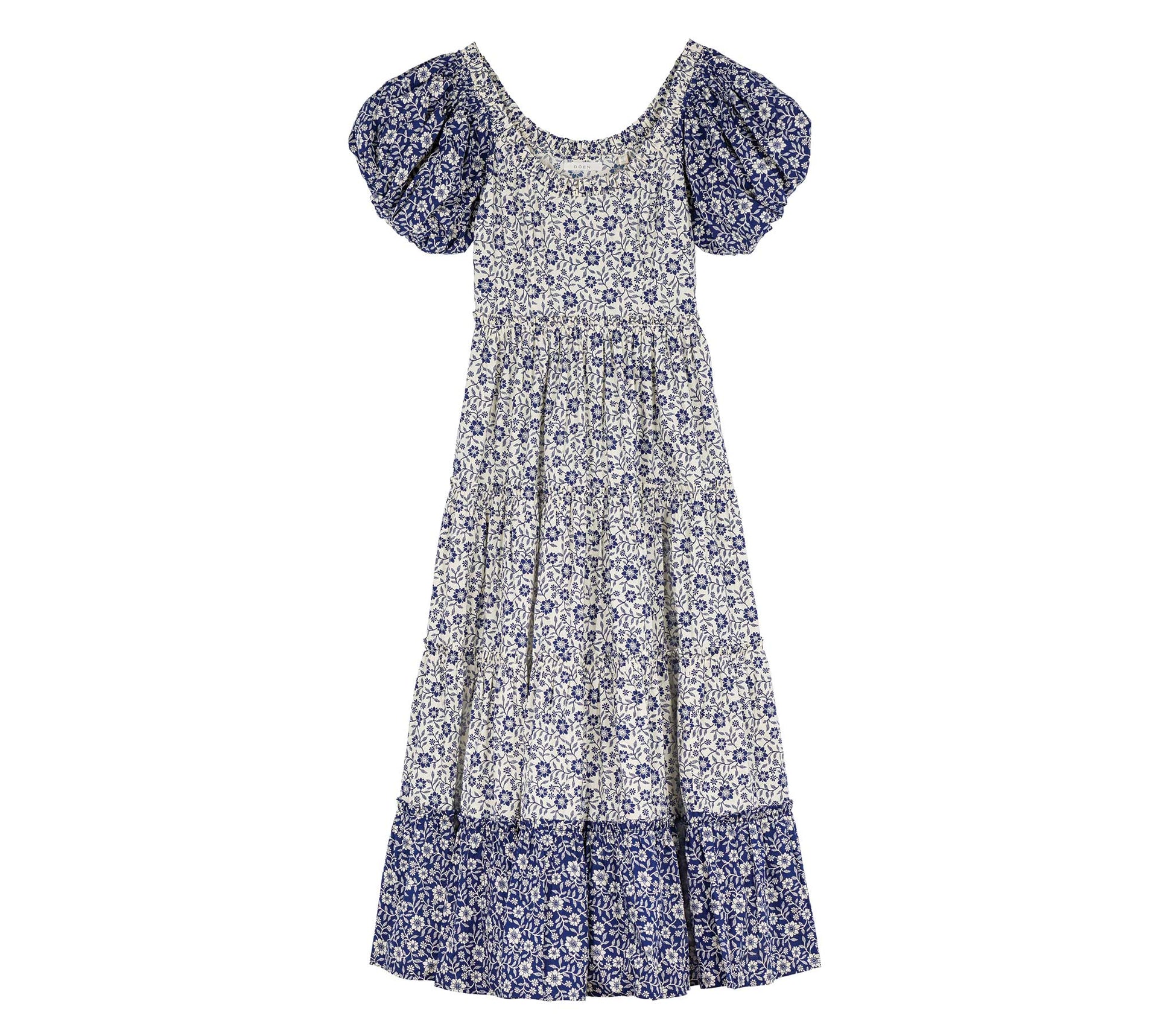 With full sleeves and a skirt ruffle cut from dark blue calico, and a body and skirt in cream, the Simonetta’s construction is reminiscent of classic French dresses. The scooped neckline is shirred in with a flat ruffle and framed on each side by the voluminous puffed sleeve, which is lined with encased elastic for added fullness. Princess seams at the fitted bodice are cinched in with a hidden side zipper and flare out to a full skirt, whose four panels each culminate in a petite ruffle. A final ruffle at the hem of the long, airy skirt completes its countryside charm.
