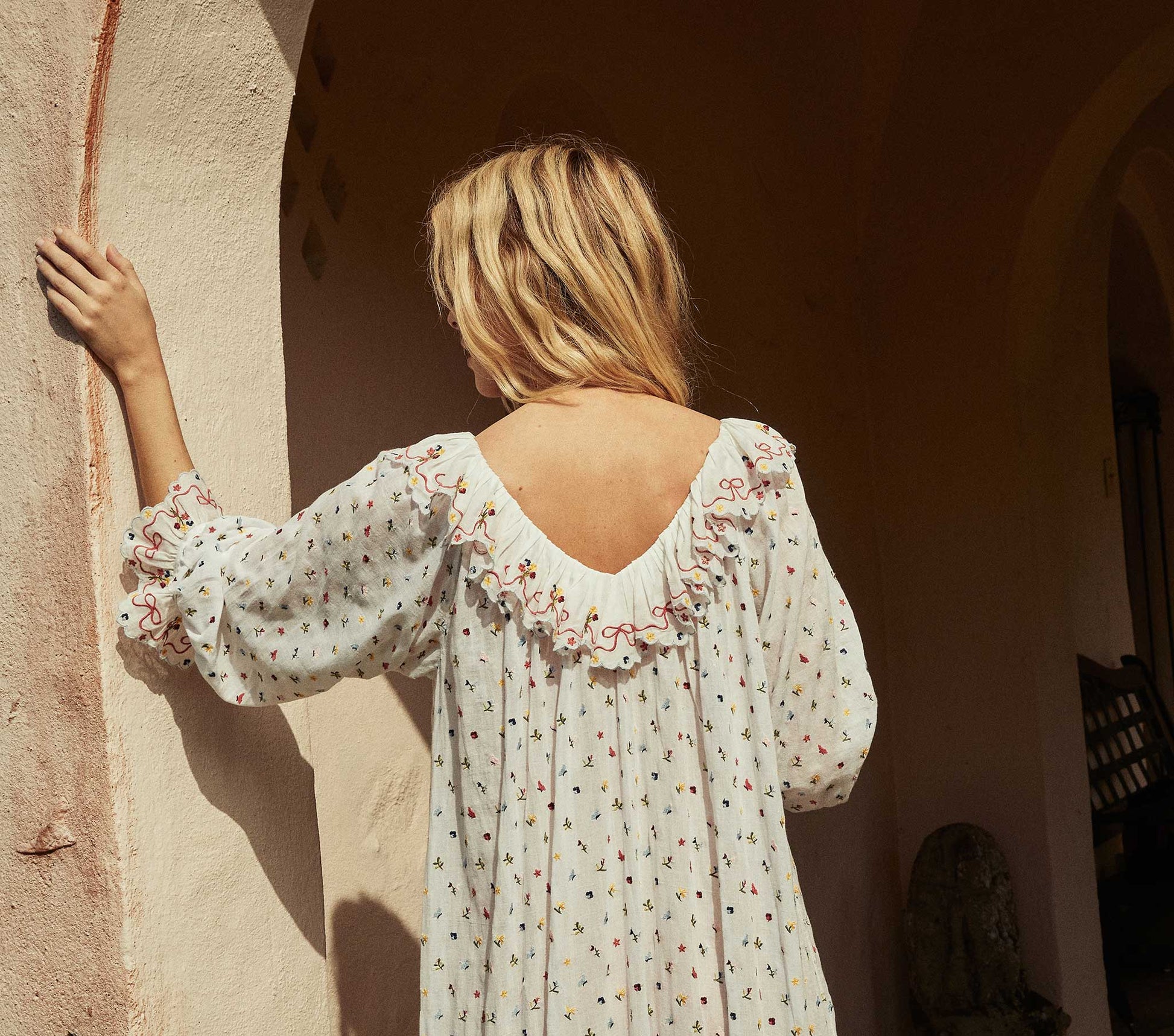 The Solaris Nightgown is our go-to for lounging and dreaming, blissfully soft to sleep in, beautiful enough to wear out into the wider world. Wide sleeves finished with a ruffle mirror the generous fullness of the body, which is delightfully roomy on chilly spring nights. The wide collar and cuffs are trimmed with scalloped ruffles, and accented with sweetly embroidered bows. A single tier finishes the midi-length hem, swaying gracefully with every step.