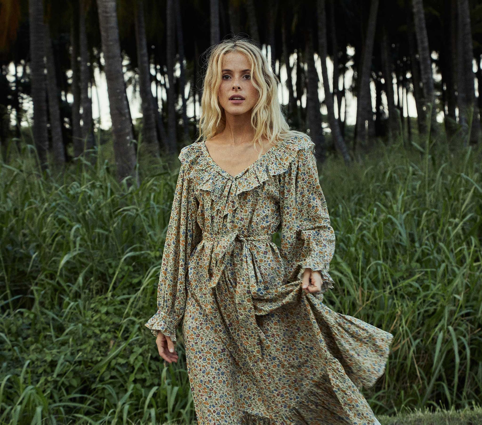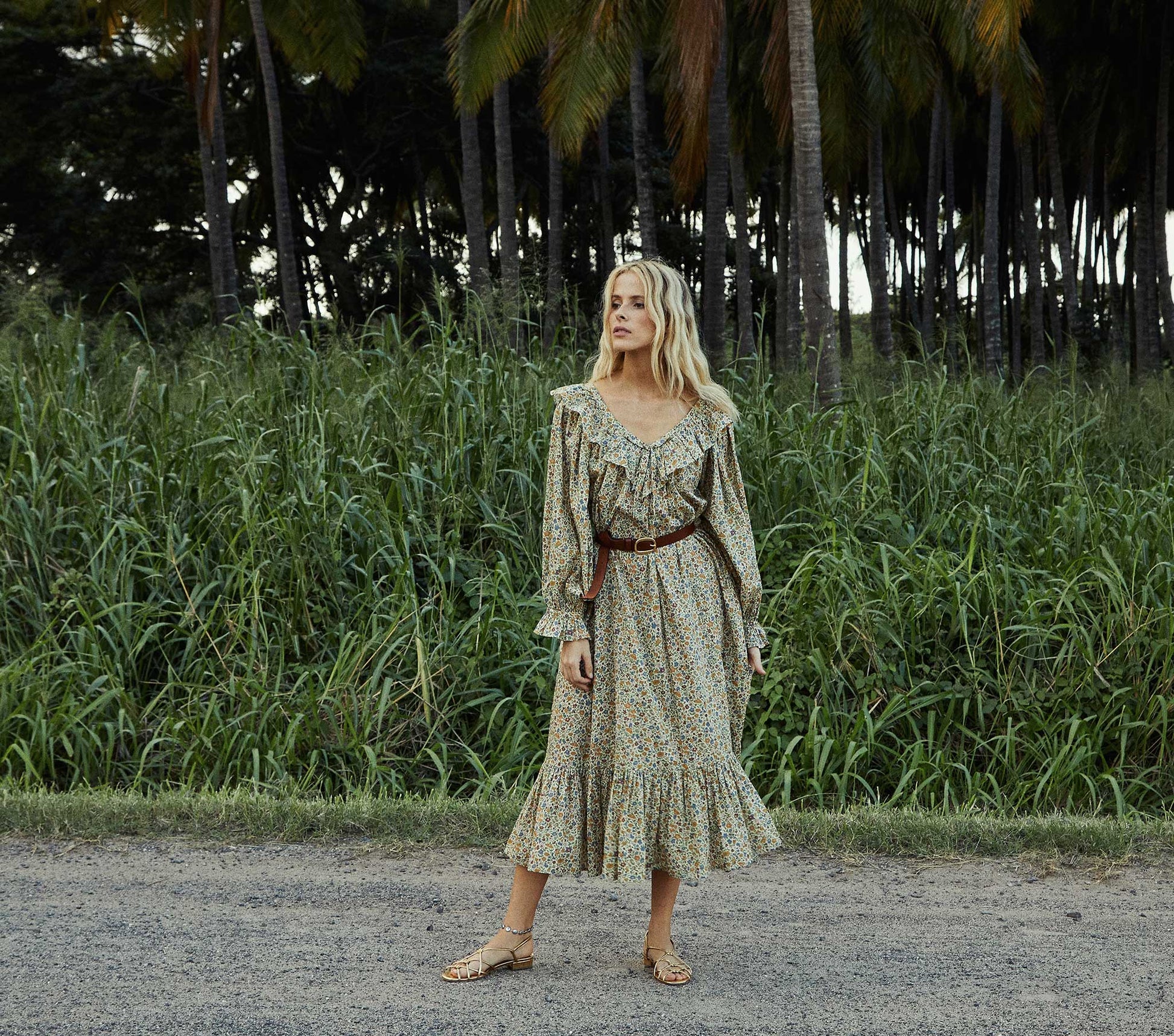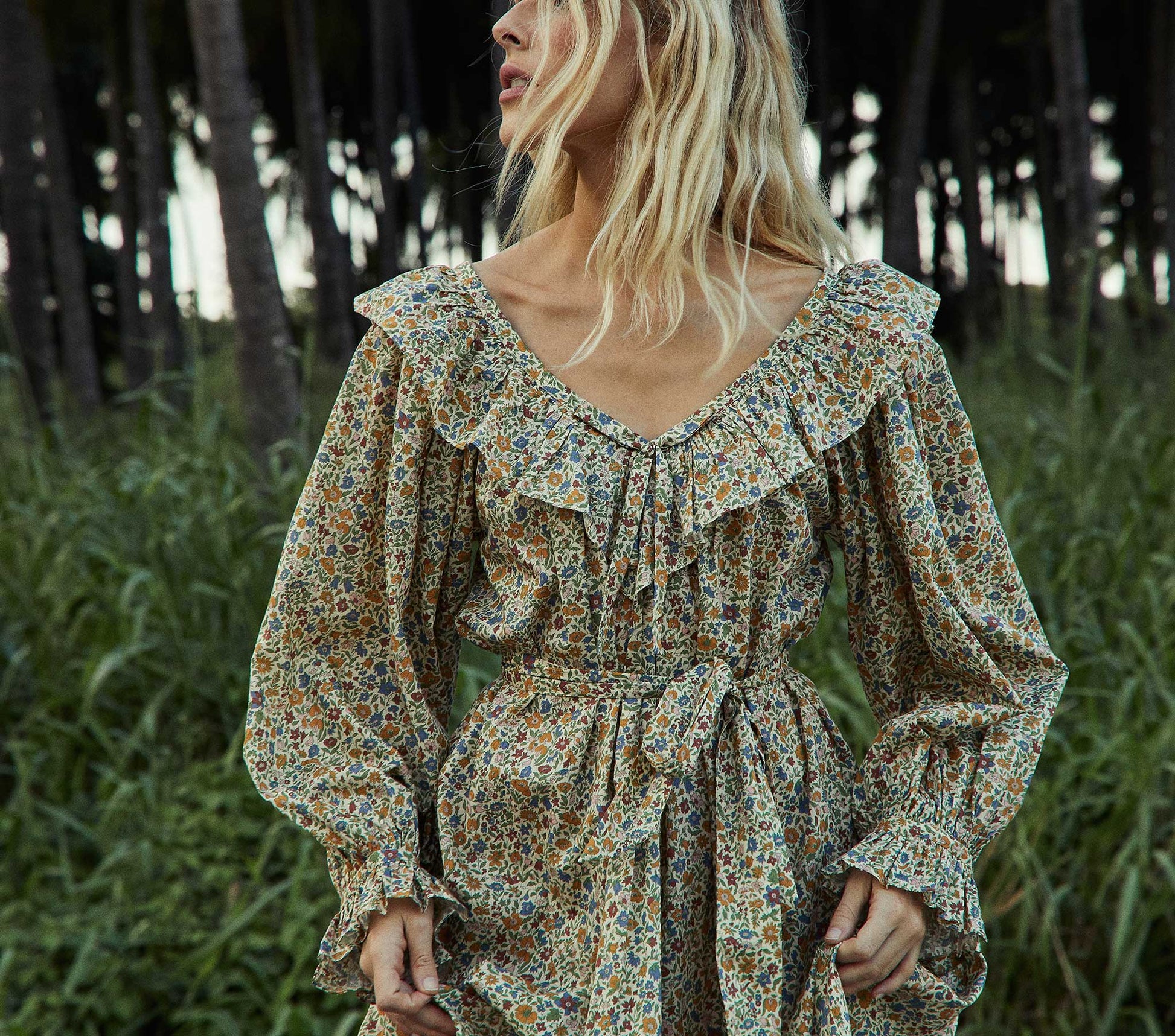 Channeling romantic inspiration, the Veredis Dress is an ode to the joys of springtime. The deep V-neckline is adorned with a ruffle and a tacked center front bow, bringing playful energy to this classically feminine confection. Generously long sleeves culminate in a petite ruffle, while the full-body flows down from the neckline to the ankle, where a ruffle adds a final touch. The matching belt allows you to tie a second bow around the waist, or leave it loose to float in the breeze.