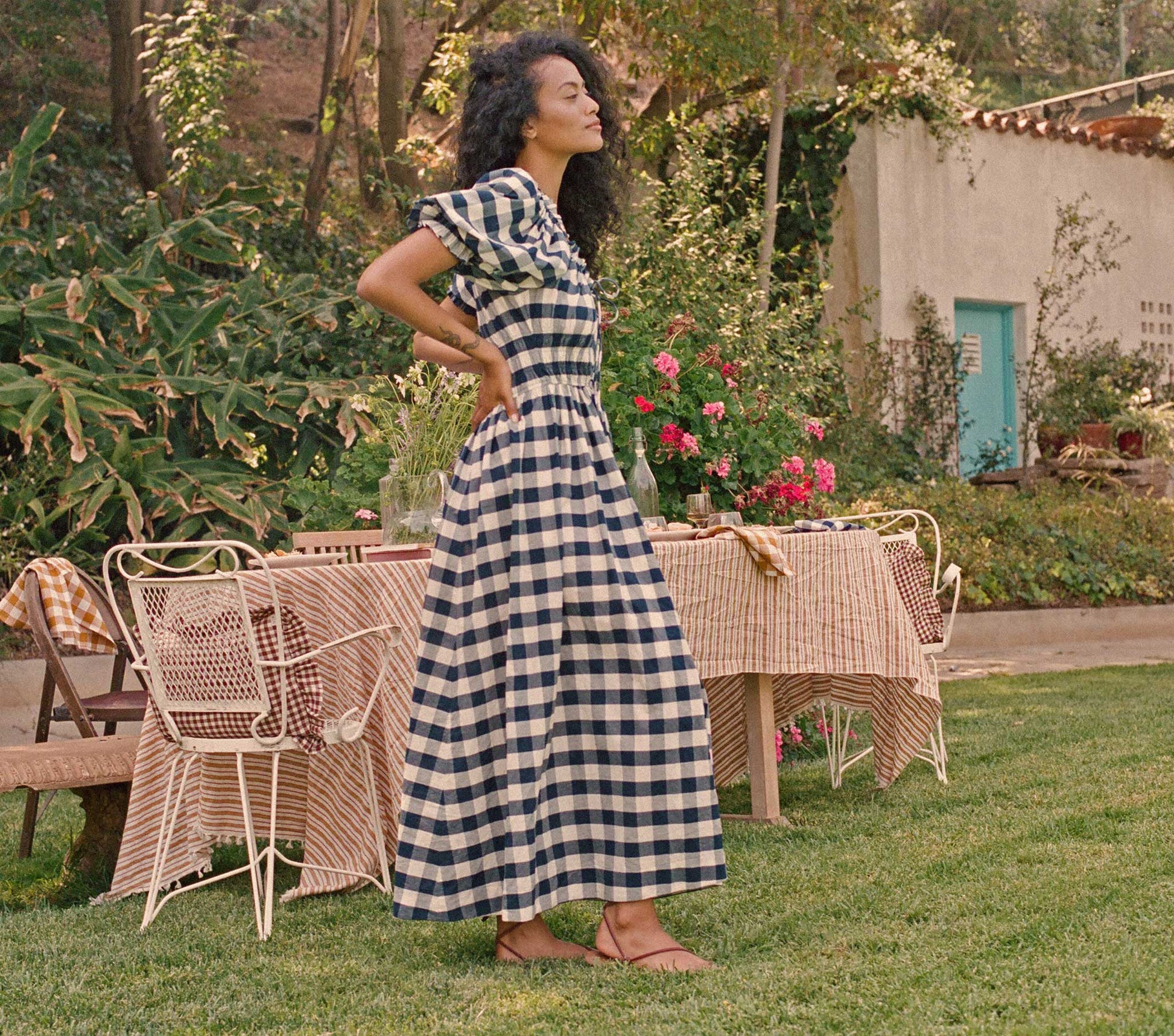 The Victoire Dress is brimming with classic countryside charm. With a smocked waist, full skirt, and delicate puff sleeves, this silhouette is inspired by the classic Victorian garden dress. A decorative tie at the center echoes the look of the functional tie at the adjustable drawstring waist, with three rows of elastic to create shape. The elastic neckline can be worn demurely high, or pulled off the shoulders to bring a contemporary verve to this sweet style. This piece was created in collaboration with our friend Heather Taylor, an LA-based textile designer. Click here for more.