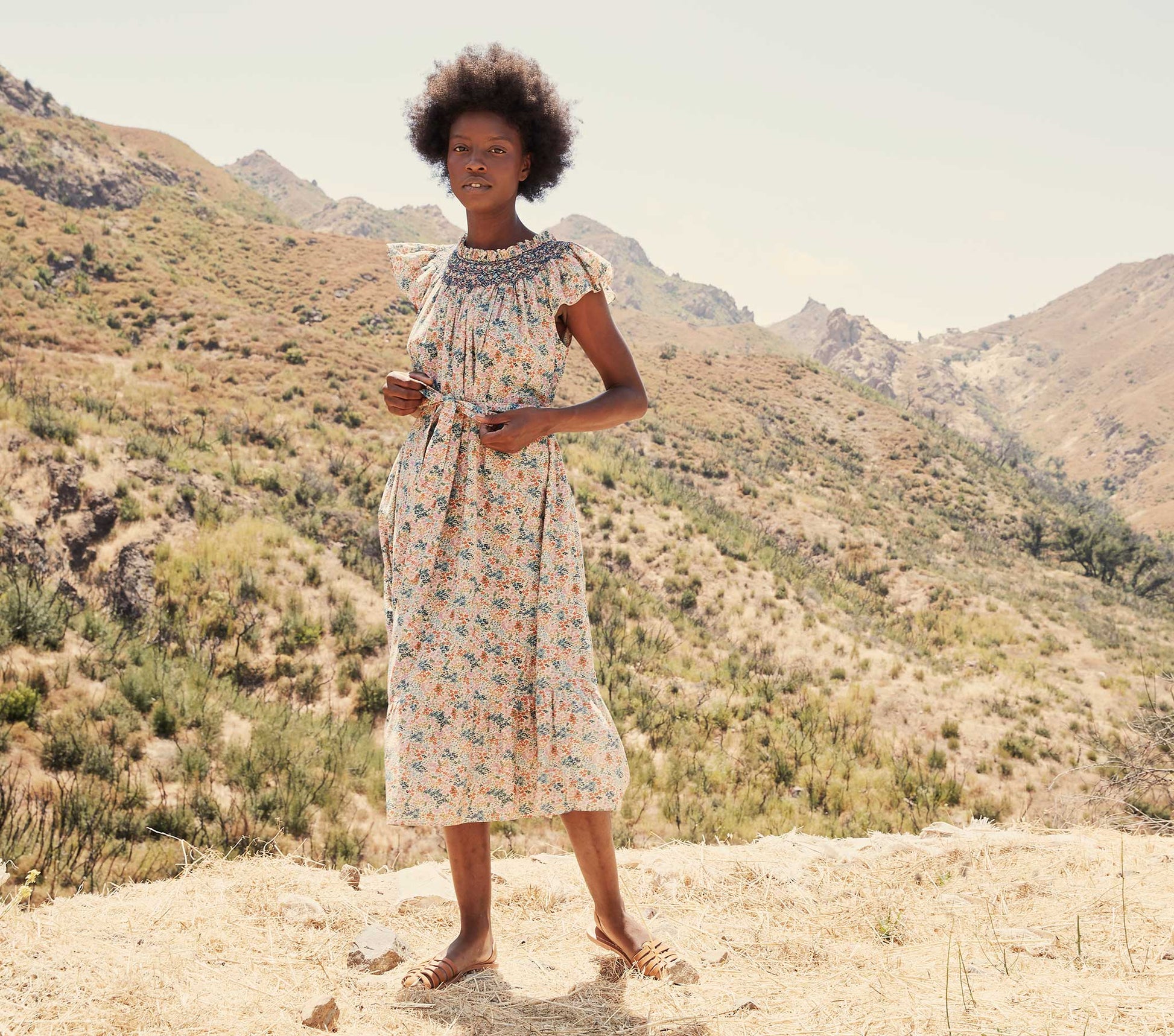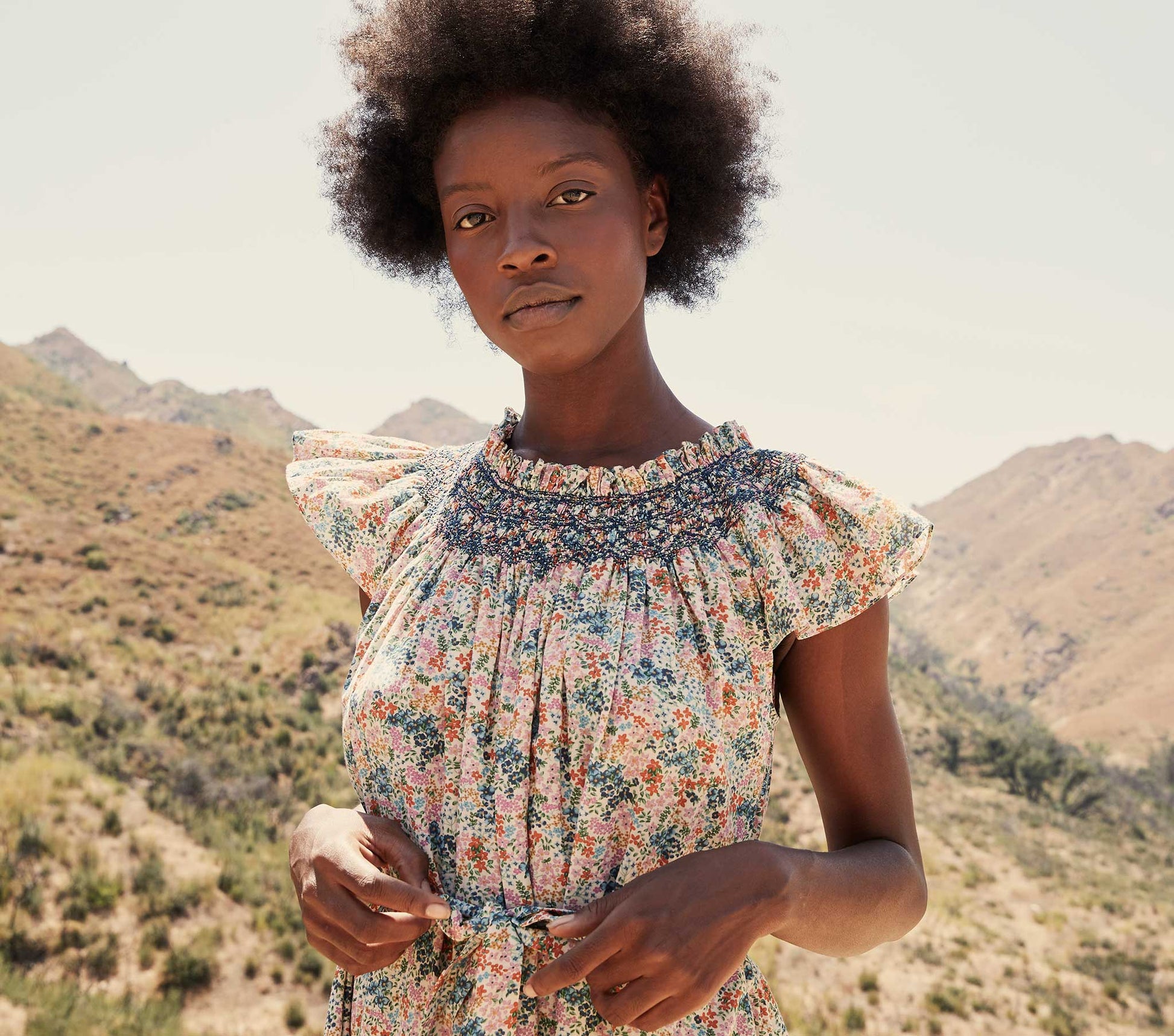 In an organic cotton/viscose blend, the DÔEN Violetta Dress is flutter-sleeved bliss. Geometric smocking at the neckline is elastic-backed for comfort and functionality, in contrasting navy to let the diamond and rosette pattern stand out. The A-line silhouette, finished with a single ruffle tier, flatters whether you belt it with the included self belt or simply let it drift around the body.