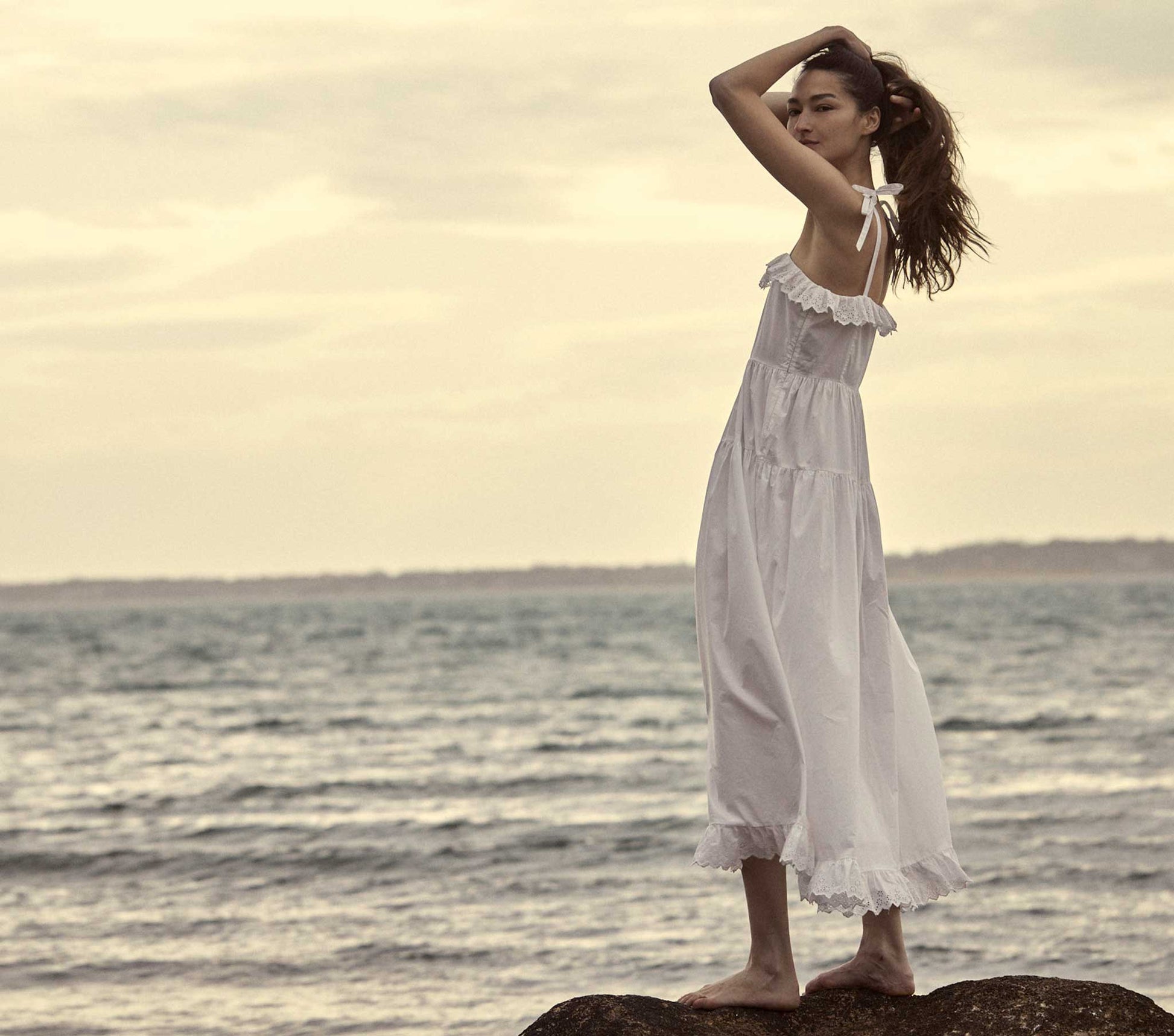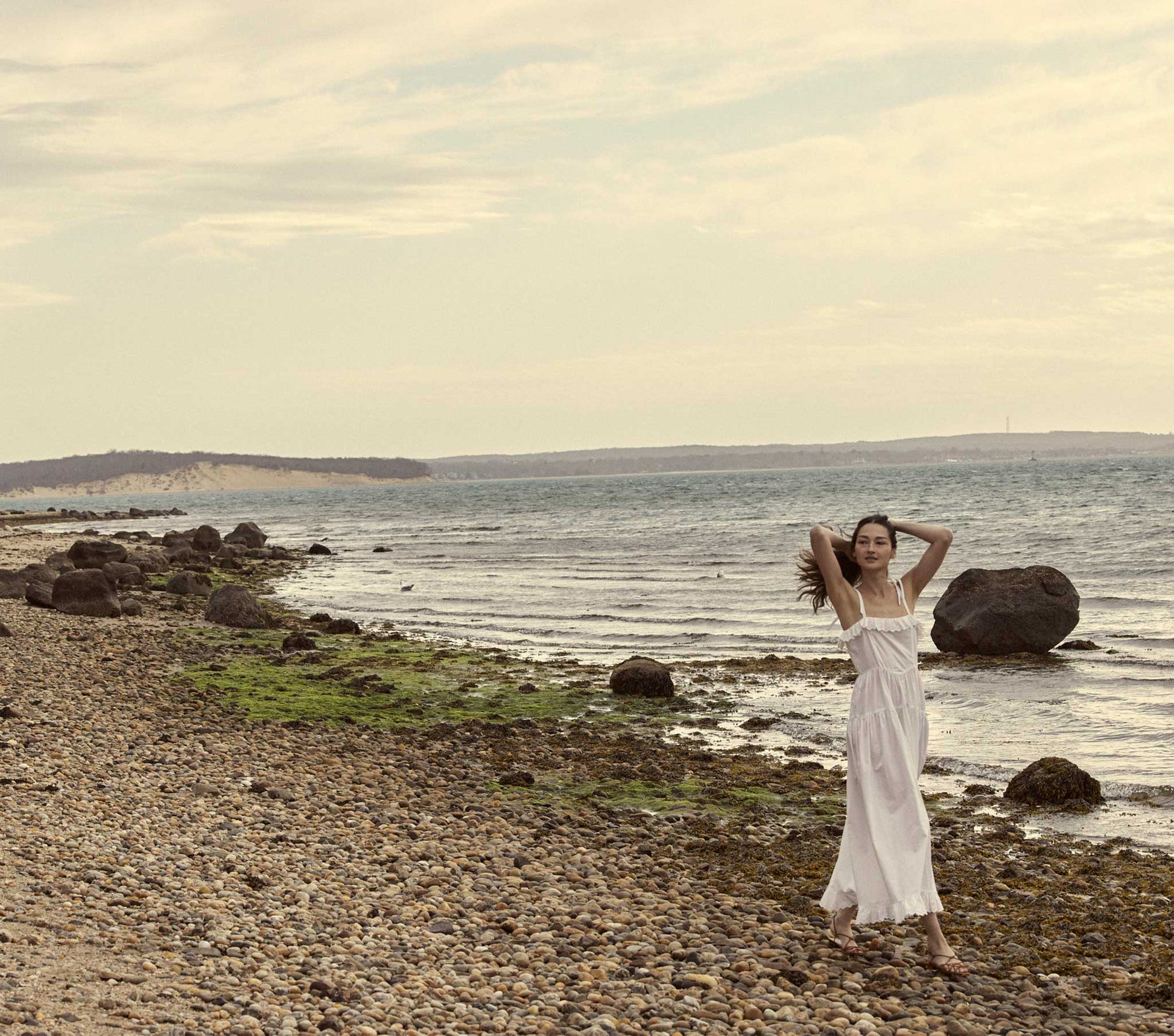 The Vita Dress is a delightful reimagining of a classic cotton poplin shift, elevated with the dreamiest details. Functional bows at the shoulders allow you to adjust the neckline to suit your mood. A whimsical embroidered eyelet ruffle is shirred into the top of the bodice. Princess seams lend structure to the bodice and waist, cinched in with a hidden zipper for ease. The top of the skirt panel is shirred into the bodice, with a second shirred-in tier just below the hips for fullness. Cascading to just below the ankle, the hem is adorned with a final eyelet embroidered ruffle, swaying with every step.