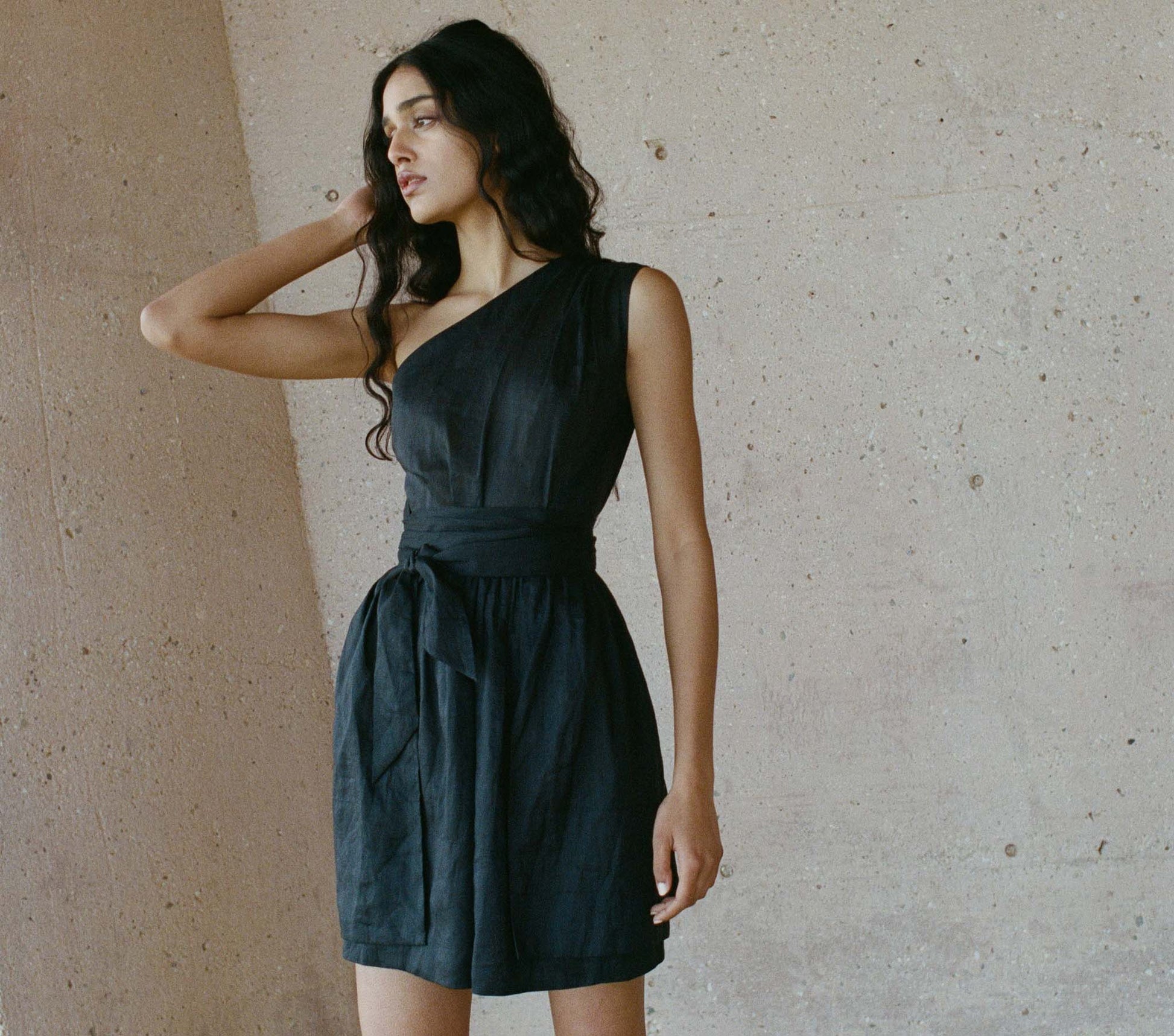 In crisp, lightweight ramie, the Yvonne Dress—a shortened version of our beloved Phoenix Dress—features an asymmetrical neckline, an adjustable waist tie, and an A-line skirt with a playful mini hemline.