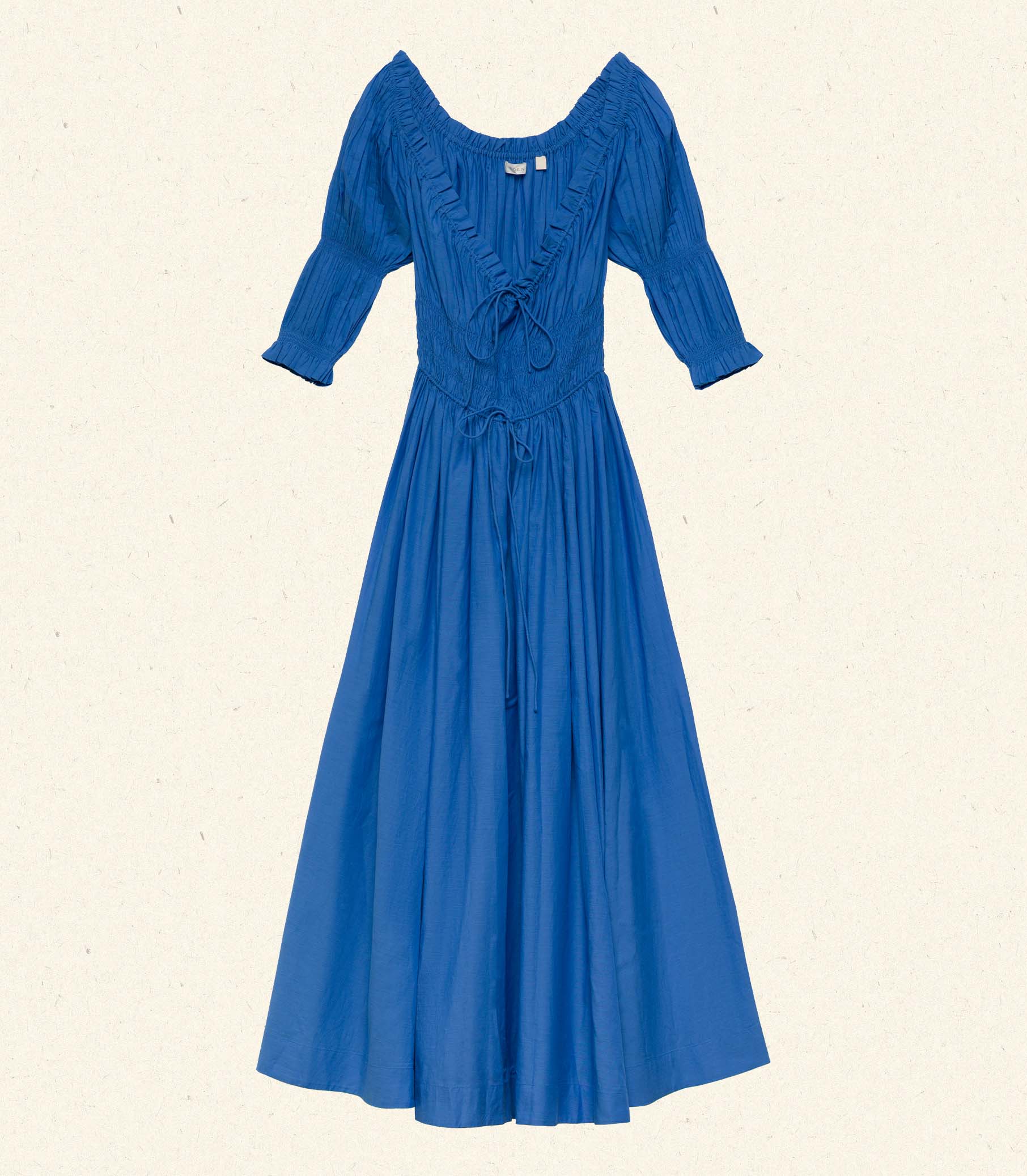 In a soft, lightweight blend of organic cotton and viscose, our beloved Ischia Dress—a Favorite Character that first made its debut in Spring 2021—features double-puffed sleeves and a scoop neckline adorned with petite ruffles and a functional center tie. A smocked bodice with an adjustable waist tie gives way to an ankle-grazing A-line skirt.