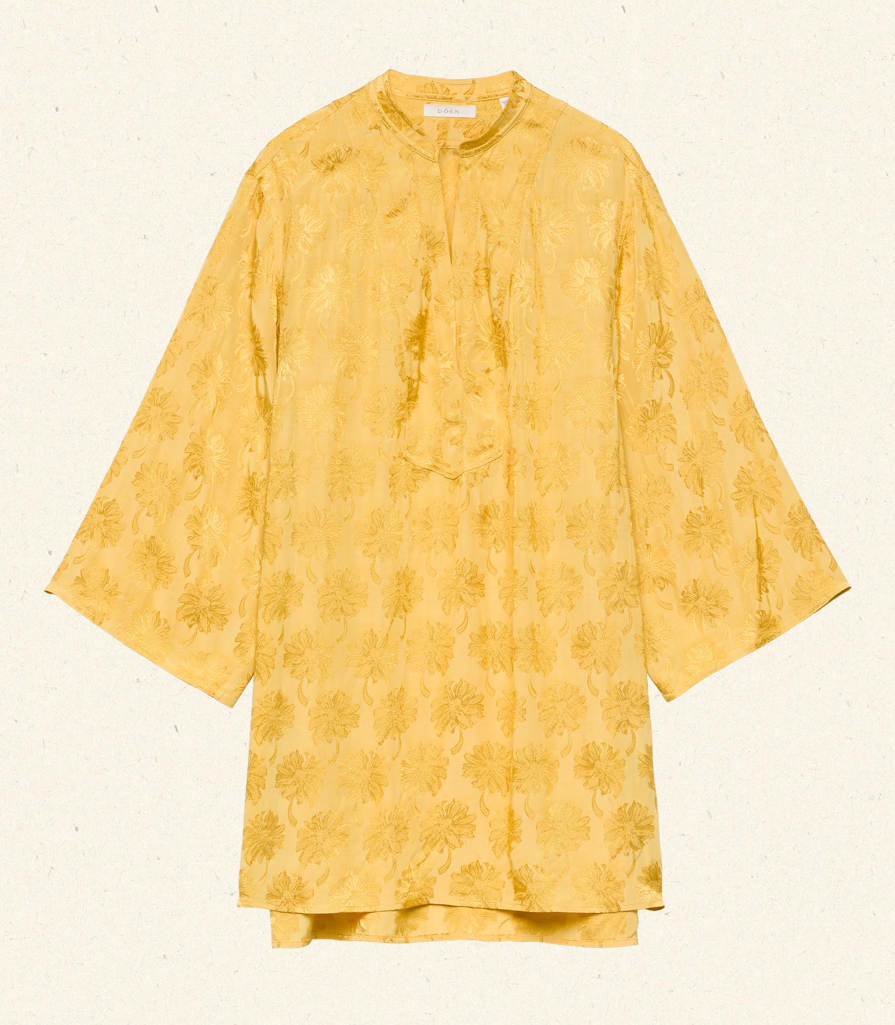 In floral jacquard reminiscent of a vintage tunic from our content team's personal collection, the Leona Dress features a high neck with a Nehru collar, three-quarter-length bell sleeves, and a gently flared A-line silhouette. The Leona comes with a matching detachable scarf that can be tied as a belt for a cinched look.