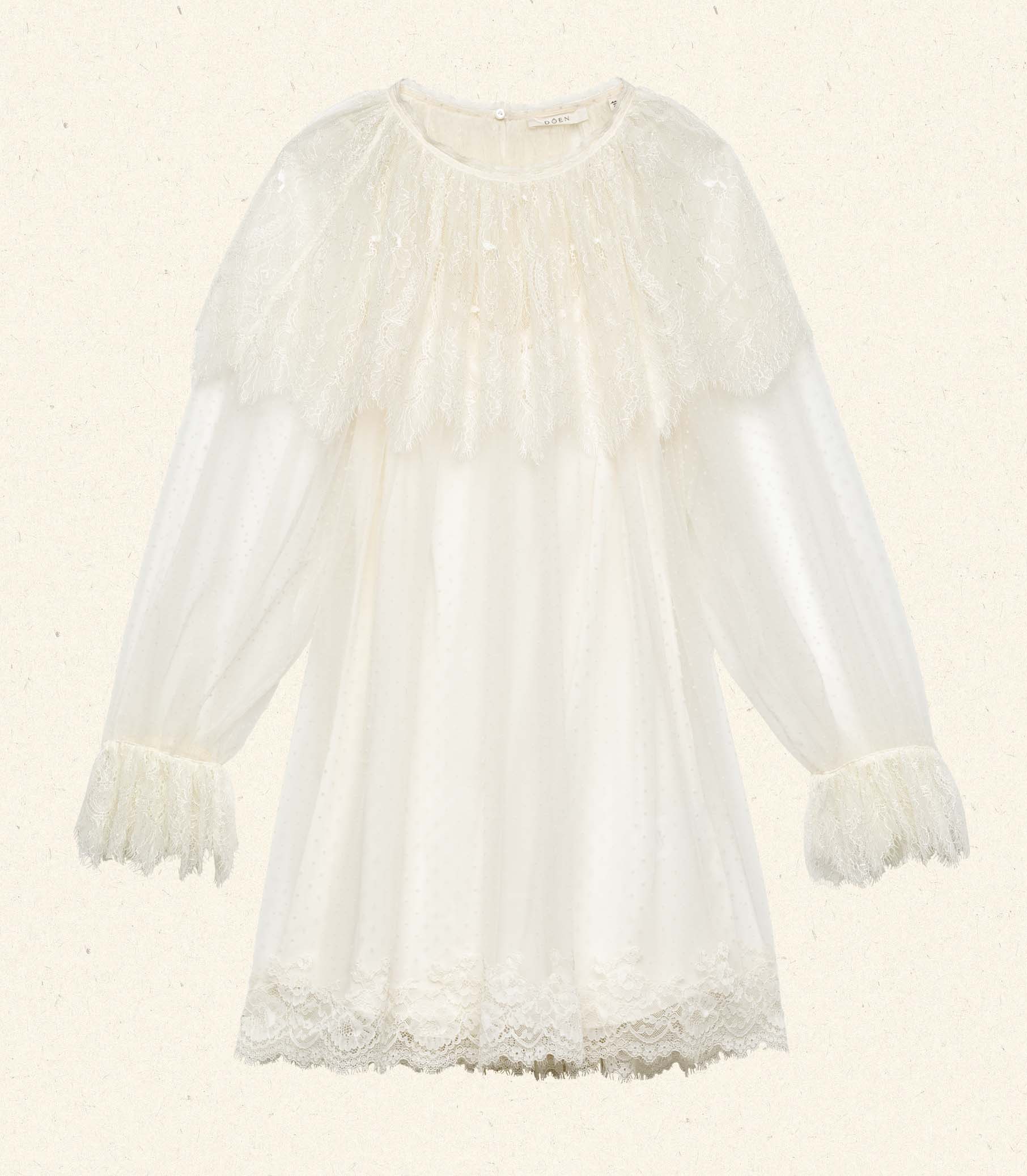 The ‘70s-inspired Lilith Dress is a mini dress in our signature flocked dot tulle, complete with a fully attached capelet. It features a high neck, breezy silhouette, and bracelet-length sleeves. Intricate lace trim adorns the cape, sleeves, and hem, and a keyhole with a mother-of-pearl button fastens at the inside of the back neck.