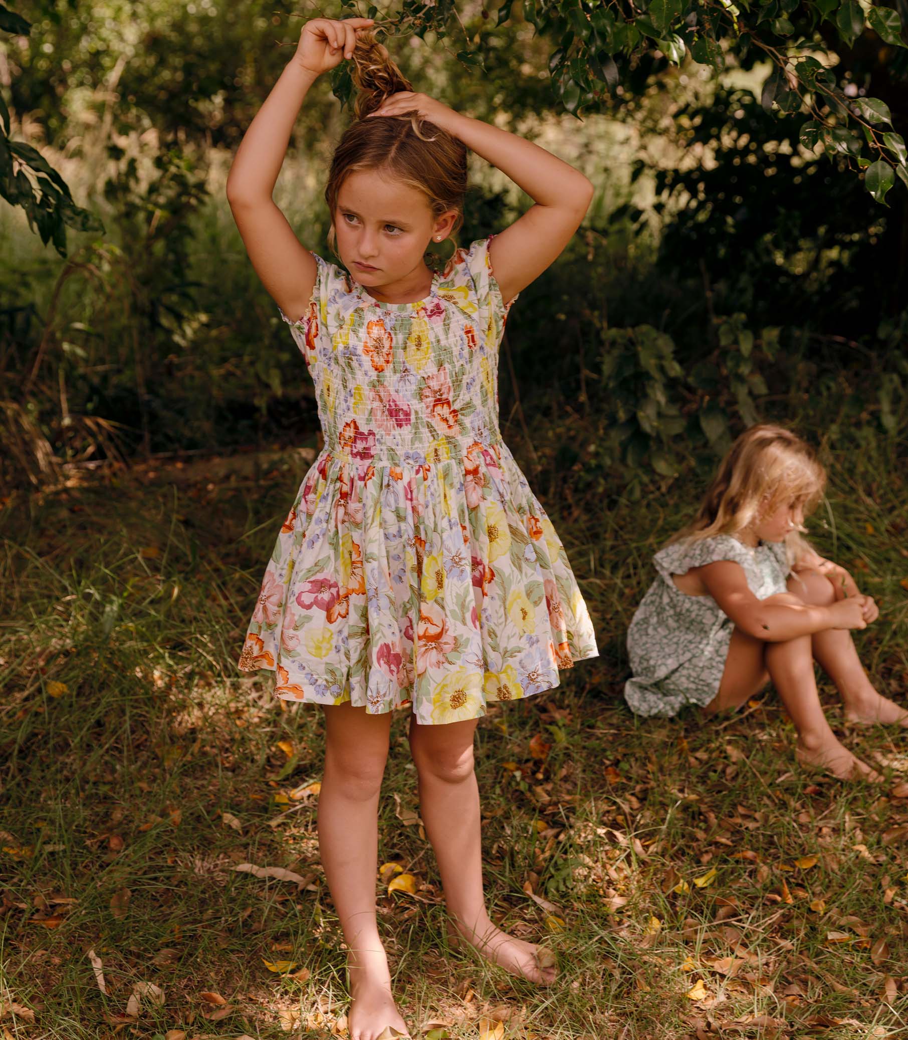 Crafted from the softest organic cotton voile, the Mae Dress is adorned with our colorful Anemone Bloom, featuring a round neckline with a decorative bow, short puffed sleeves, and smocking at the bodice. A fully lined skirt falls just above the knee, and elastic lends give to the sleeves, neckline, and waist.