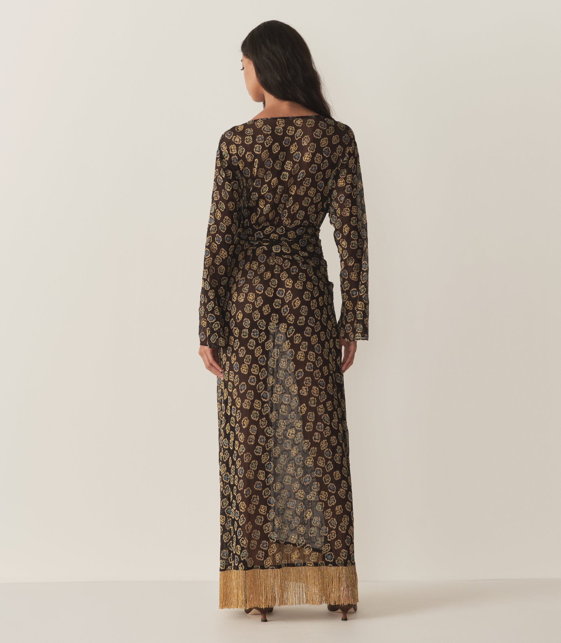 Crafted from silk crinkle chiffon, the DÔEN Heirloom Monique Dress is an extra-special keepsake and favorite of our co-founders, Margaret and Katherine. With a ‘70s-inspired caftan silhouette, this treasure is graced with our Joni Floral, and each floral motif is finished with intricate gold lamé embroidery. Dramatic flared sleeves fall to the wrist while stitching at the center front neckline lends shape. A floor-sweeping hemline is trimmed with hand-beaded fringe. A matching belt can be tied to cinch the waist—or worn as a scarf.